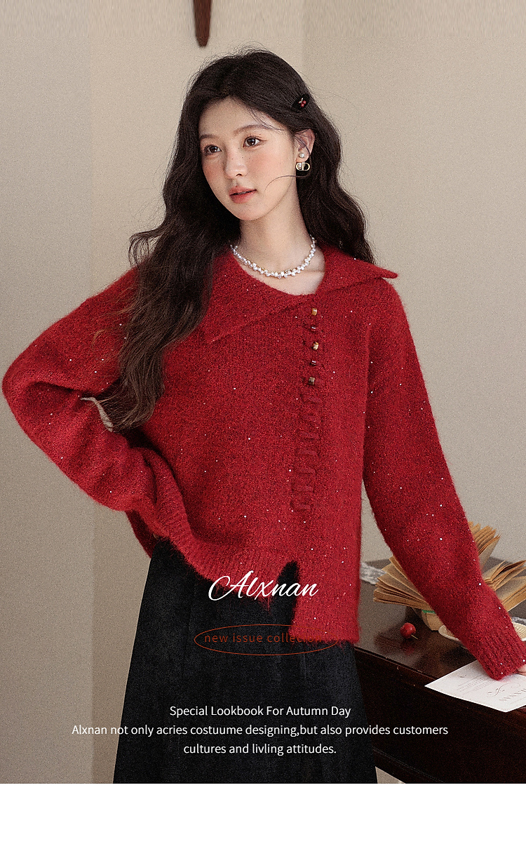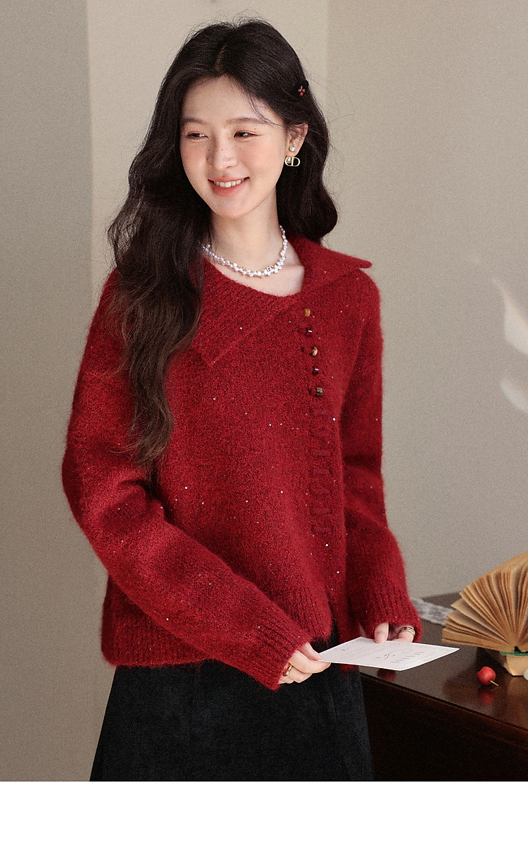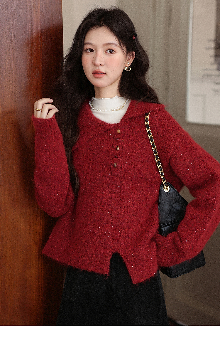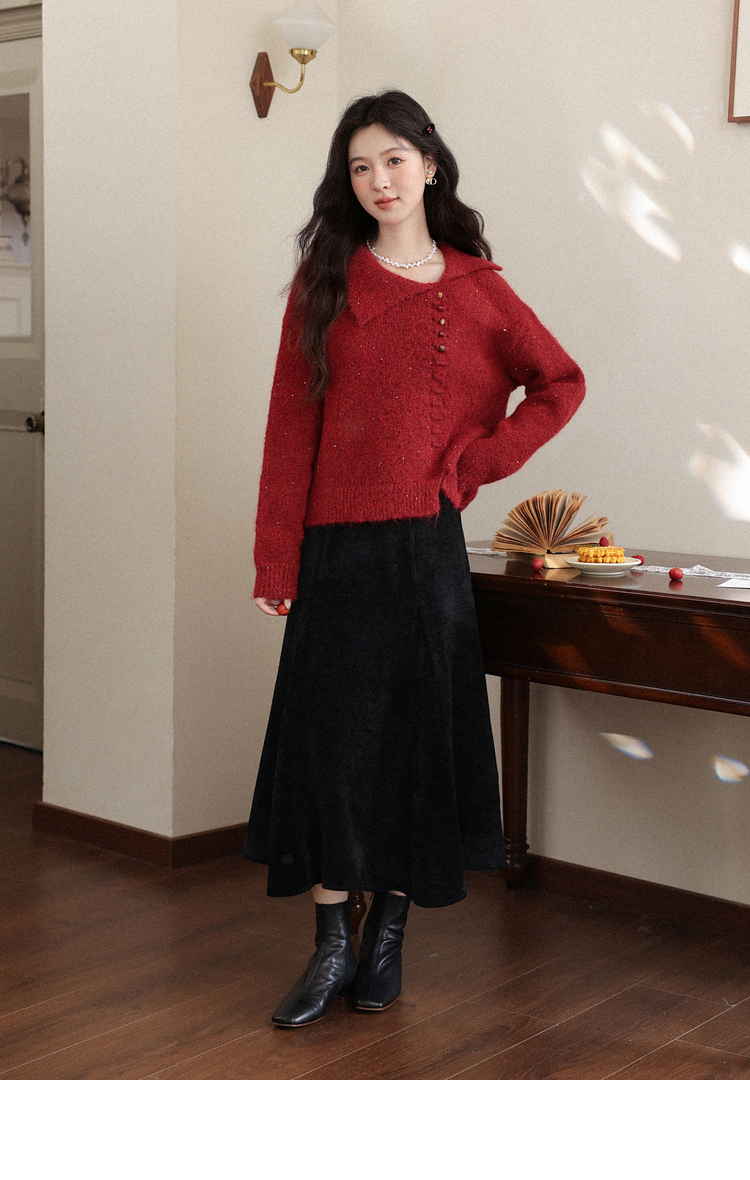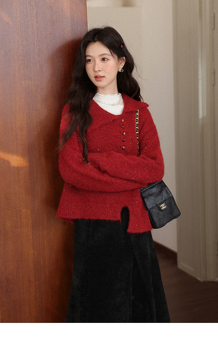 鹿向南「港岛暮色」红色翻领毛衣女秋冬季时尚外搭宽松长袖针织衫