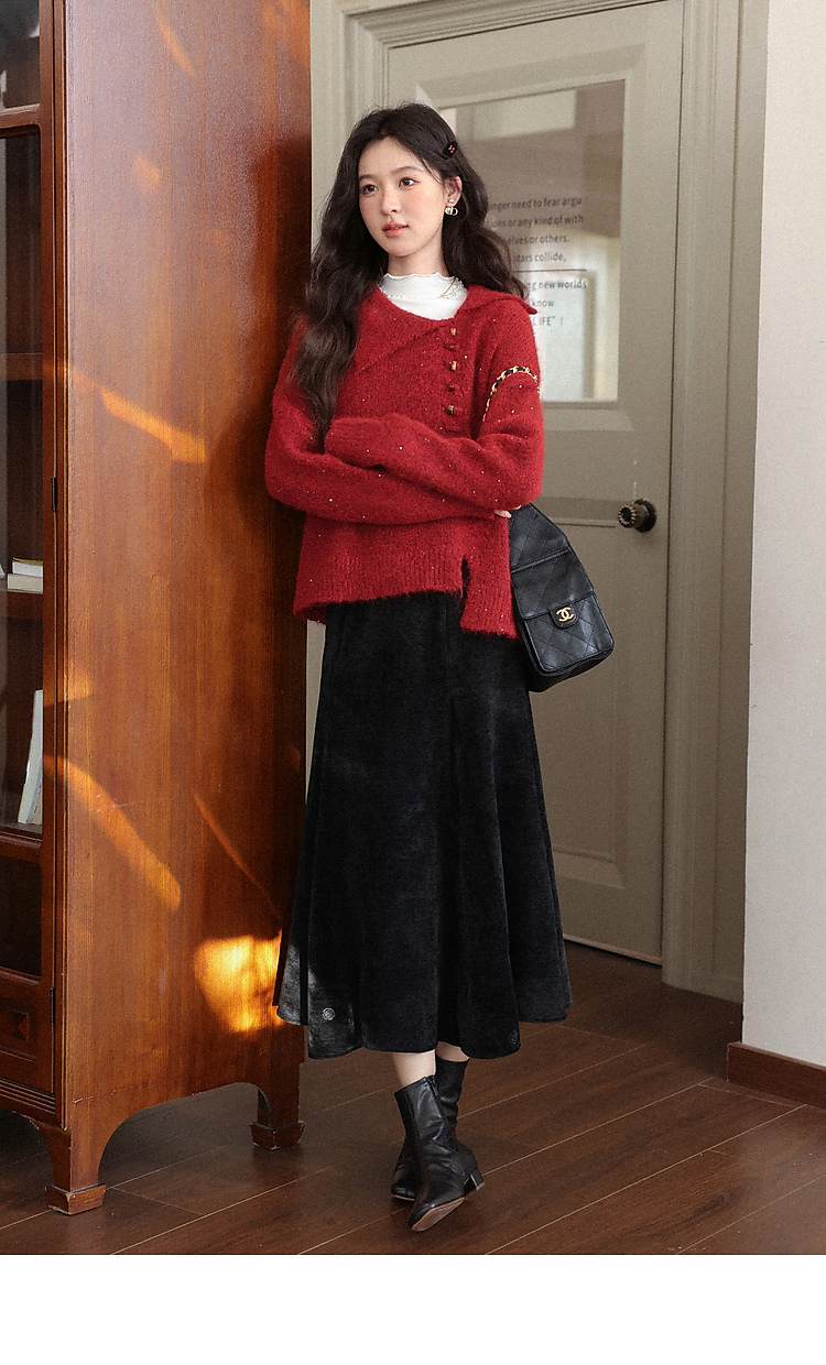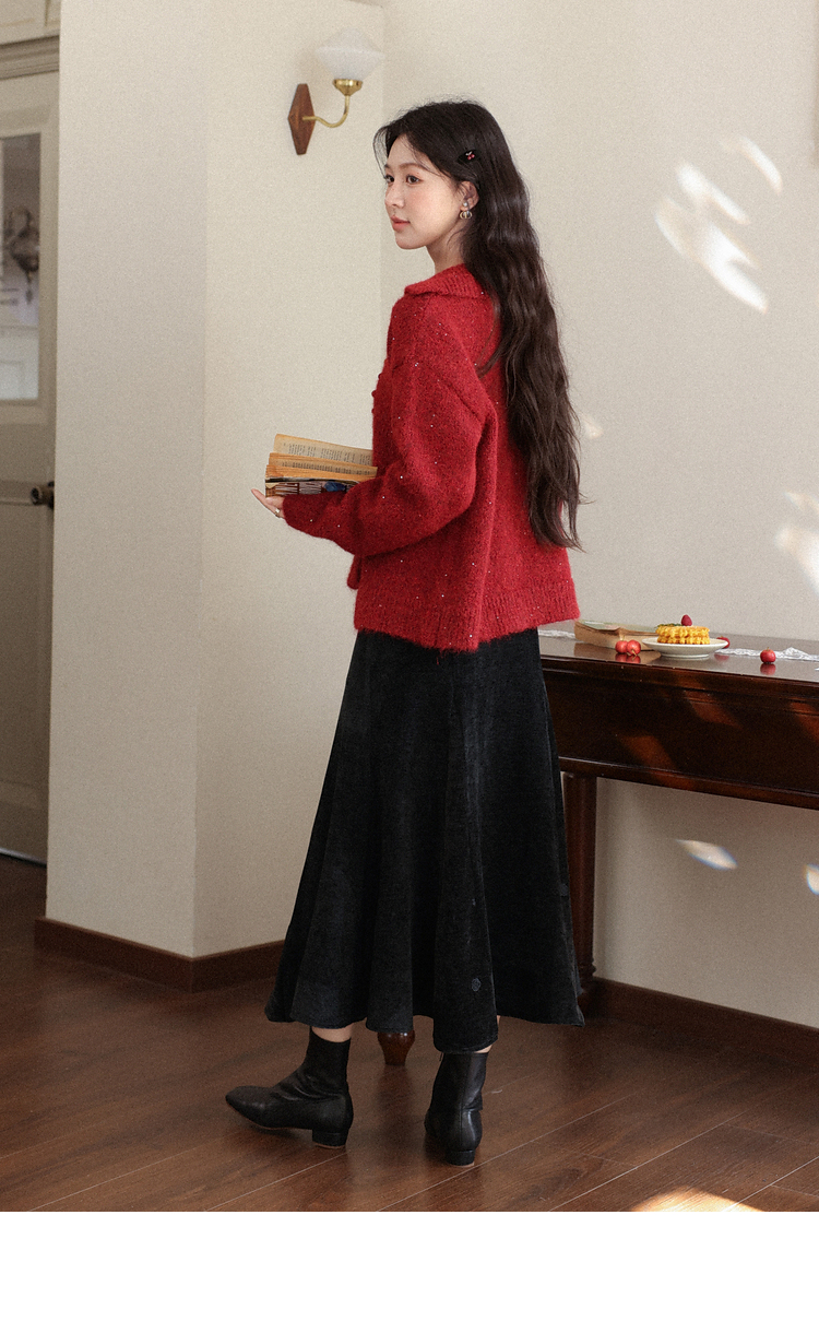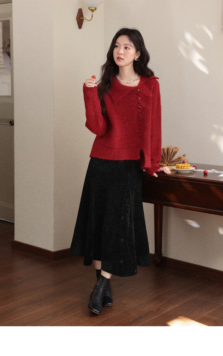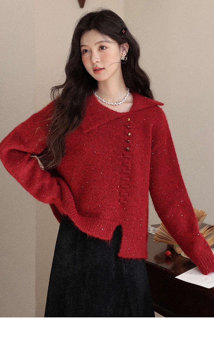 鹿向南「港岛暮色」红色翻领毛衣女秋冬季时尚外搭宽松长袖针织衫