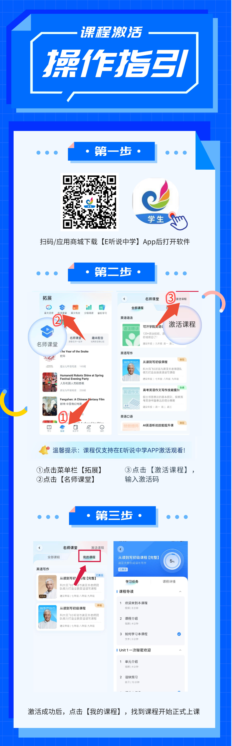 2、打开App【E听说中学】,点击菜单栏【拓展】-【名师课堂】,点击右上角【激活课程】,输入激活码;