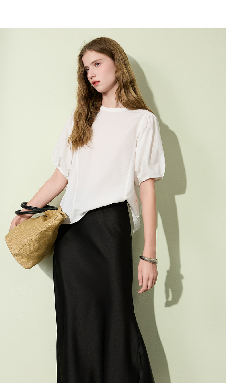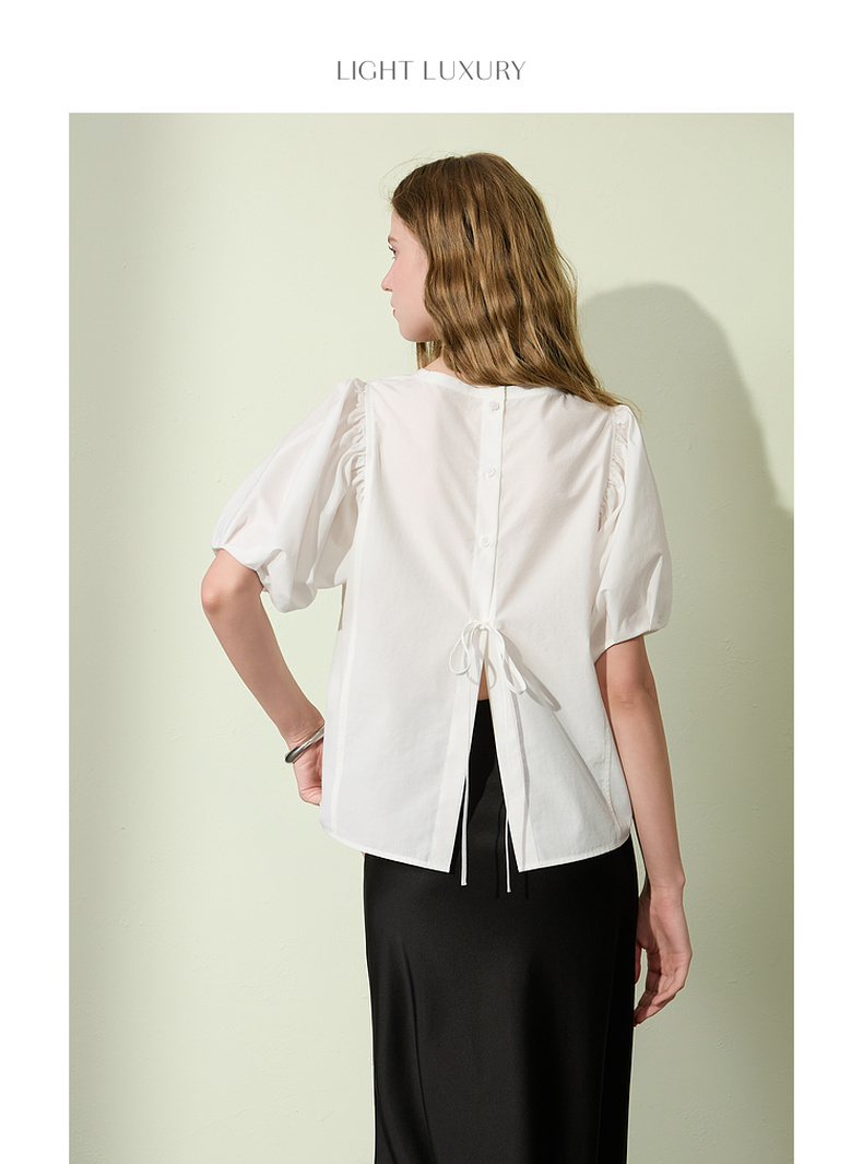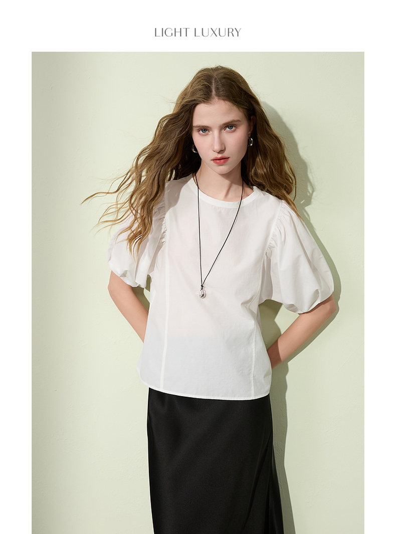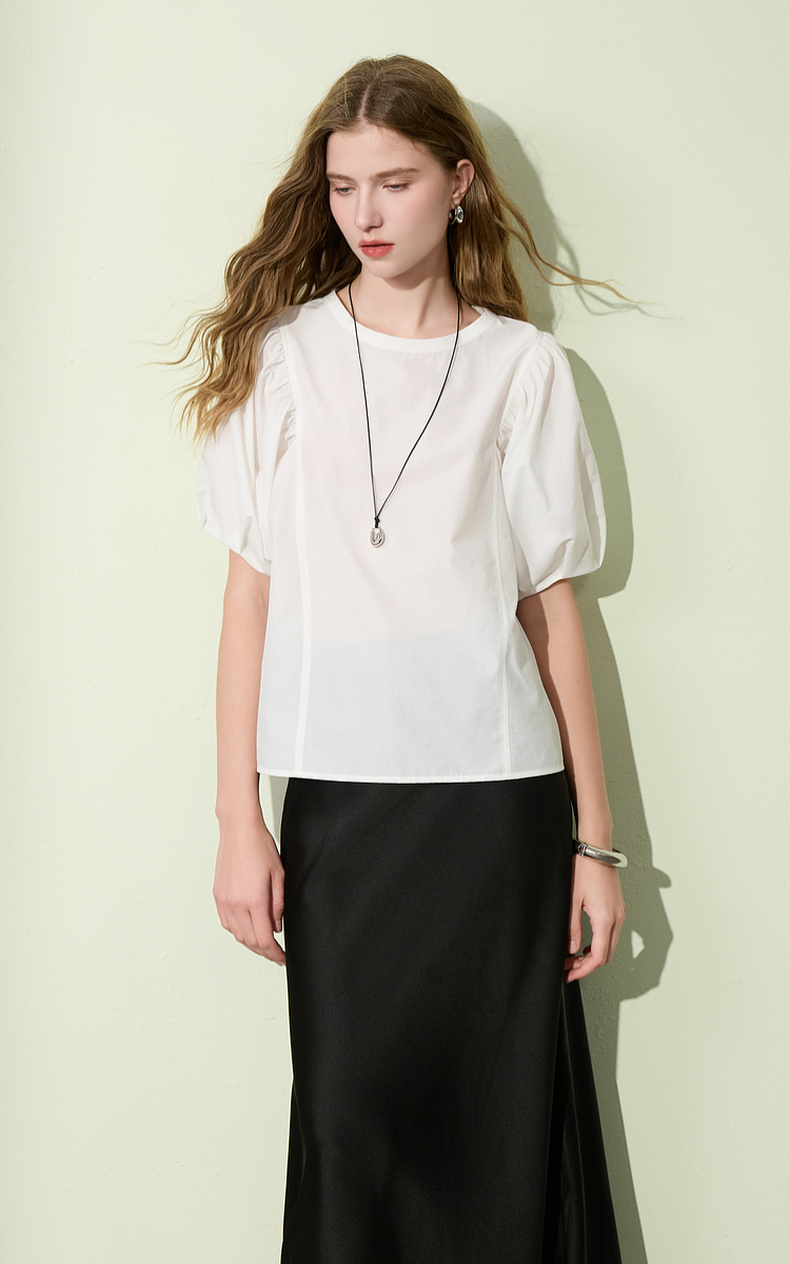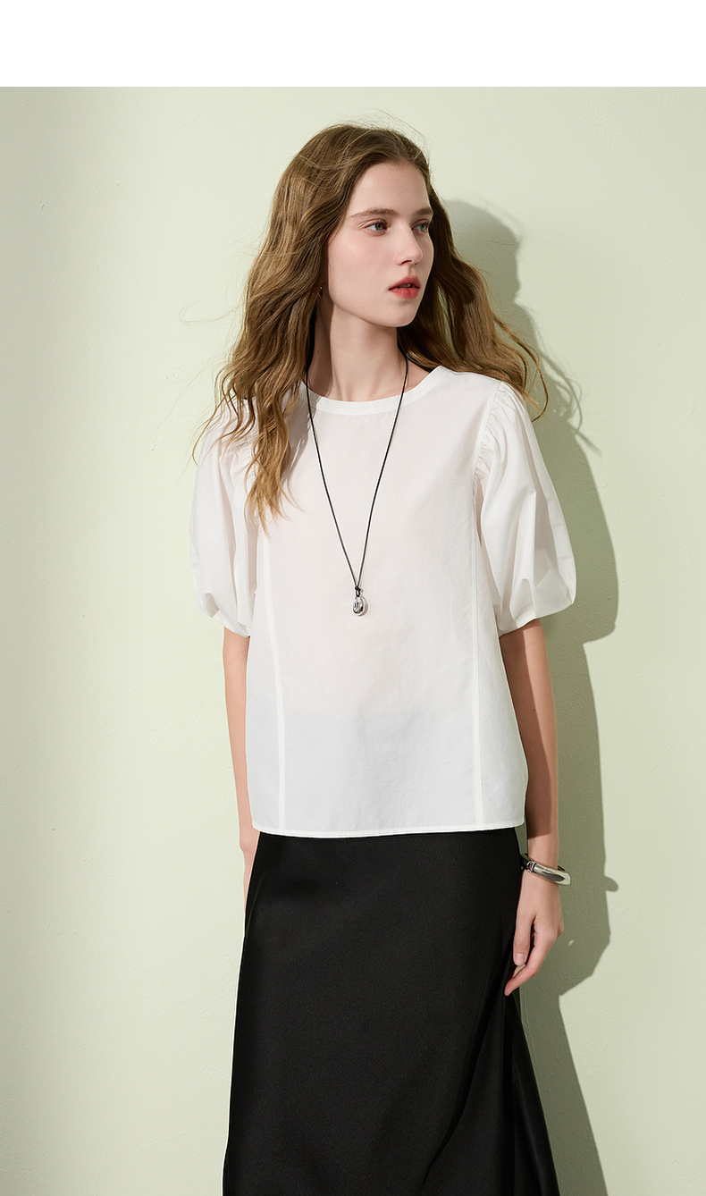 三彩2025夏季新款泡泡袖圆领白衬衫上衣宽松衬衣小衫简约S