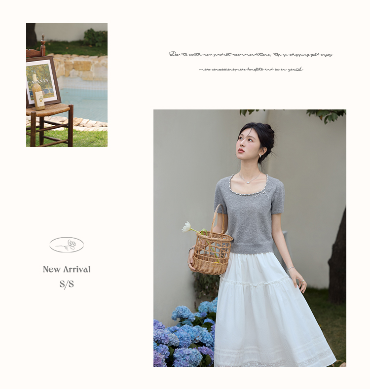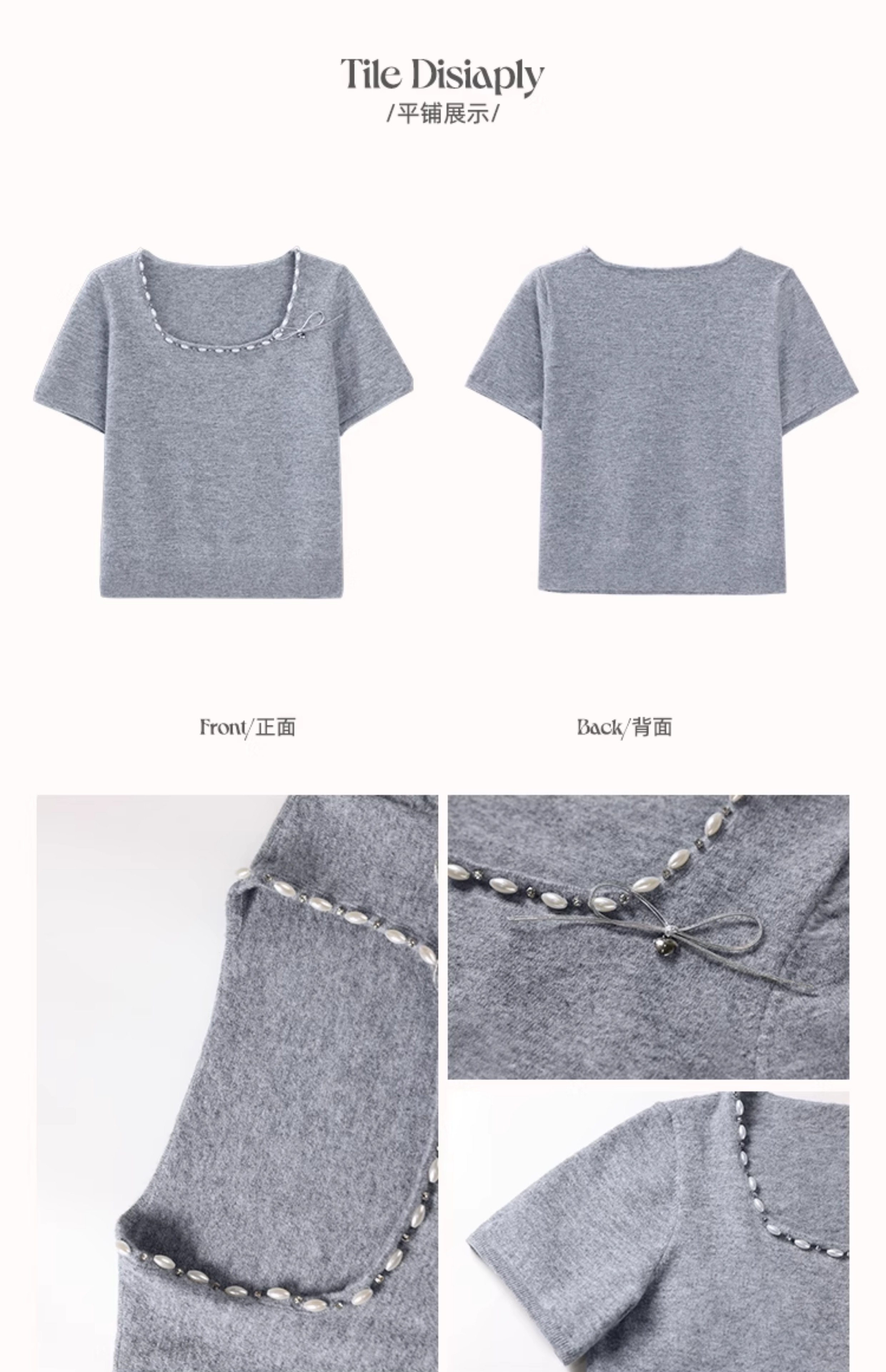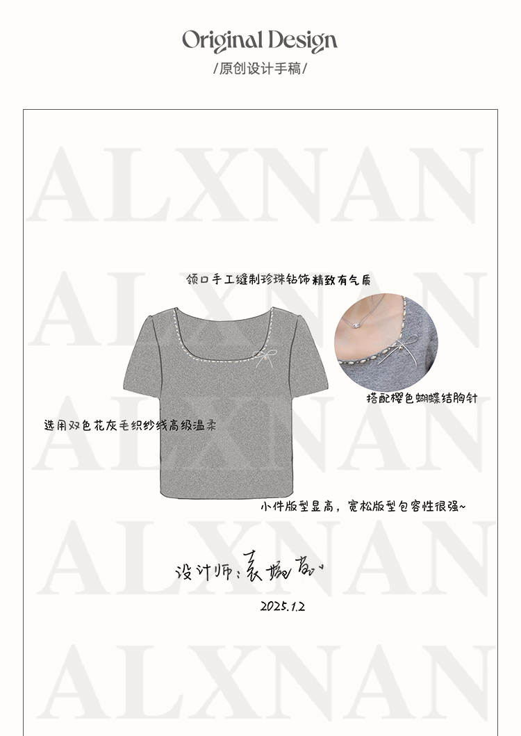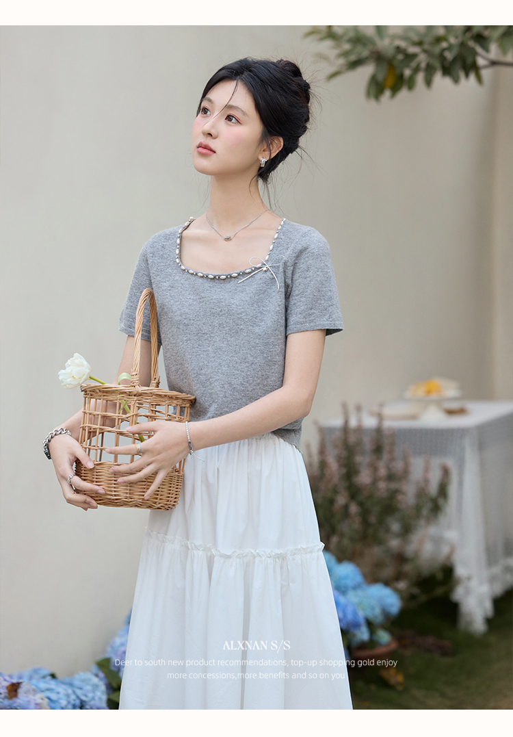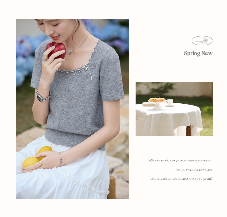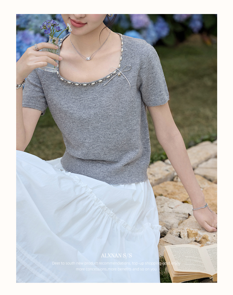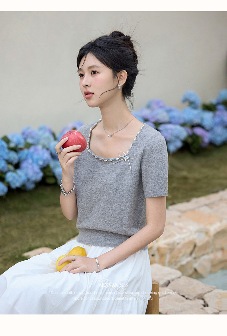 鹿向南 「烂漫际遇」法式气质短袖t恤女夏季别致设计感灰色针织衫