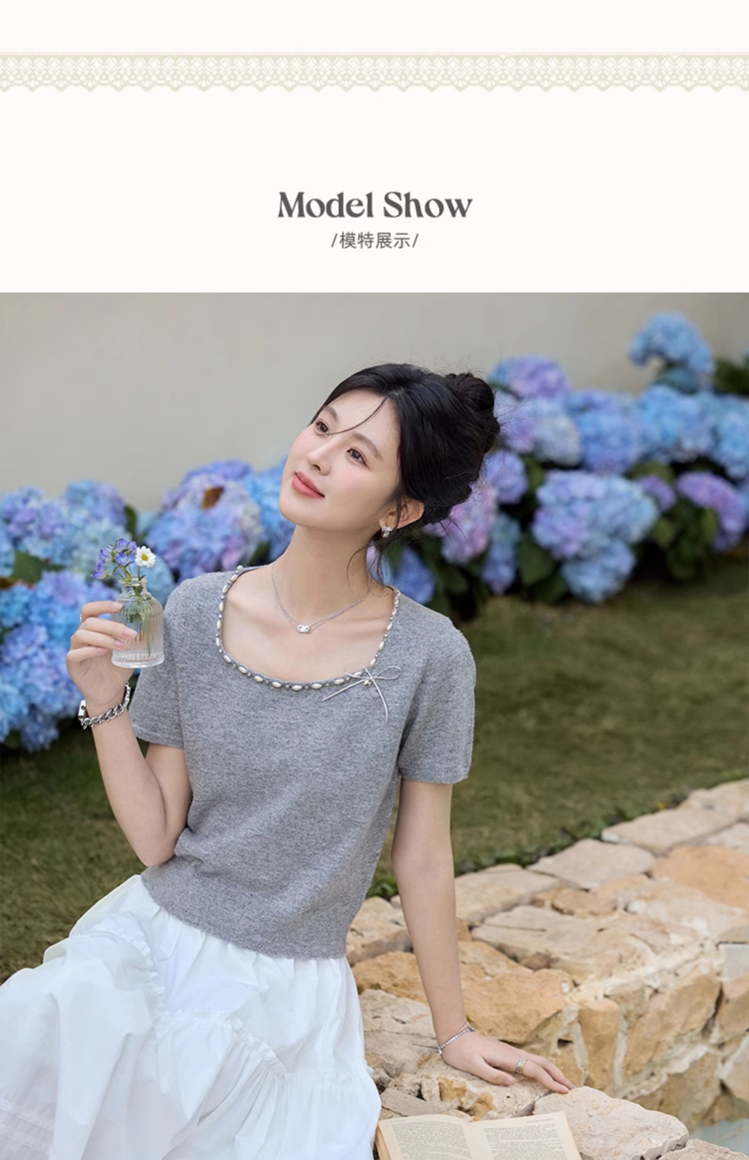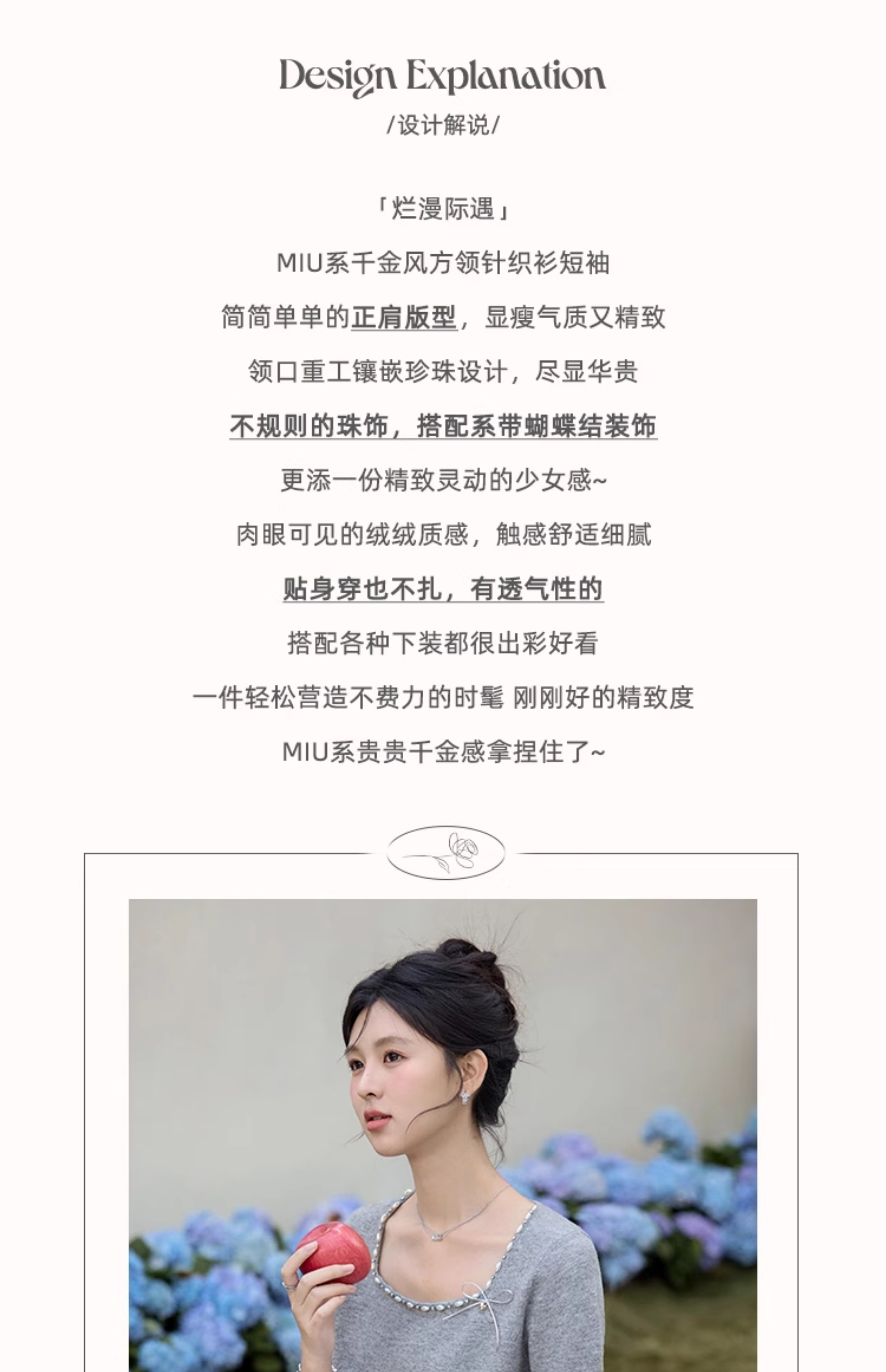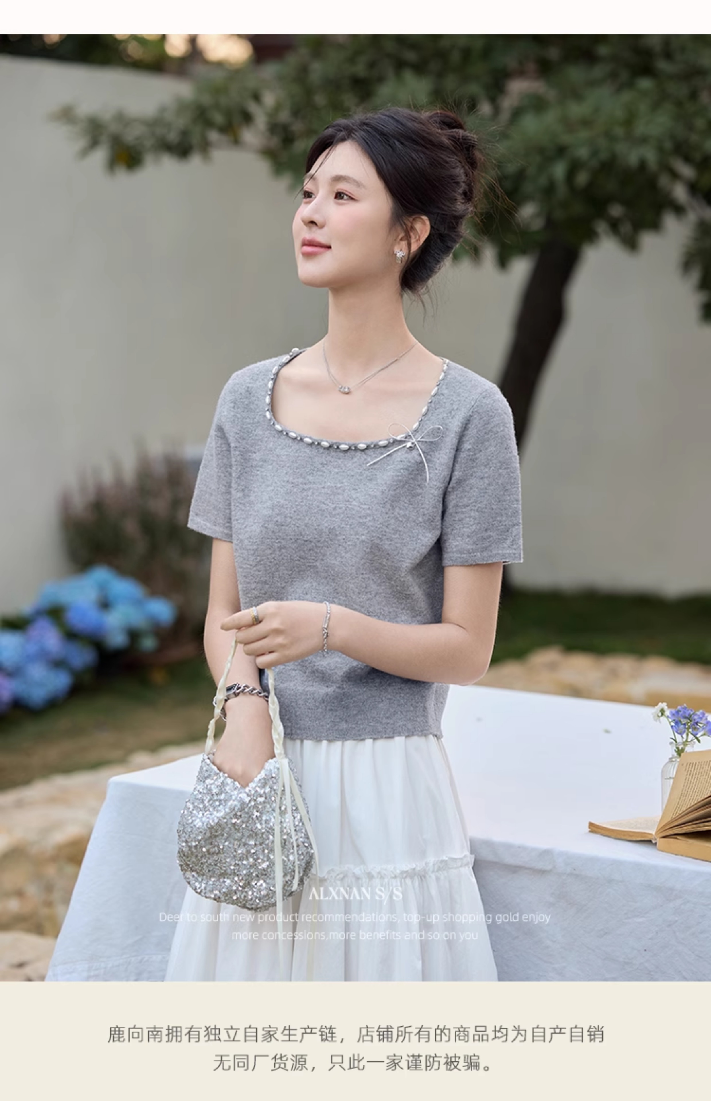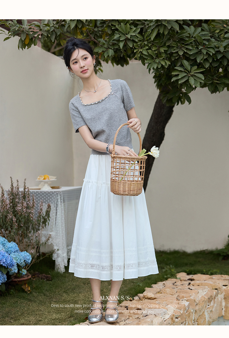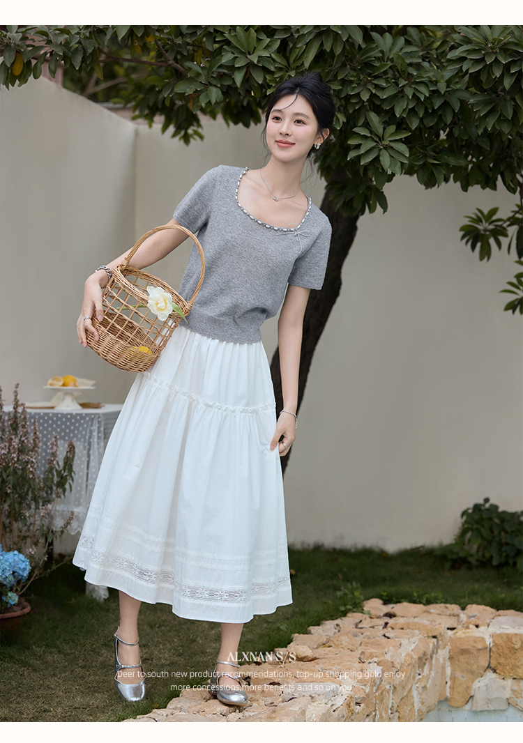 鹿向南 「烂漫际遇」法式气质短袖t恤女夏季别致设计感灰色针织衫
