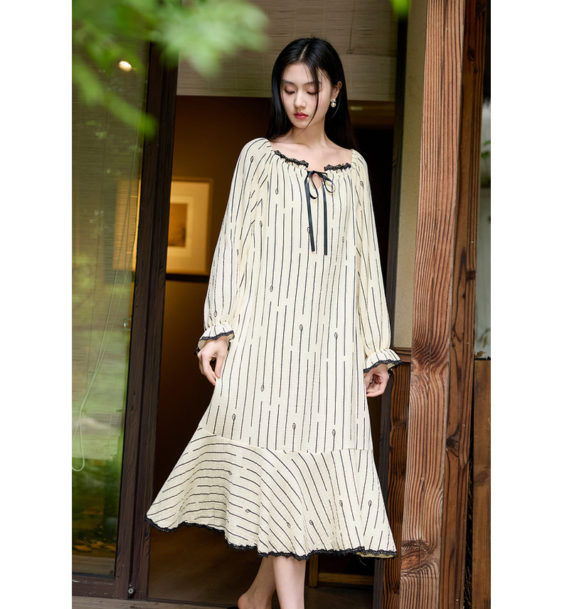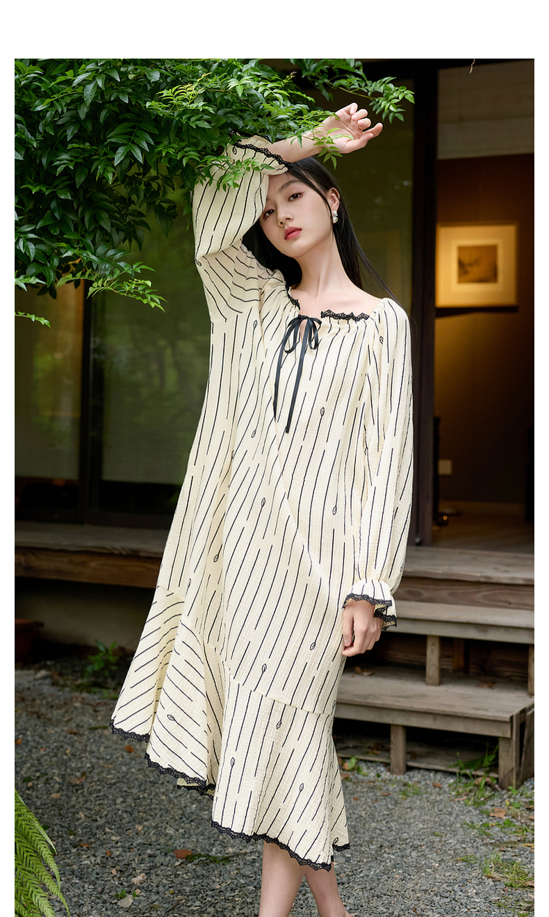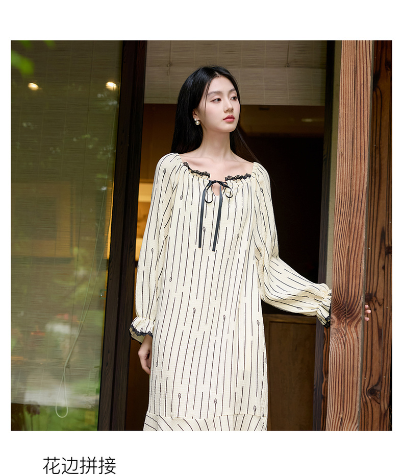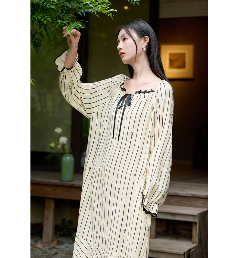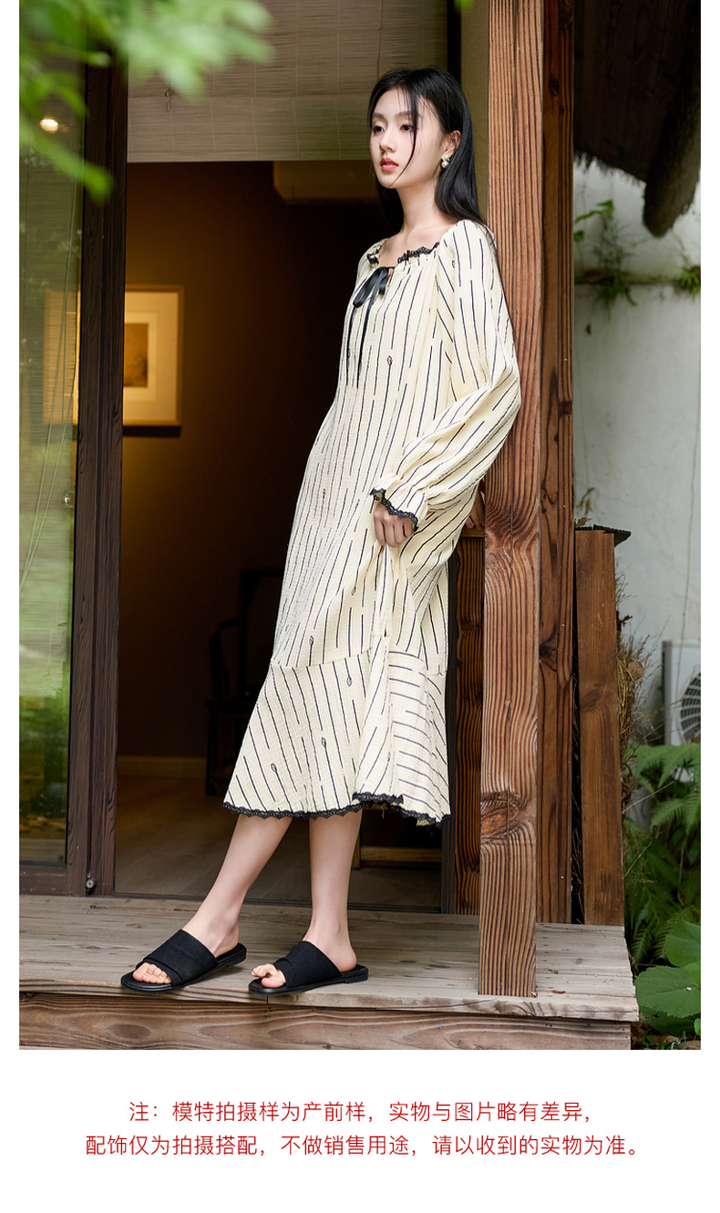 【100棉】三彩2025秋季新款家居服睡裙条纹方领长裙可外穿M