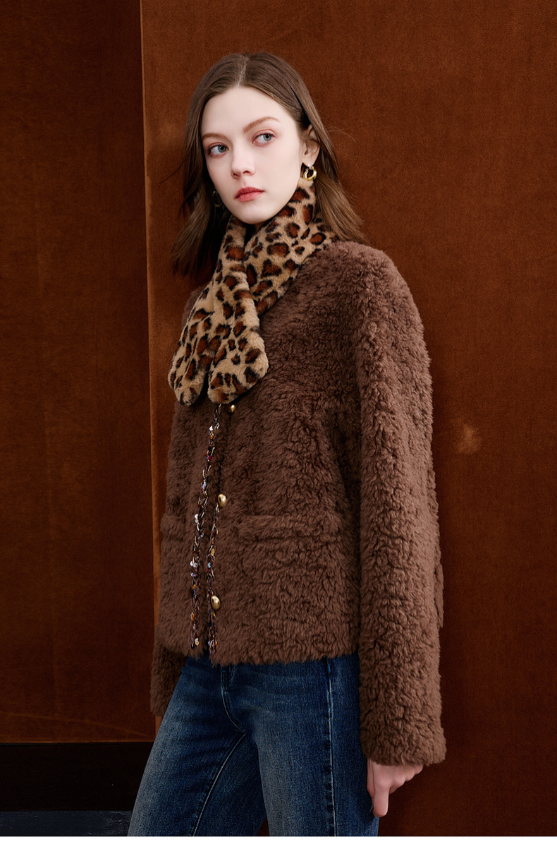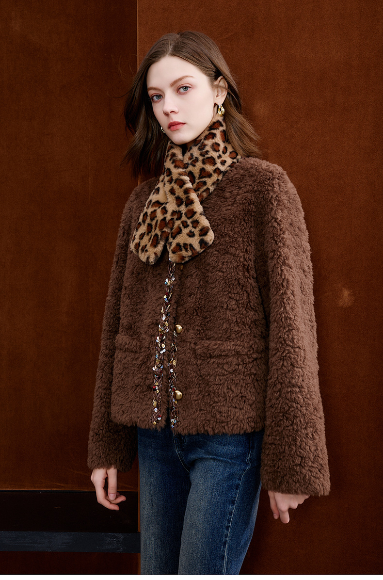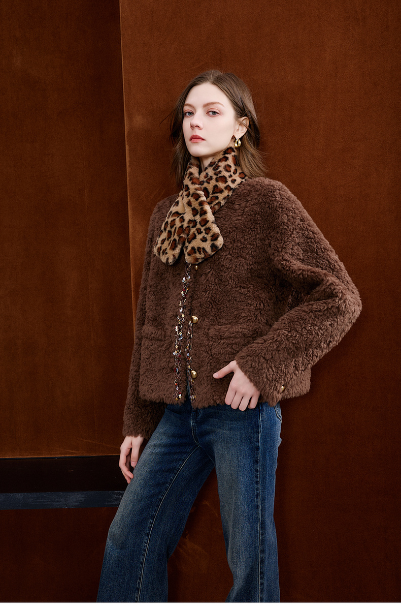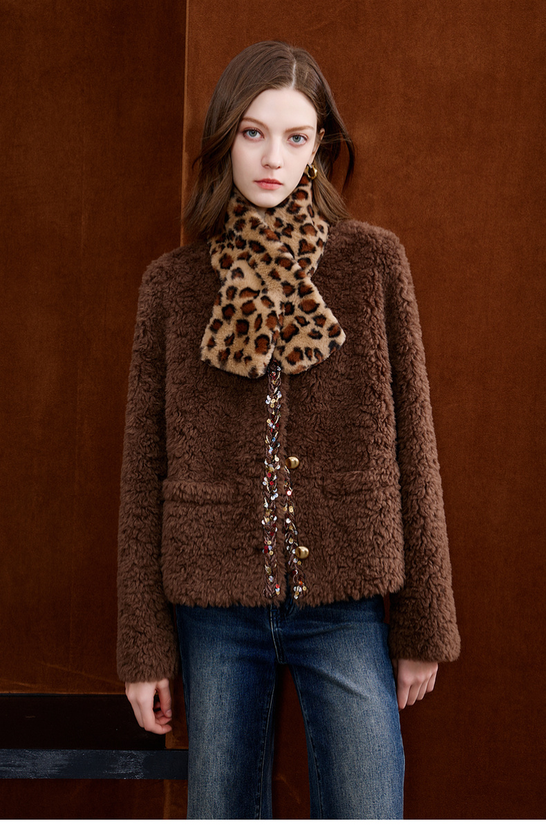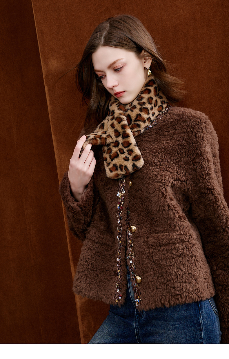 三彩2026新款复古豹纹毛绒围巾小围脖毛领保暖女交叉野性个性小众