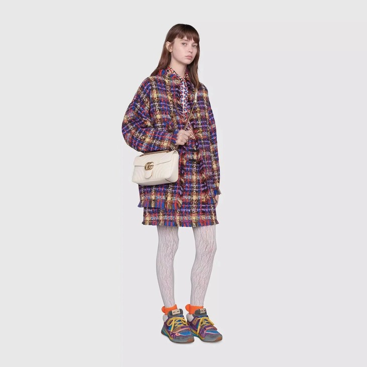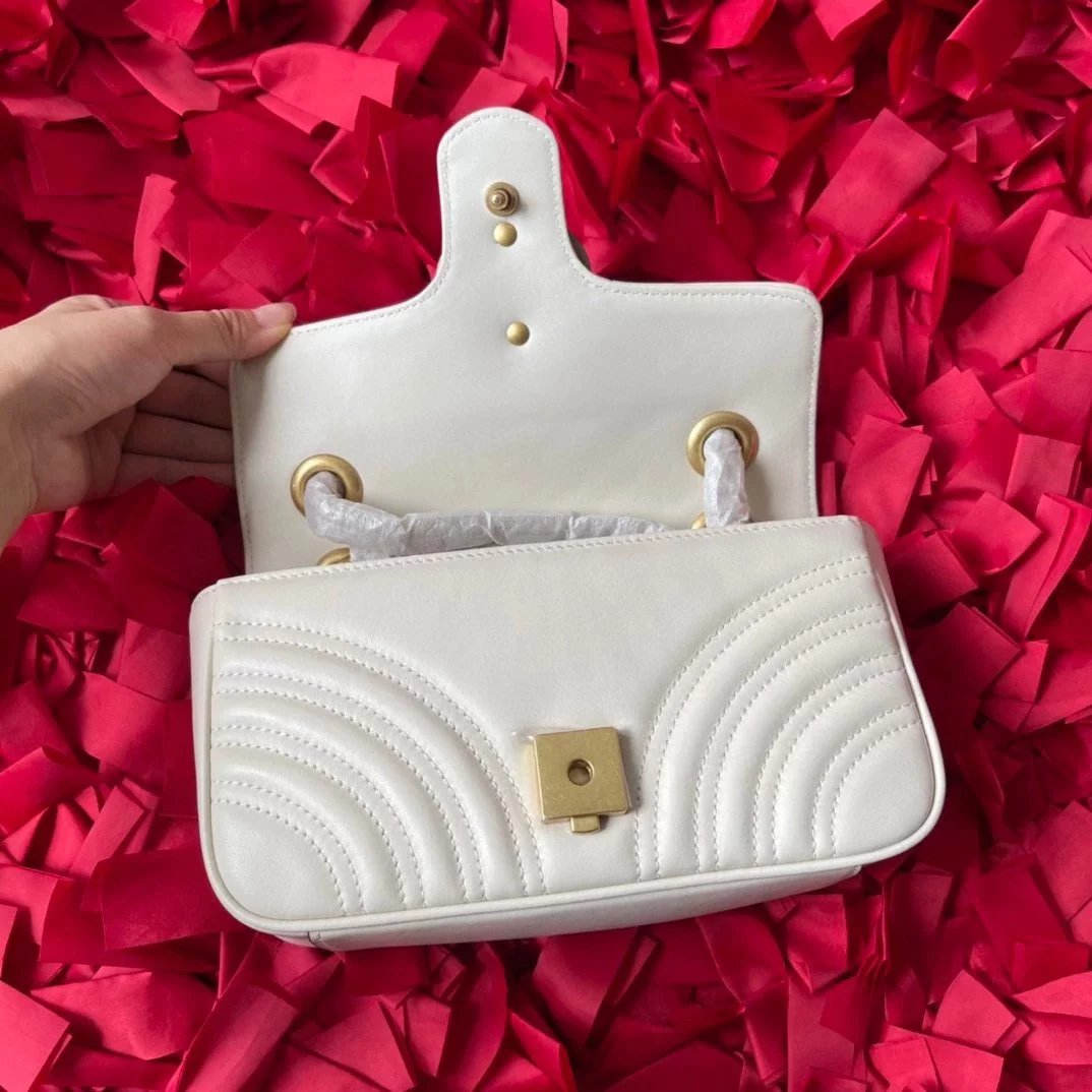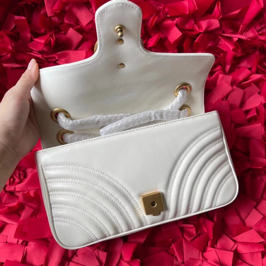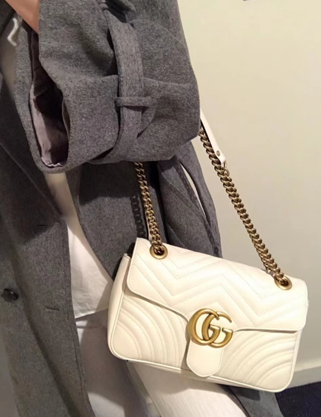 原厂皮意大利创作443497GG Marmont链带肩背包采用颇具结构感的柔软造型和大号翻盖封口配以双 G 金属配件可滑动链条肩带有多种背法.可在肩背和手提之间自由转换采用波浪纹绗缝皮革背面配以 GG 标志黑色波浪纹绗缝皮.(滑动链条可调整为约55 厘米的肩带或长约30厘米的顶部手提带)细纤维衬里.外观类似麂皮!尺寸:26-22-16.5