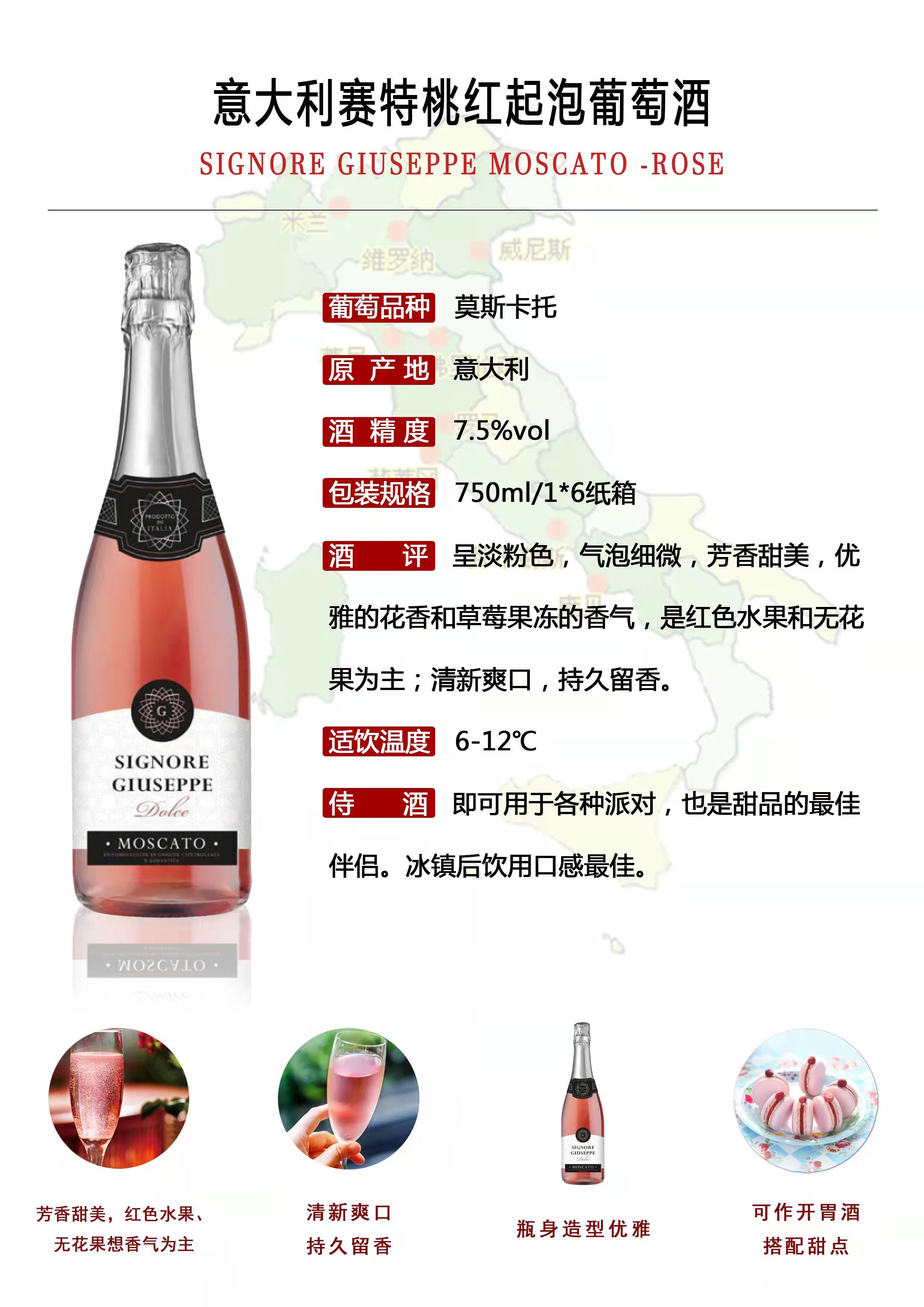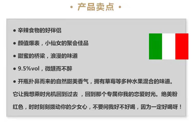 呈淡粉色,气泡细微,芳香甜美,优雅的花香和草莓果冻的香气,是红色水果和无花果为主;清新爽口,持久留香。即可用于各种派对,也是甜品的最佳伴侣。冰镇后饮用口感最佳。