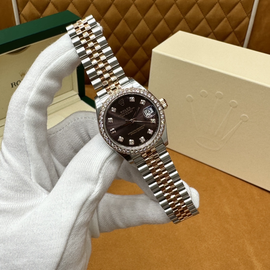 蚝式恒动日志型 31腕表蚝式精钢款,搭配镶钻巧克力色表盘及纪念型(JUBILEE)表带。 采用原版定制2236自动机械机芯,极其稳定,抗震力强。904L精钢表带,质感拉满 推拉顺滑 表壳及表耳两侧折射出淡雅光泽,令31毫米蚝式表壳的轮廓更突出。搭配巧克力色表盘,在奢华中尽显优雅精致。 对版的日历字体,防反光凸透式放大日历窗,每个数字打磨精细,方便查看~高难度的龟壳外观开启方式轻易,锁扣紧密,戴起来非常踏实!防刮损蓝水晶玻璃,生活防水。 尺寸:31mm