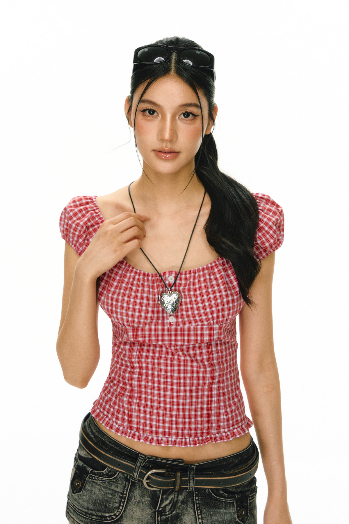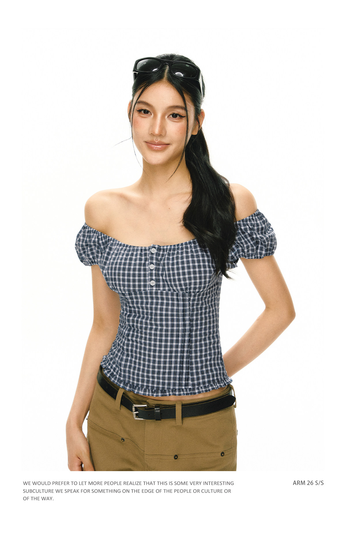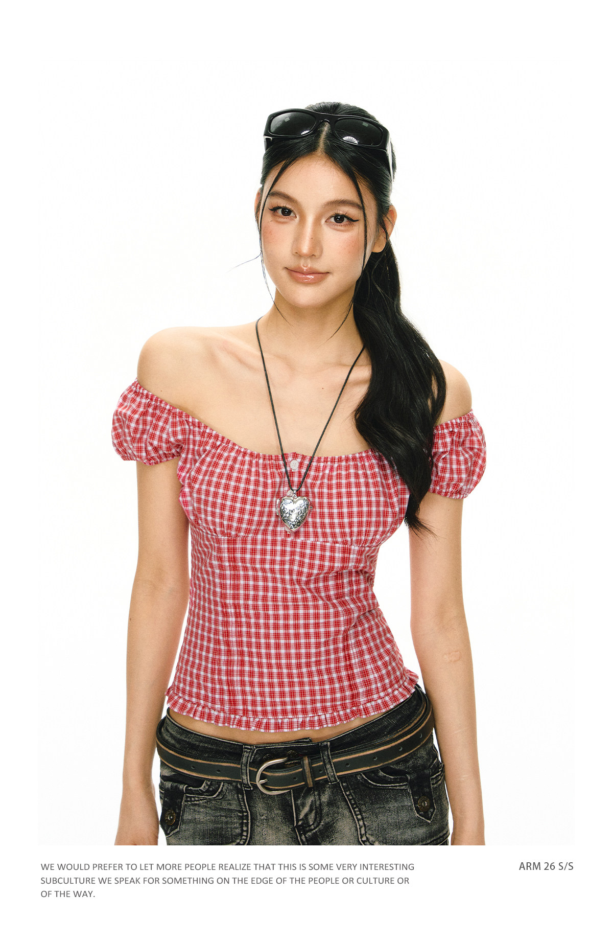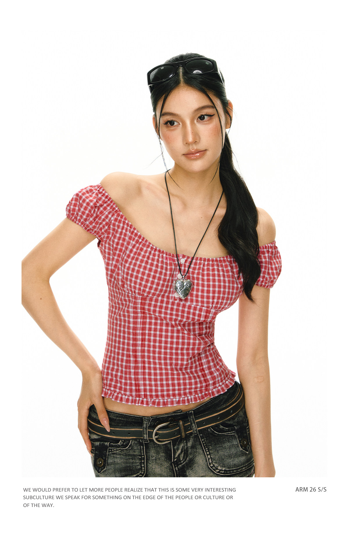 Ariseism 美式复古设计感露肩短袖t恤女夏季新款修身一字肩上衣