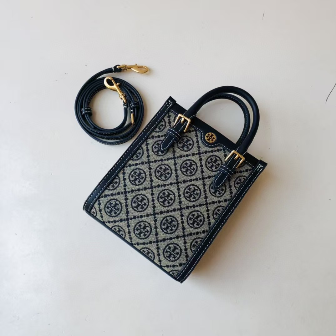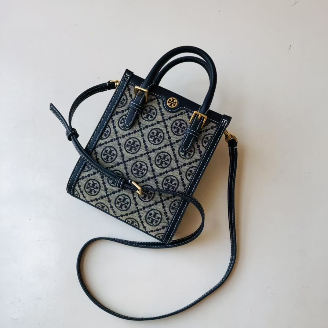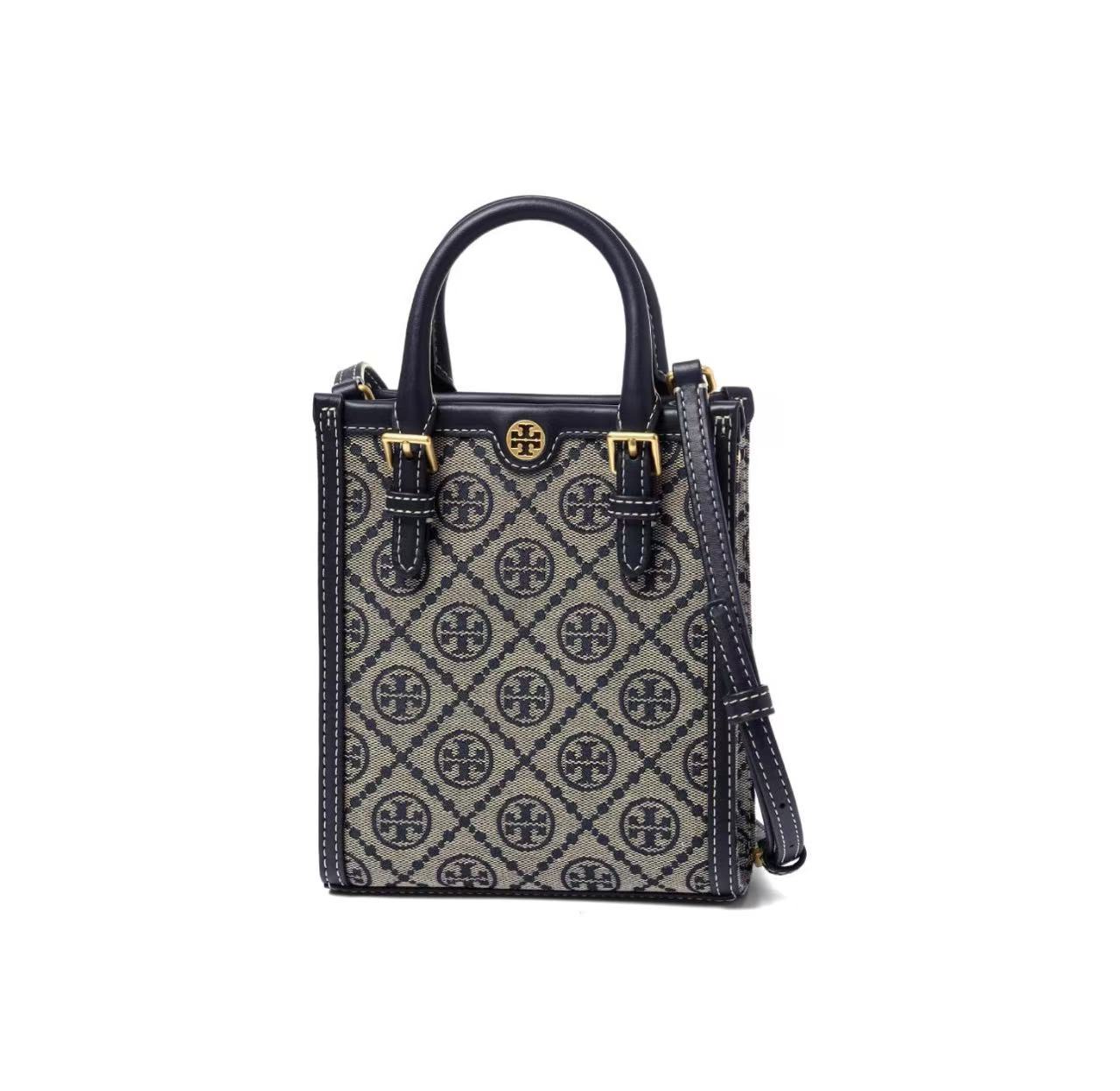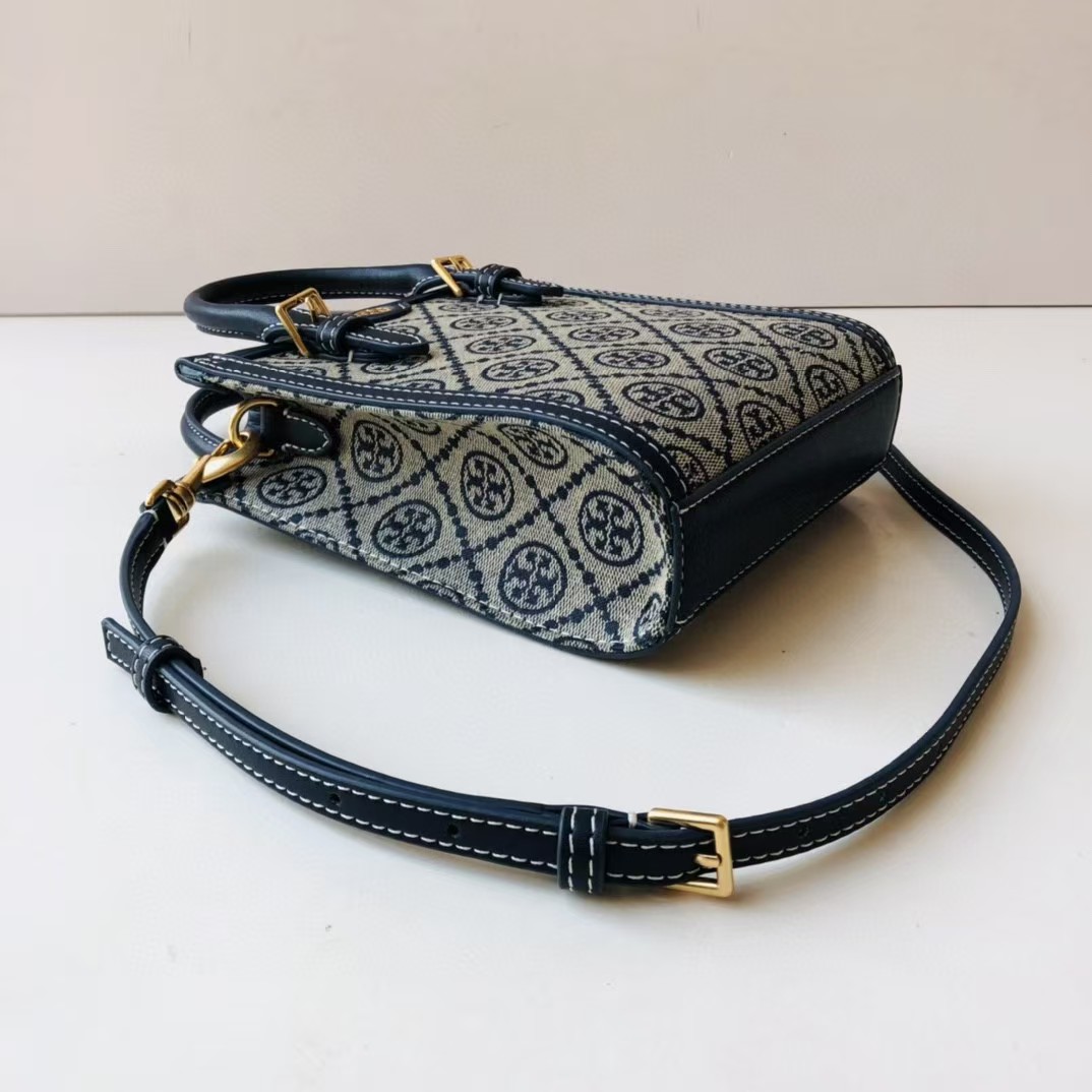 TORY BURCH 汤丽柏琦 T Monogram 经典老花满印 织物拼皮革 琴谱包托特包购物袋手提单肩斜挎包 迷你 男女同款 海军蓝(CB))