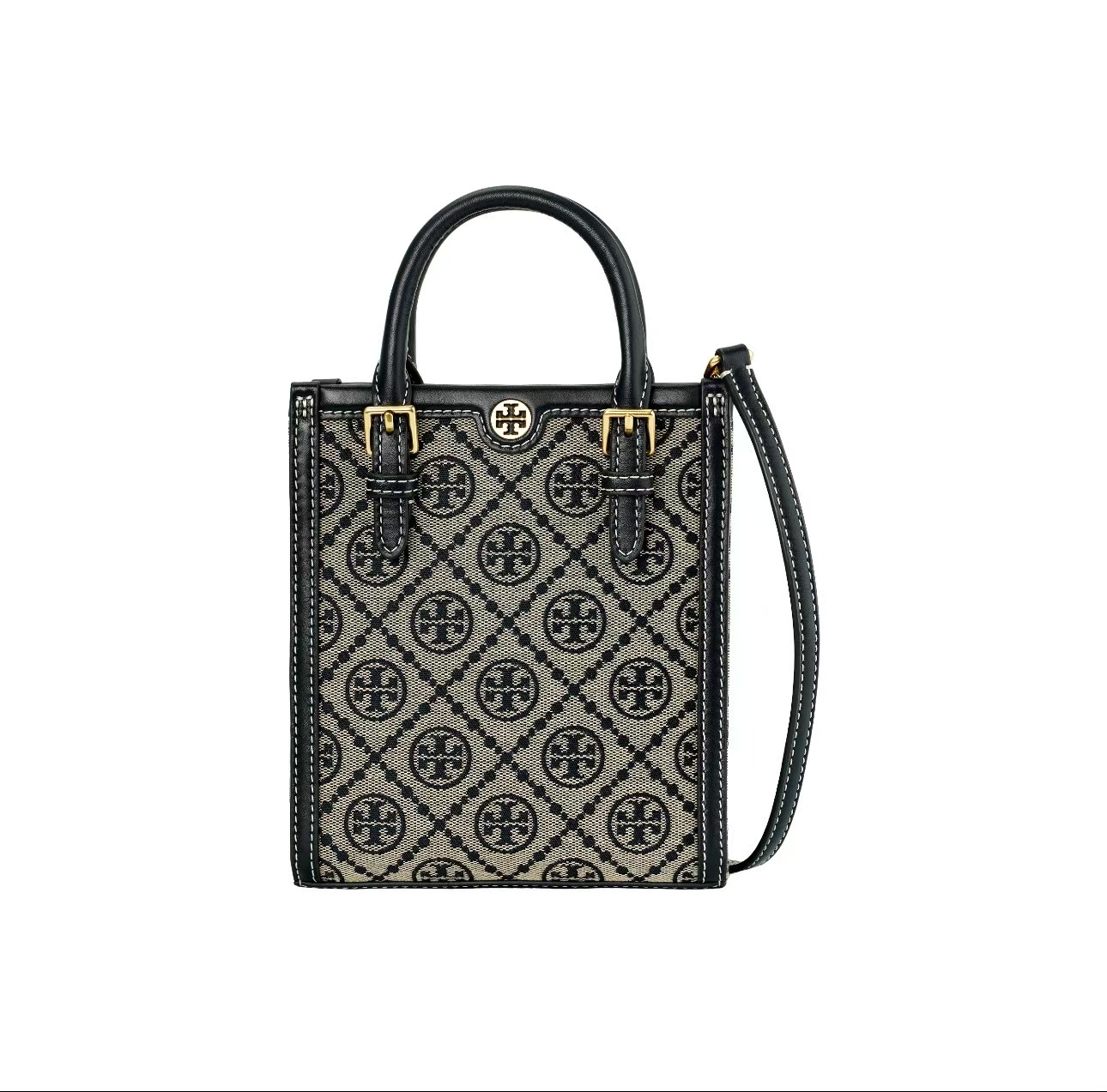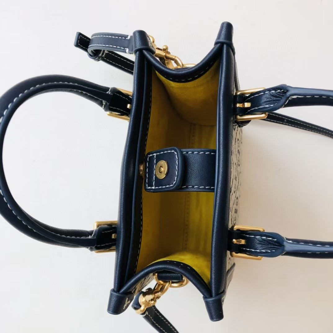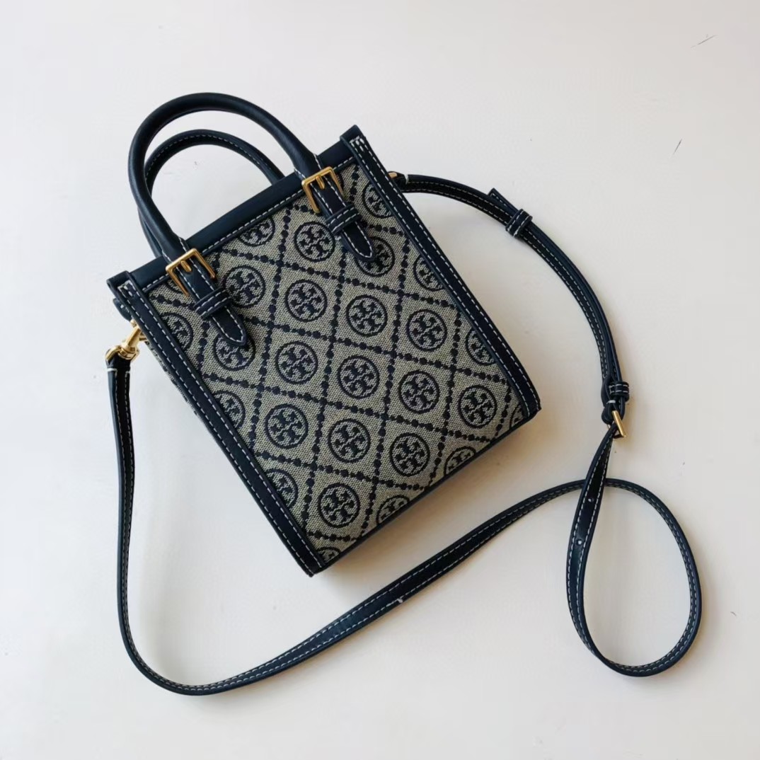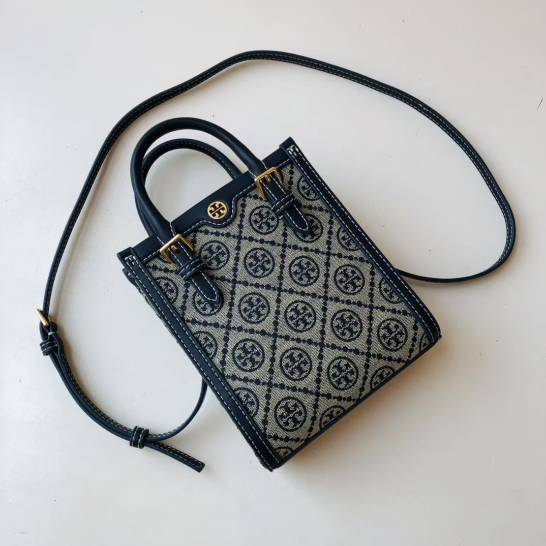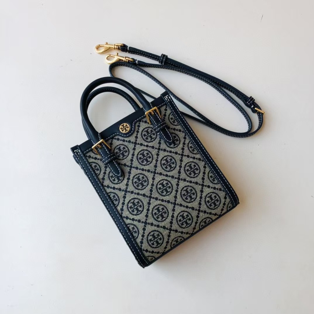TORY BURCH 汤丽柏琦 T Monogram 经典老花满印 织物拼皮革 琴谱包托特包购物袋手提单肩斜挎包 迷你 男女同款 海军蓝(CB))