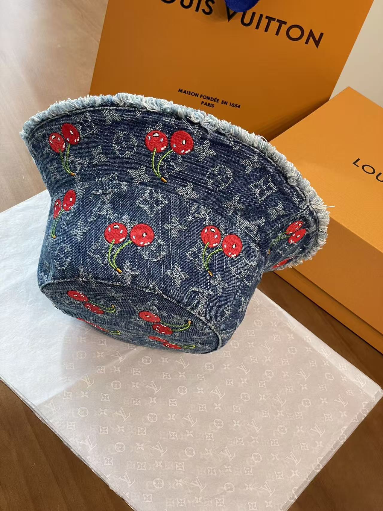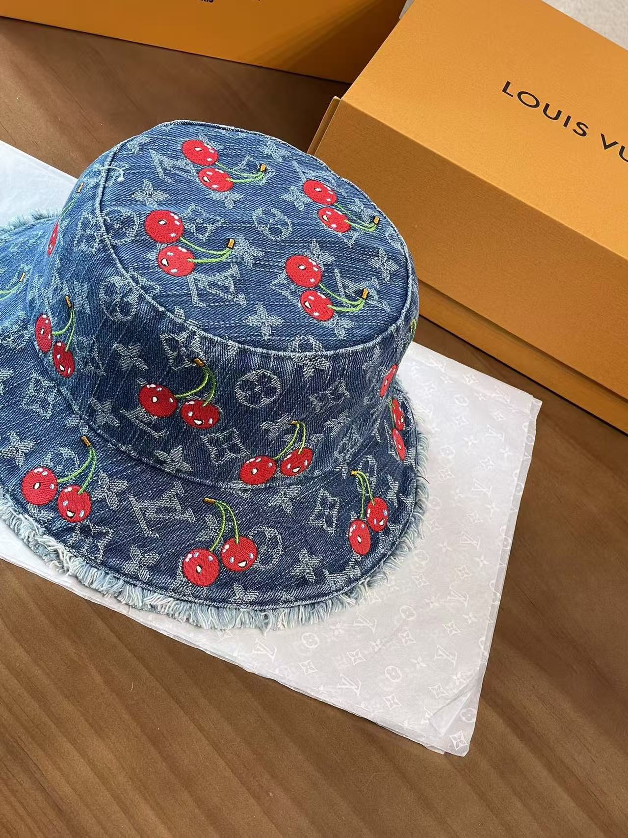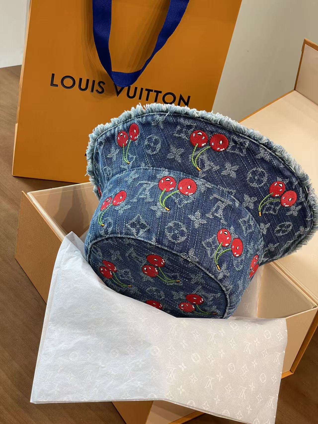 LV 这顶樱桃牛仔渔夫帽也太绝啦!经典老花牛仔面料,配上俏皮可爱的红樱桃刺绣图案, 每一枚🍒都颗粒饱满立体效果 ,灵动俏皮 ,细节之处尽显品牌匠心,毛边帽檐又增添了几分随性时髦感~摆在 LV 经典橙盒旁,氛围感直接拉满,戴上它出街,谁能不回头!时髦精必备单品,狠狠心动了💓