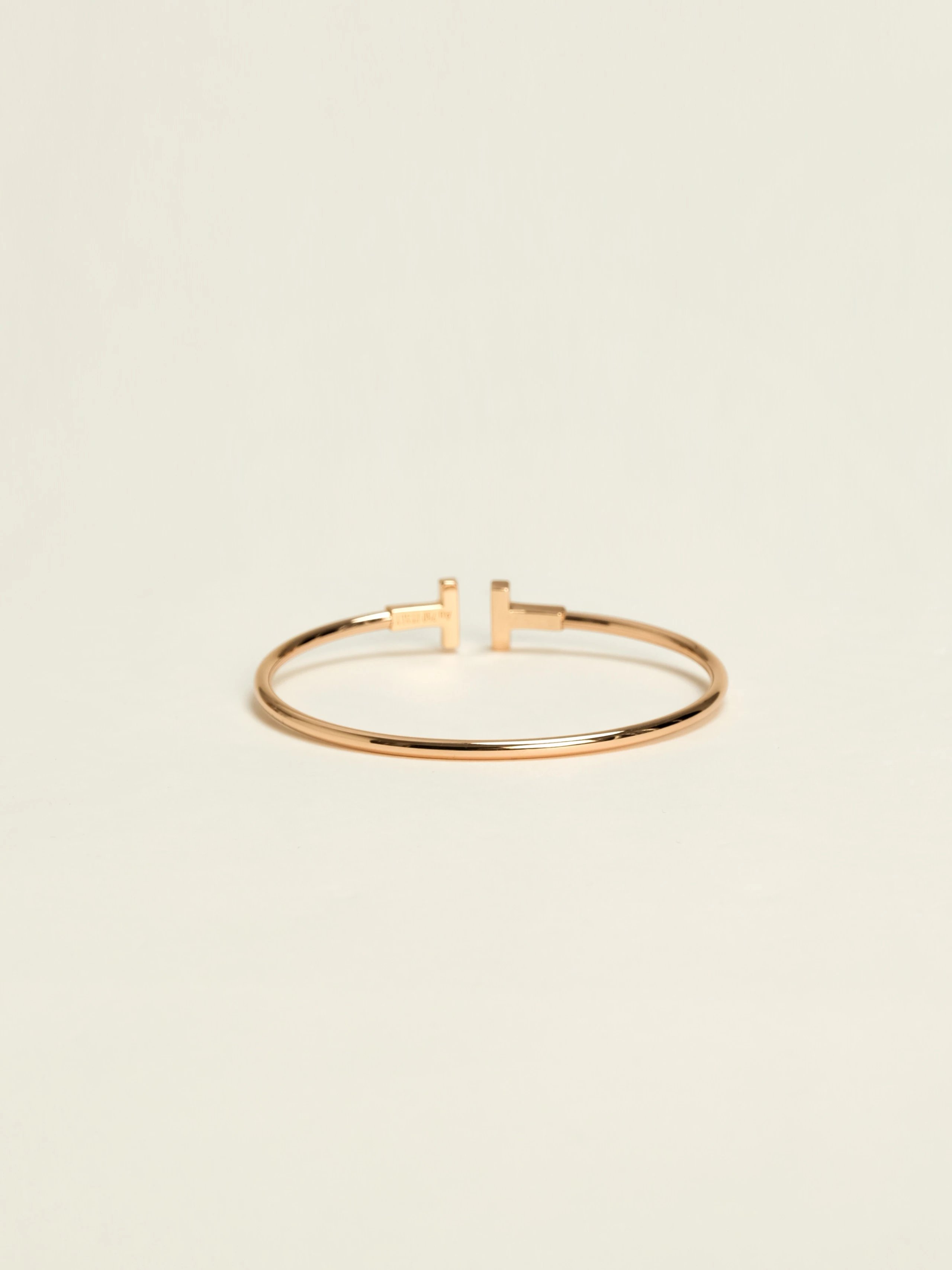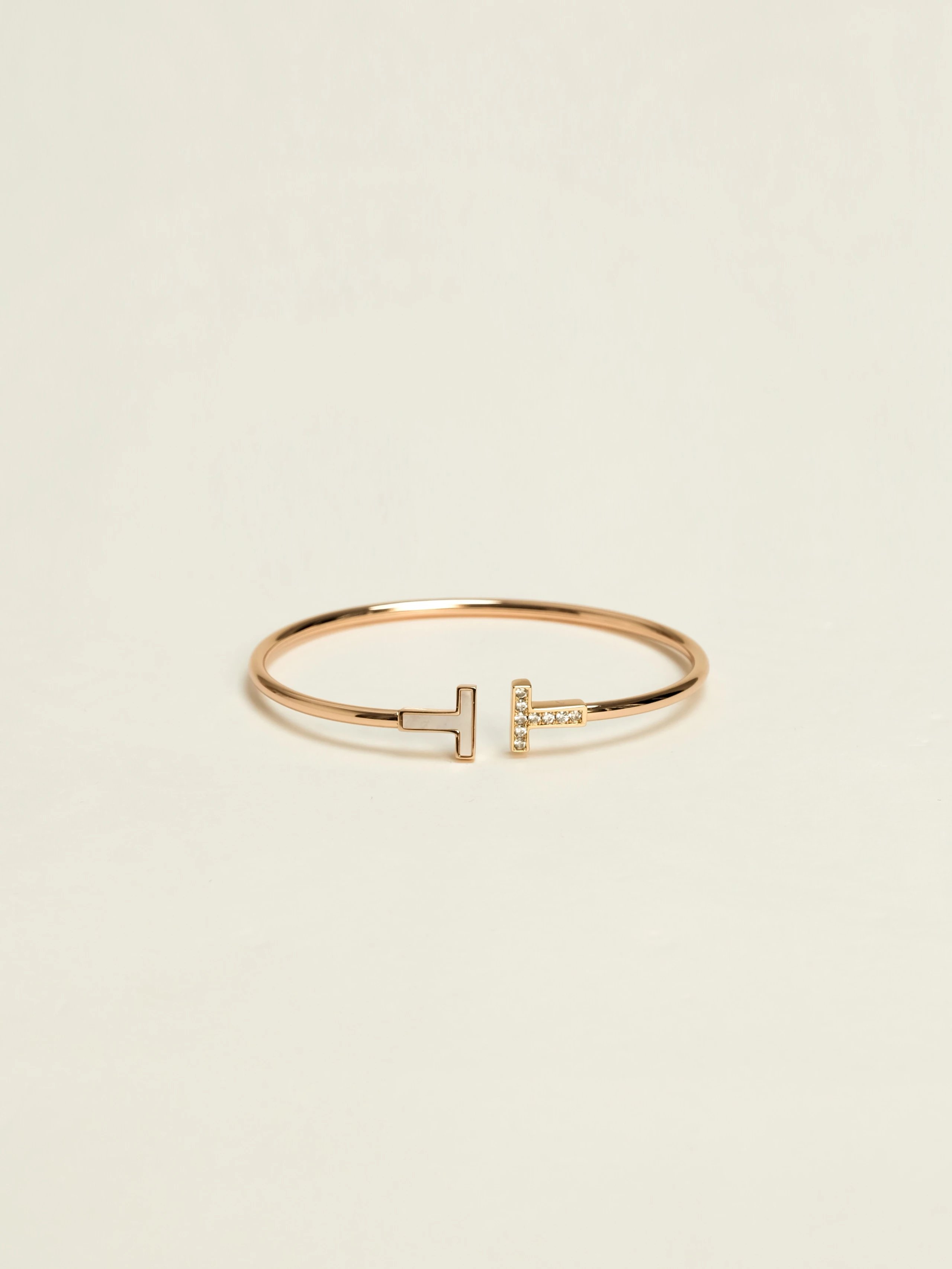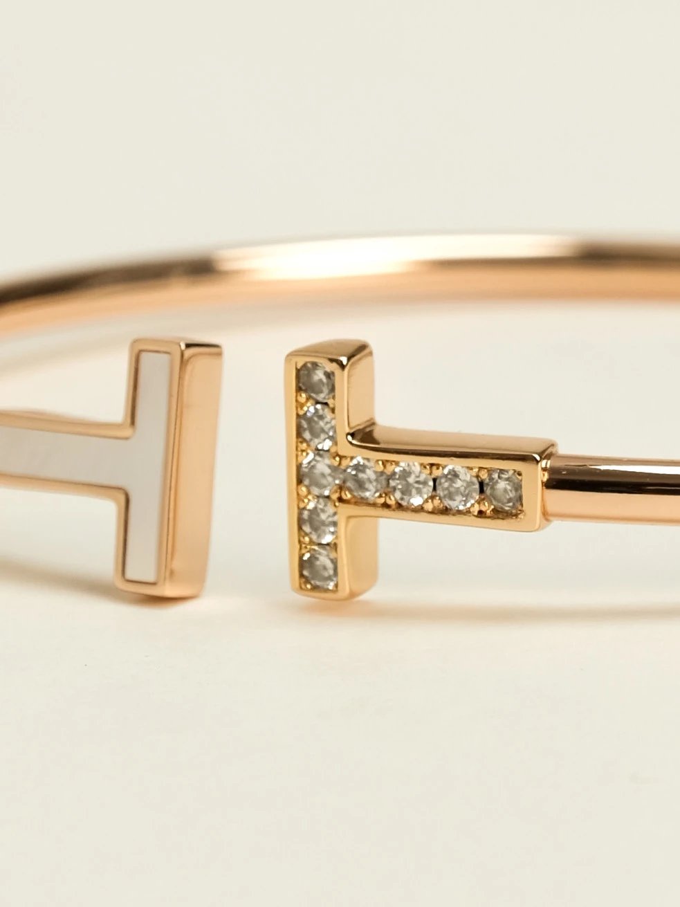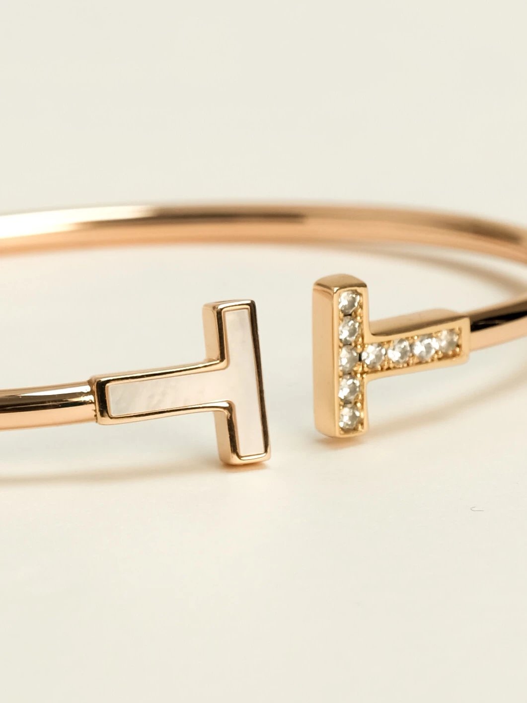 此款手镯镶嵌彩虹光泽的珍珠母贝,设计大胆、光彩耀目、典雅迷人、时尚别致。Tiffany T 系列多面设计经典迷人,令爱意时刻相伴您的左右。将这款简洁的手镯与其他金属手链叠戴,打造迷人造型