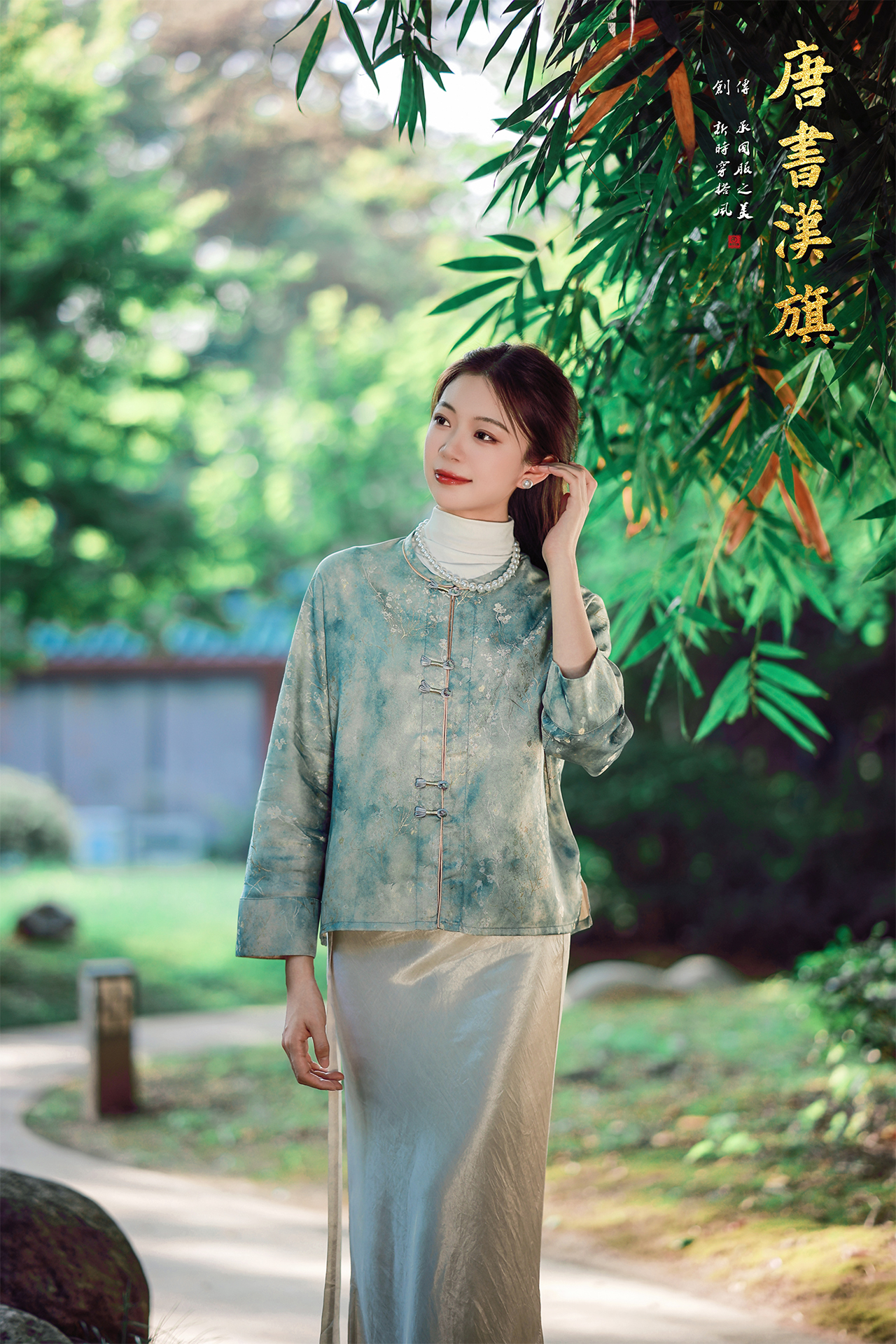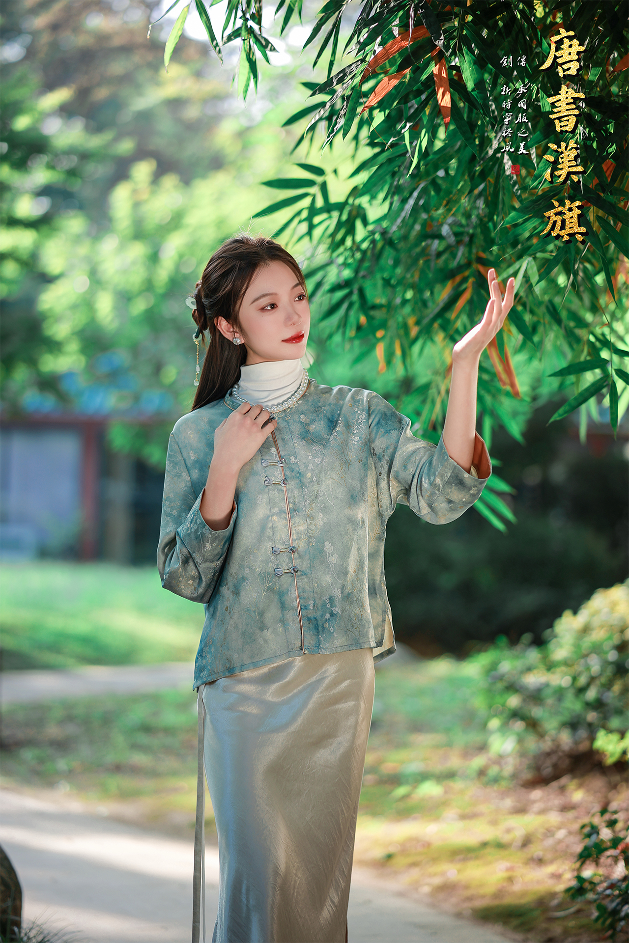 【青花灰影(人丝提花)】青釉色提花中式短衫,萃取国风雅致,点亮日常穿搭意境。 衣身以清润青釉色为底,暗织雅致提花纹理,圆领设计衬出颈部温婉线条;门襟缀传统盘扣,长袖翻折整体版型宽松有度