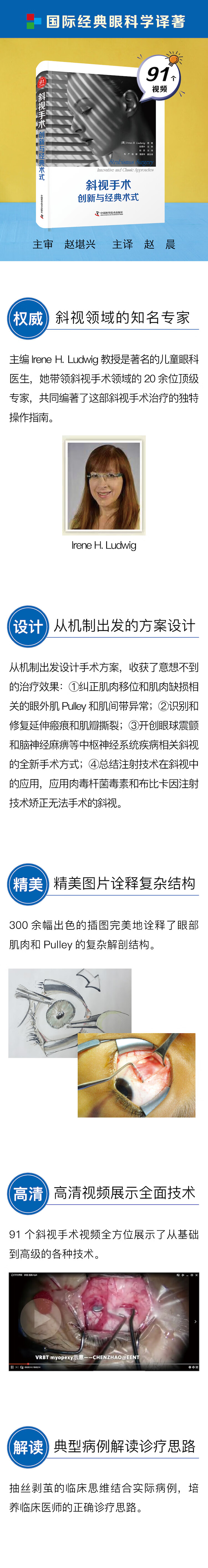 本书引自 Thieme 出版社,由多位资深斜视医生结合多年的实践经验精心打造。相较于其他斜视专著,本书z大的特点是以一个全新的理念“斜视机制”来组织全书内容,通过图片、手绘图、实例和视频深入浅出地展示了各类斜视及其对应的各种术式,便于读者理解。全书共四篇:第一篇绪论,详细介绍了斜视手术的历史;第二篇斜视诊断与手术计划,对斜视的术前评估、基于解剖生理的手术原则和基于斜视机制的各类斜视进行了细致说明,特别对 Pulley 异常和肌瓣撕裂进行了深入浅出的介绍;第三篇术式,作者首先介绍了手术的一般原则、经典术式及斜肌的手术技巧,详细介绍了各类手术的每个细节和手术中的要点,然后直击术式的进展;第四篇总结,对斜视手术进行了展望。本书编排独具特色,图文对应,阐释简明,附有大量典型病例、精美图片和高清视频,便于读者学习和领会,可作为从事斜视专业医生的进阶指导书。