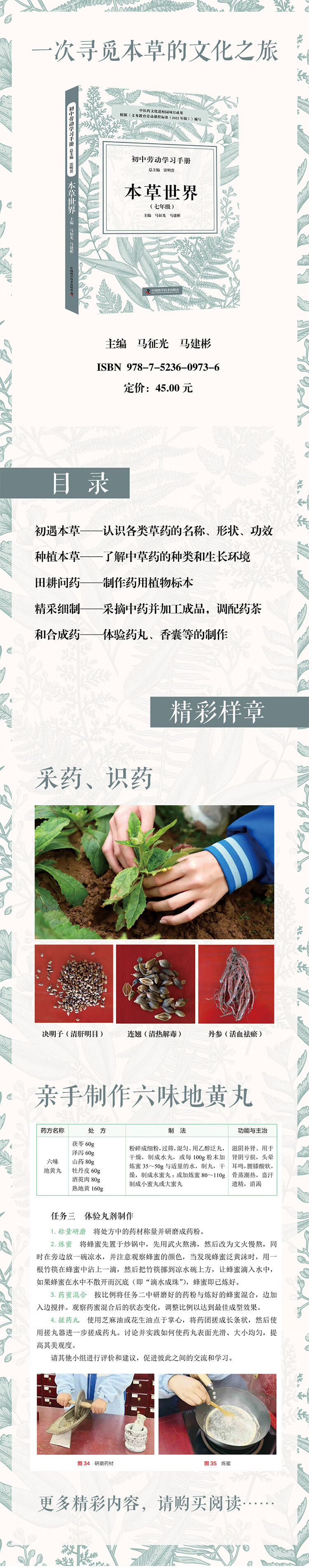 《本草世界》包括“初遇本草”“种植本草”“田耕问药”“精采细制”“和合成药”五个单元,以及“中医药文化节”劳动周。《本草生活》包括“养生之道”“春生万物”“夏长百草”“秋收五谷”“冬藏二气”五个单元,以及“中医药技术方法展览会”劳动周。《本草人生》包括“文化之脉”“本草探秘”“ 本草生香”“经典寻药”“成就健康”五个单元,以及“我想学中医”劳动周。每个单元又含 2~5 个项目,每个项目包括劳动情境、劳动准备、劳动过程、交流与反思、劳动评价和劳动拓展六个部分。引导学生主动参与、亲身实践和深度探究,领略中医药文化的魅力,体悟中医药文化的精髓。