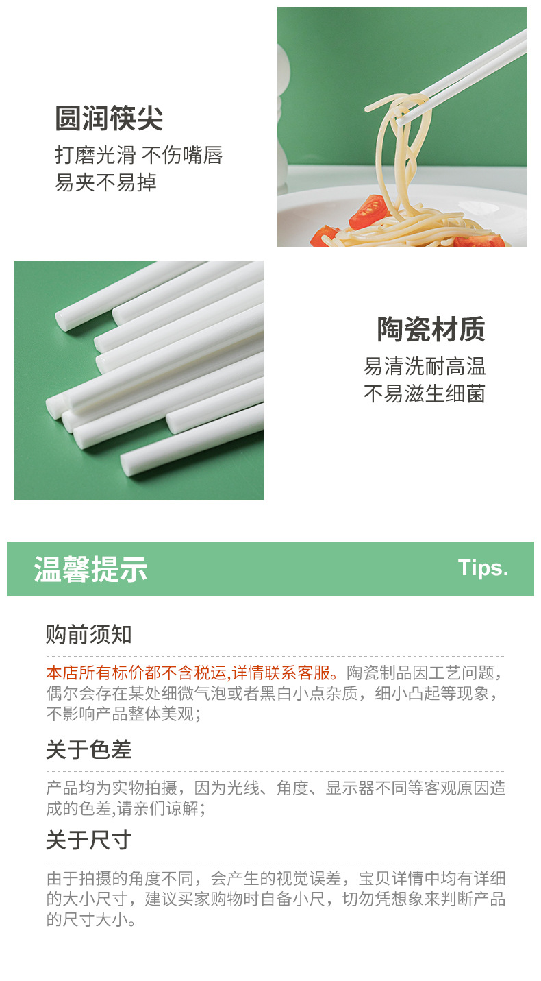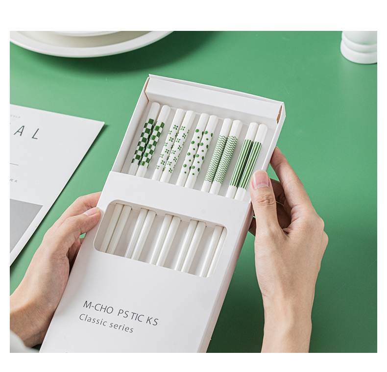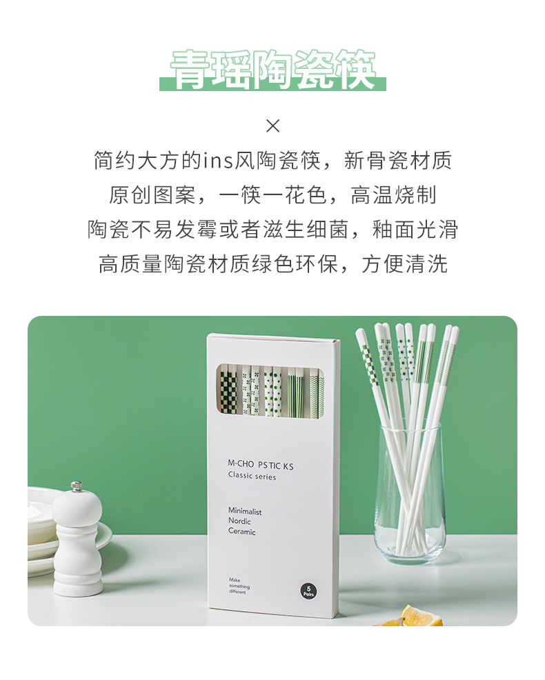 【几何图案设计陶瓷筷子】简约绿白 几何图案 家用一人一筷五双礼盒装 清明国庆