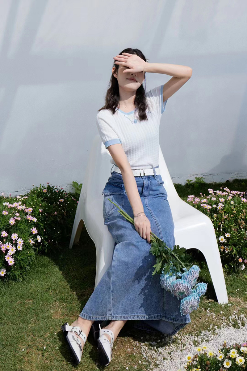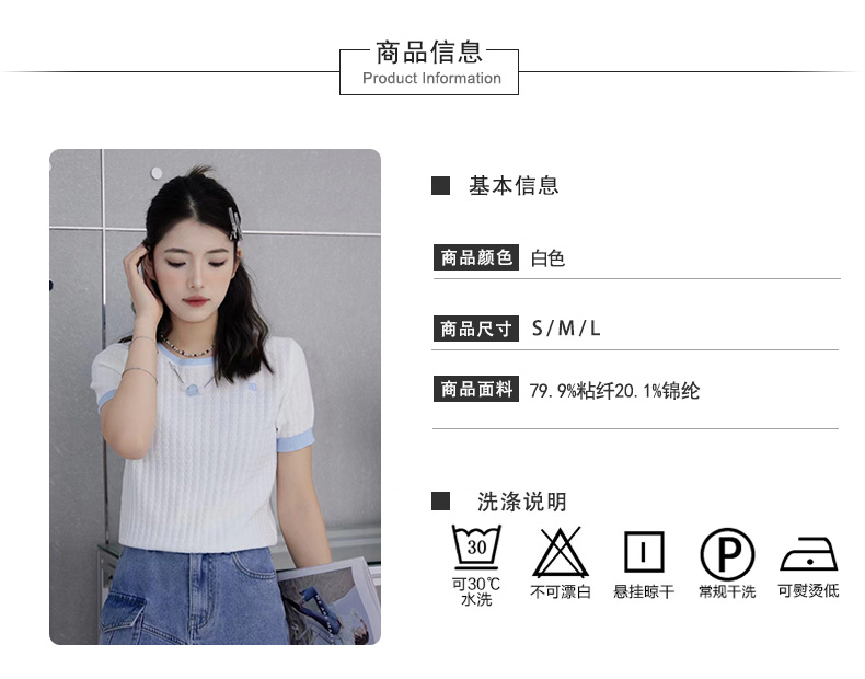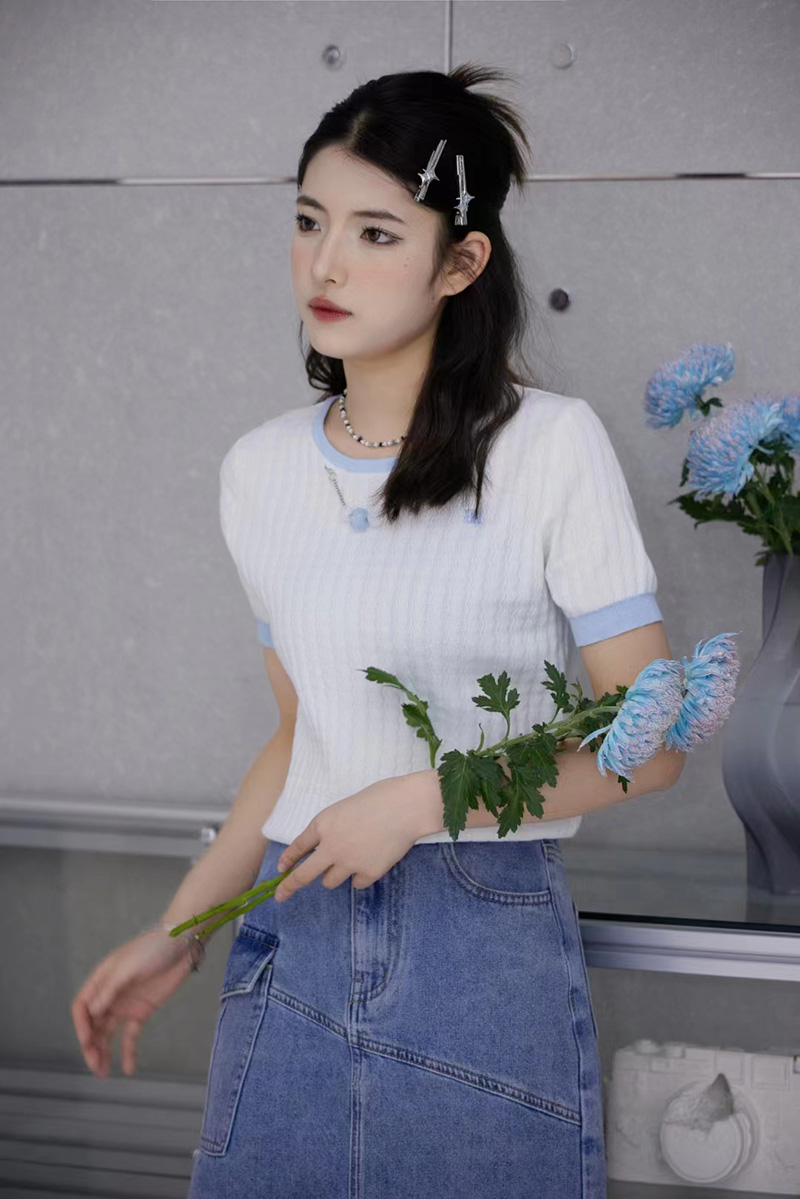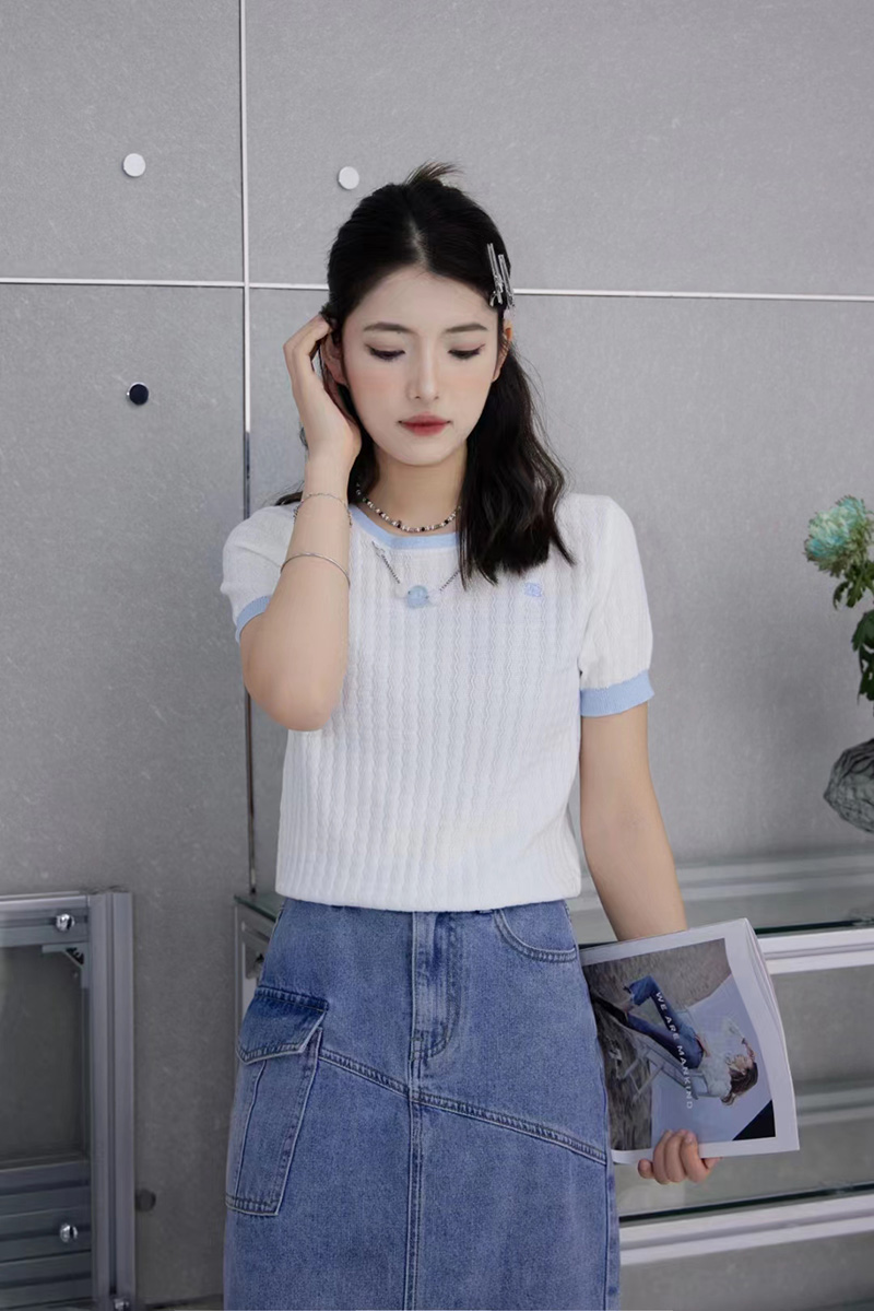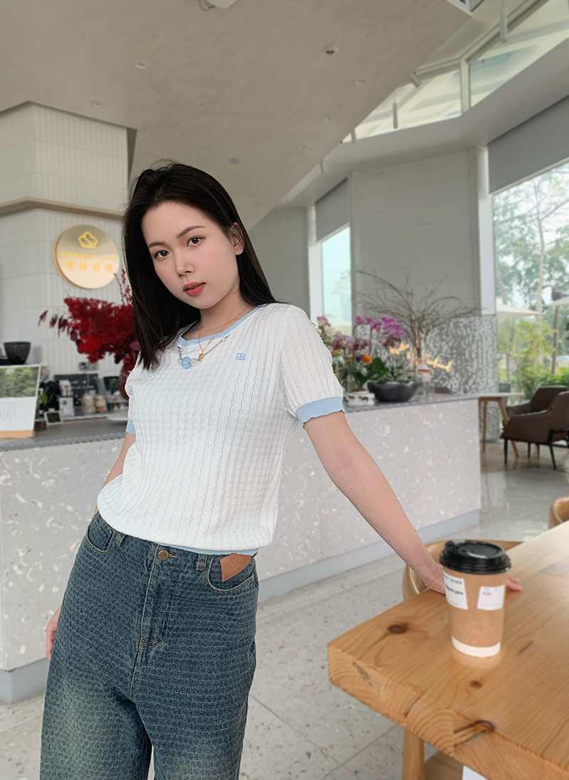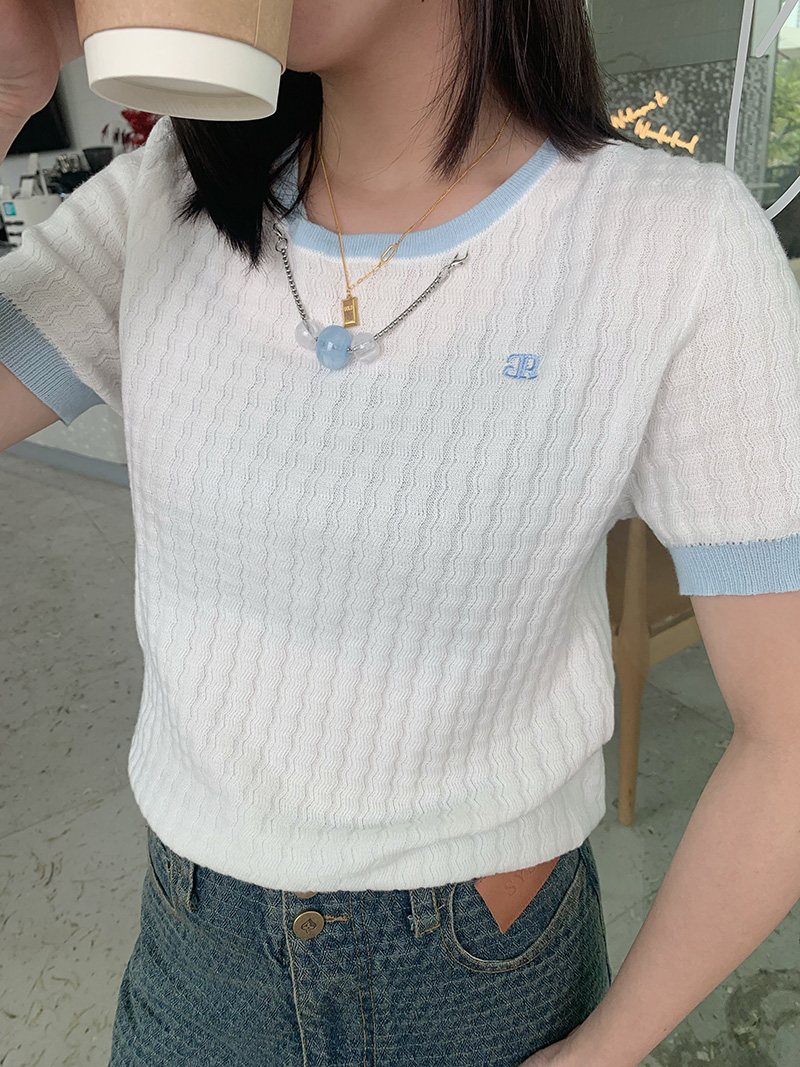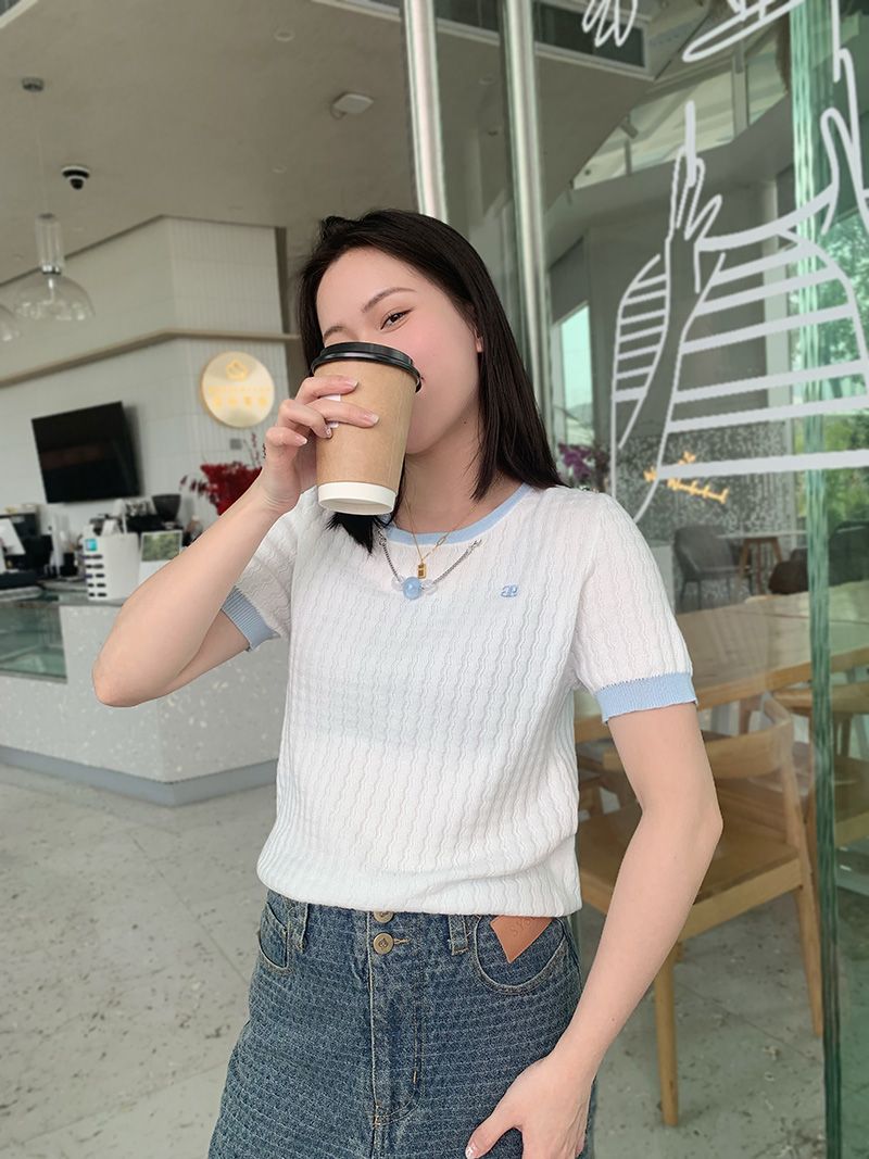 圆领撞色边挂珠针织短袖衫 9522040017