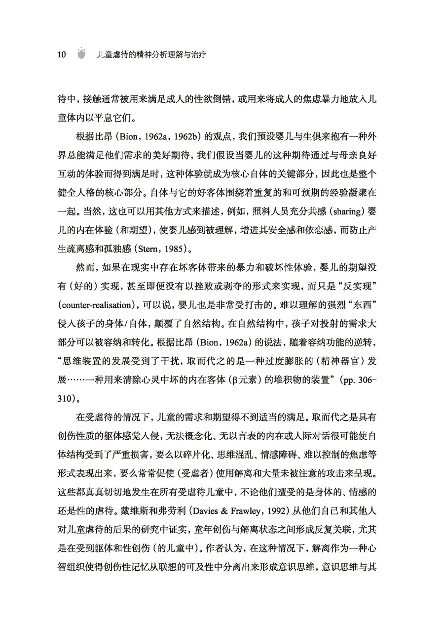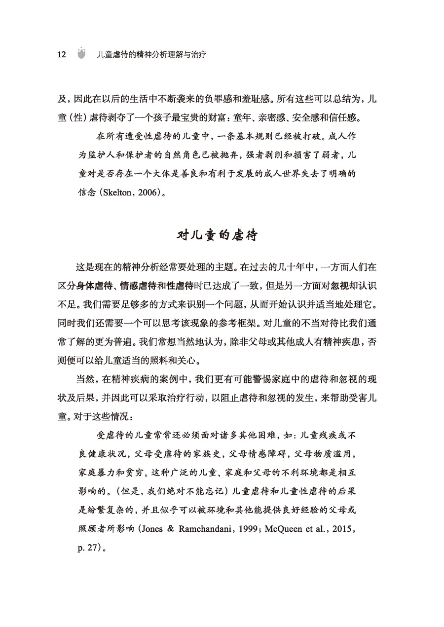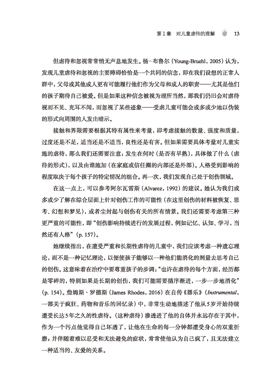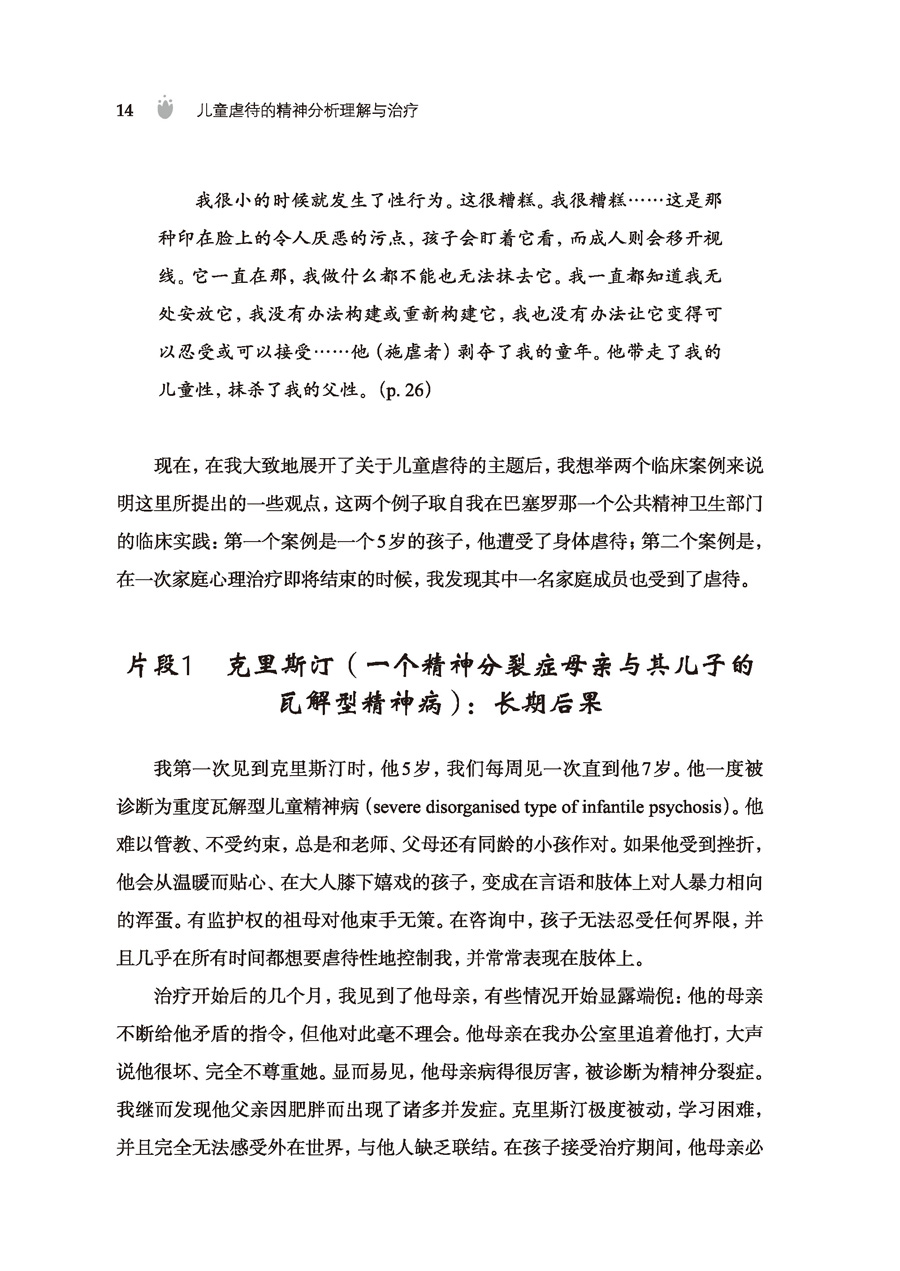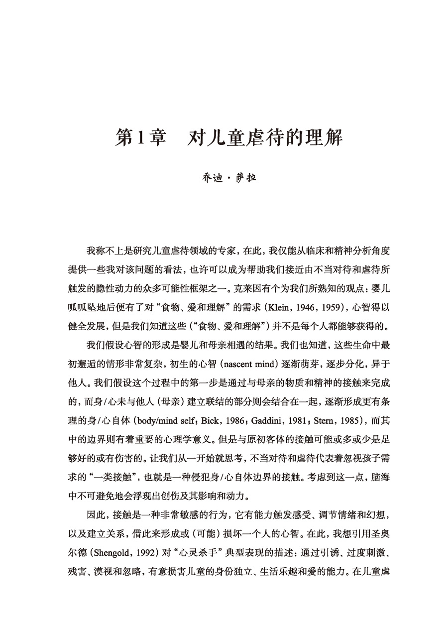 本书是一本以“儿童虐待”为主题、以精神分析视角为核心的会议论文集,因而书里涉及这一主题下的广泛领域。书里包含丰富的案例,深入浅出地为我们与受虐待的儿童或者已经成年的受害者们的工作带来了洞见与方向。本书还介绍了能帮助他们的传统方法和新兴方法,努力减轻他们的痛苦,疗愈其因虐待留下的创伤,提供了个人治疗的建议,并兼顾了照料人员自身的心理关怀。