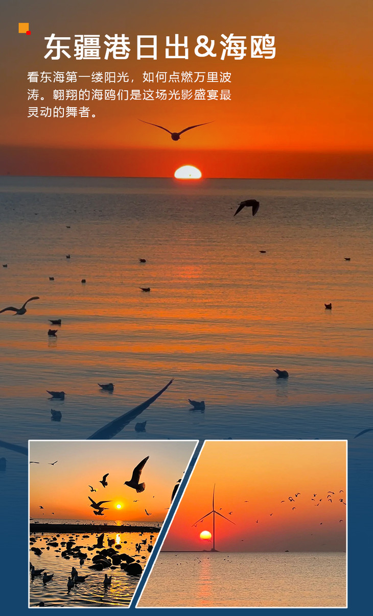 赴一场东疆港的冬日约会:与海鸥共赴新年第一缕光当东方的天际线被染上橘红色的暖意,当凛冽的海风轻抚过等待的脸庞,远方的海鸥,如约而至。它们是日出的精灵,是大海的信使,在晨光与波涛间,谱写冬日的序曲。这一刻,海天一色,万物有灵。来东疆港,看朝阳如何跃出海平面,看海鸥如何唤醒沉睡的世界。