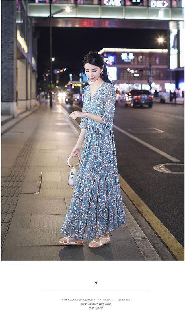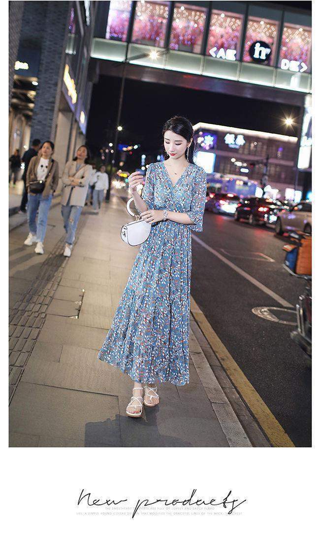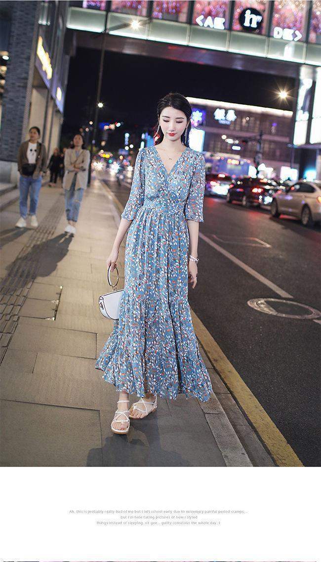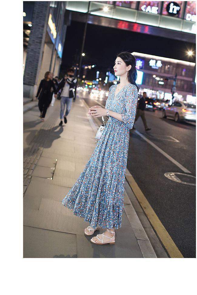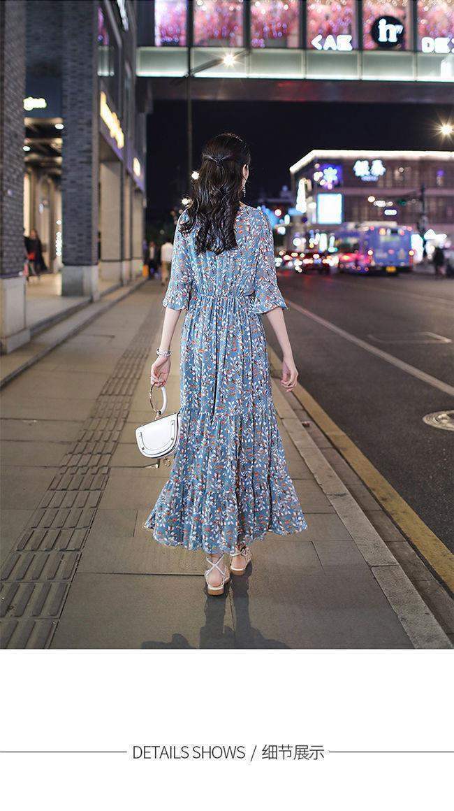 姐妹V领复古碎花雪纺连衣裙女新款夏季仙收腰显瘦大摆长裙_ym