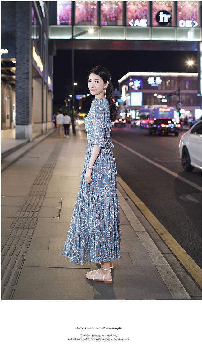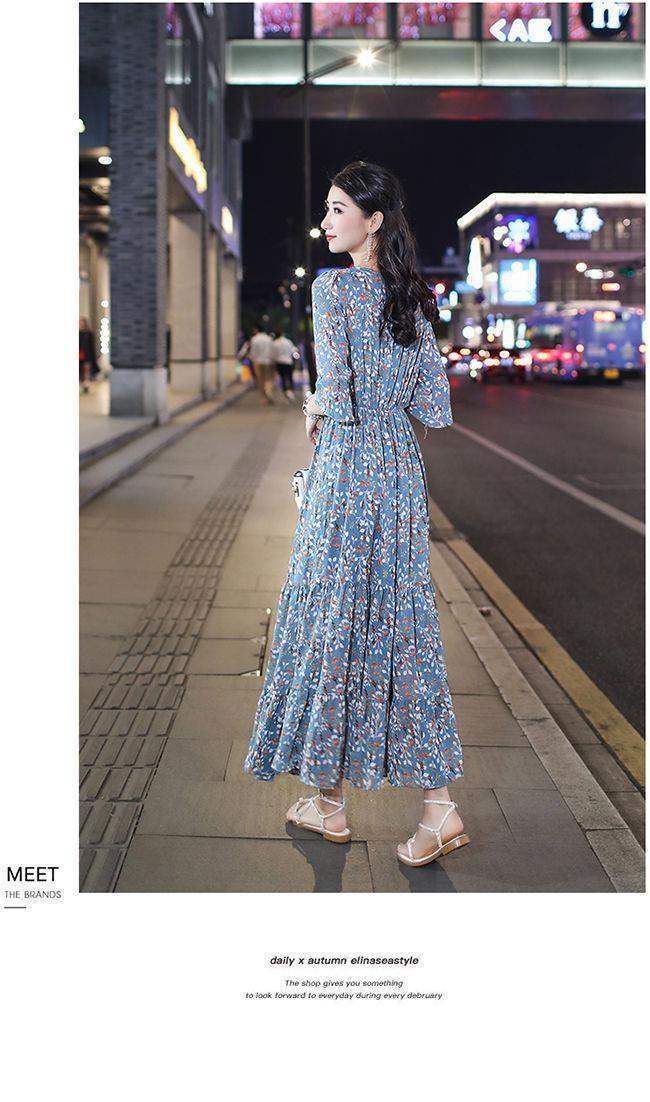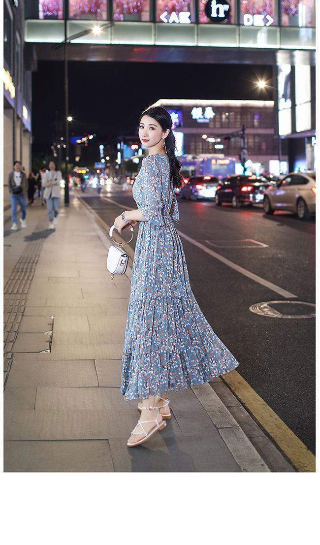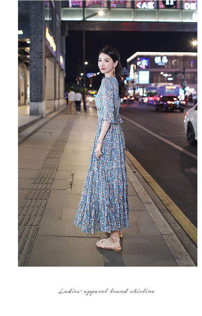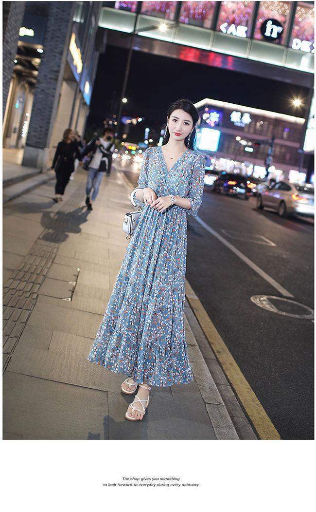 姐妹V领复古碎花雪纺连衣裙女新款夏季仙收腰显瘦大摆长裙_ym