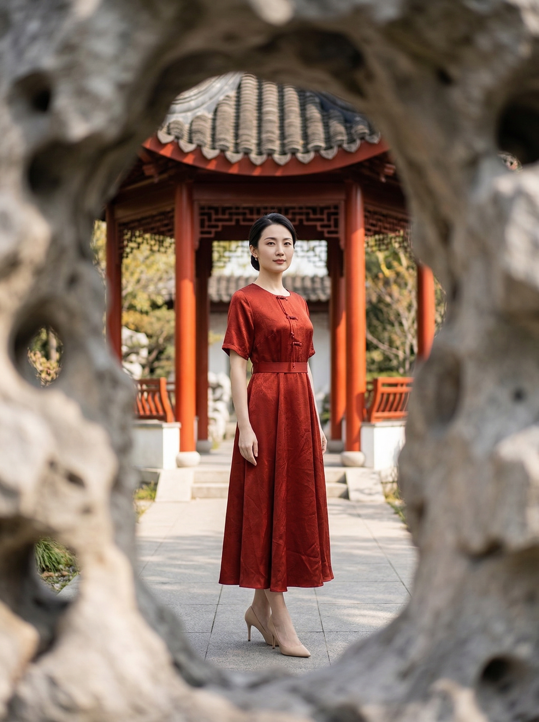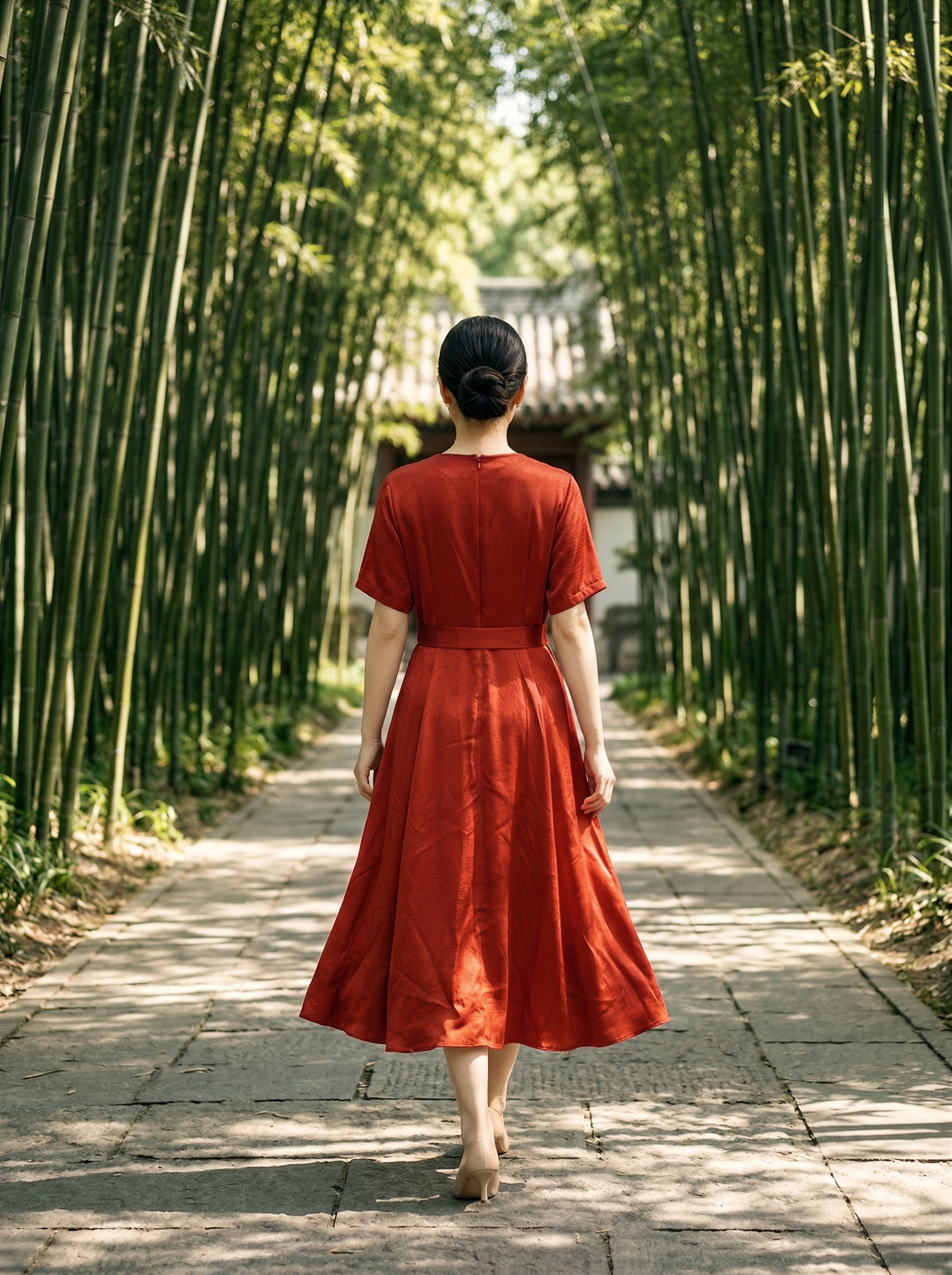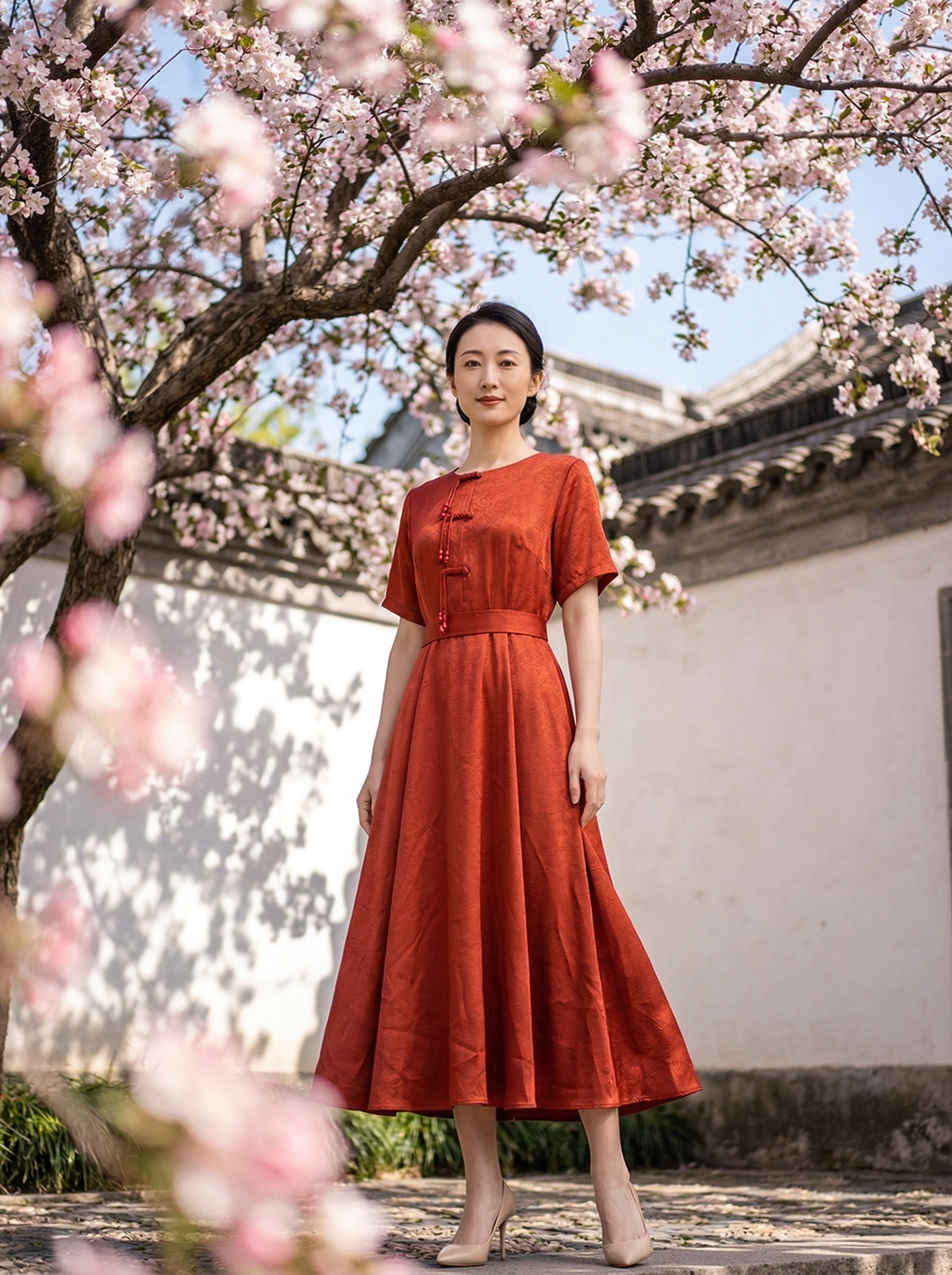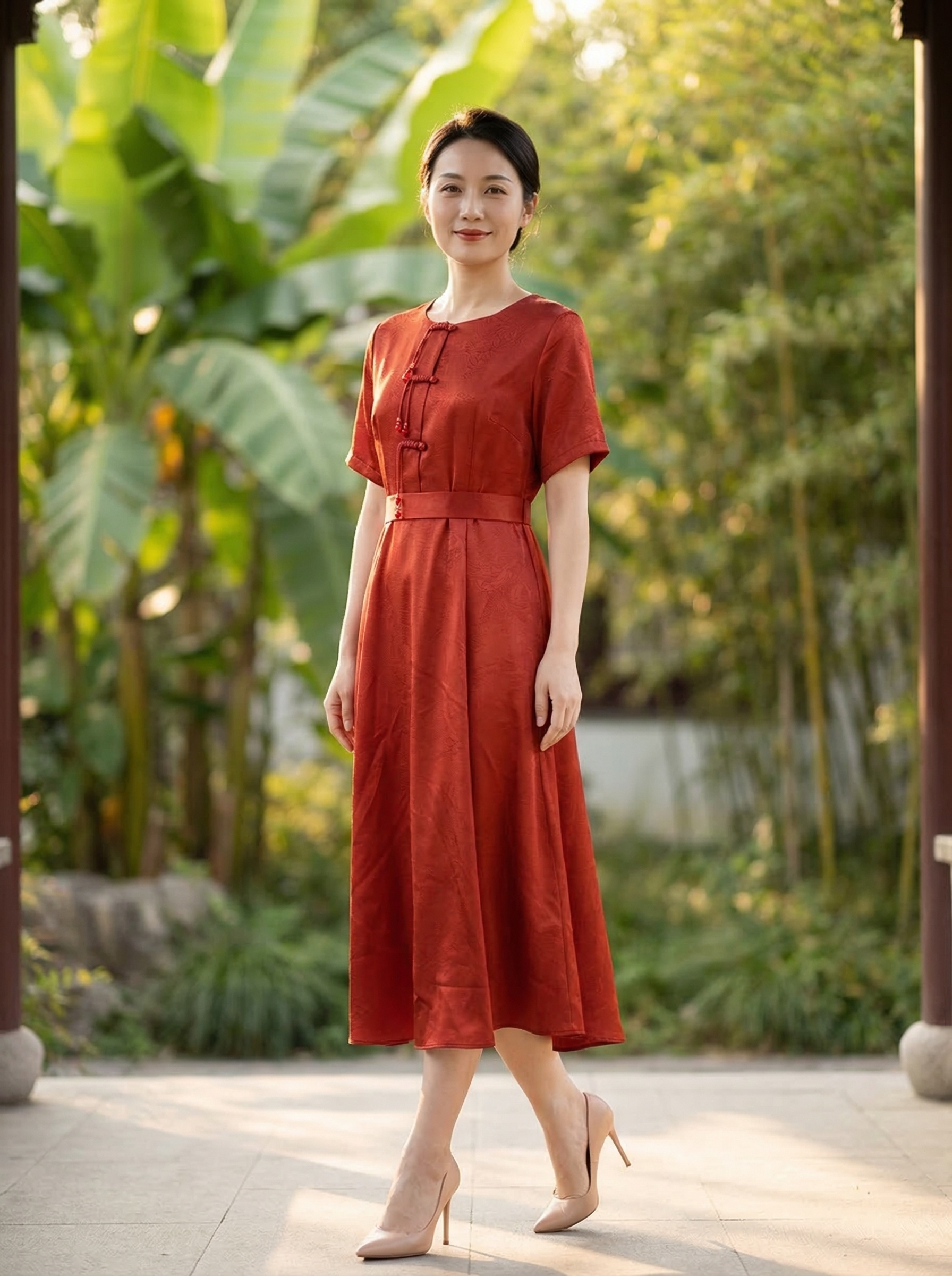 HJ2S86_银朱色_连衣裙_夏季_新中式圆领流苏盘扣提花缎面收腰显瘦气质 A 字长裙_高级女装_BERNIEELEN 伯妮斯茵