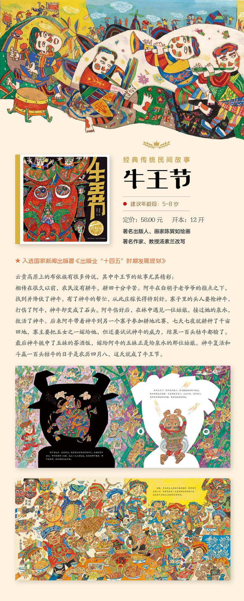 云贵高原上的布依族有很多传说,其中牛王节的故事尤其精彩:相传在很久以前,农民没有耕牛,耕田十分辛苦。阿牛在白胡子老爷爷的指点之下,找到并降伏了神牛,有了神牛的帮忙,从此庄稼长得特别好。寨子里的头人要抢神牛,打伤了阿牛,神牛却变成了石头。阿牛伤好后,在林中遇见一位姑娘,接过她的泉水,救活了神牛。后来阿牛带着神牛到另一个寨子参加耕地比赛,七天七夜就耕种了千亩田地,寨主要把五女之一嫁给他,但还要试试神牛的威力,结果一百头牯牛都输了。最后神牛挑中了五妹的茶酒饭,嫁给阿牛的五妹正是给泉水的那位姑娘。神牛复活和斗赢一百头牯牛的日子是农历四月八,这天就成了牛王节。