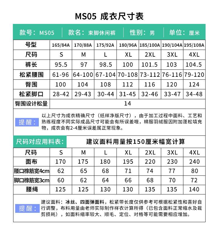 裁缝学苑MS05冰丝裤纸样男士速干束脚休闲男裤子打版裁剪做衣服板