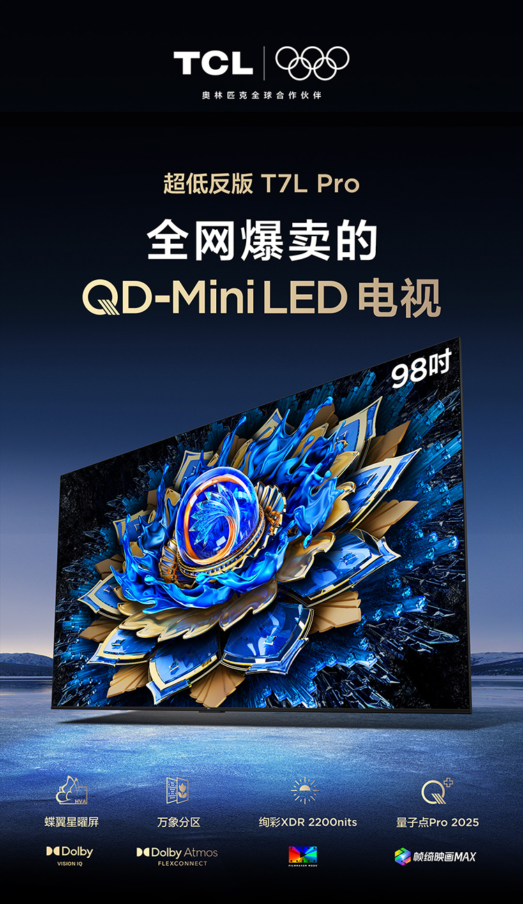 TCL电视 98T7L Pro 98英寸 QD-Mini LED 蝶翼星曜屏 万象分区 绚彩XDR 2200nits 超薄电视