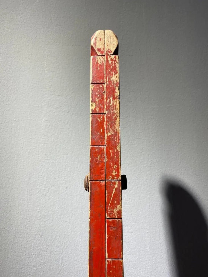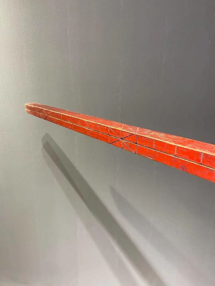 此硬木红漆折叠量尺型制修长硕大展开长近四米,以质量特别好的硬木切割琢磨而成,两段以铁螺钉转轮连接成可折叠长尺,尺寸刻度精准刻划细腻,斑驳大漆与硬木纹理互相辉映,典雅贵气。