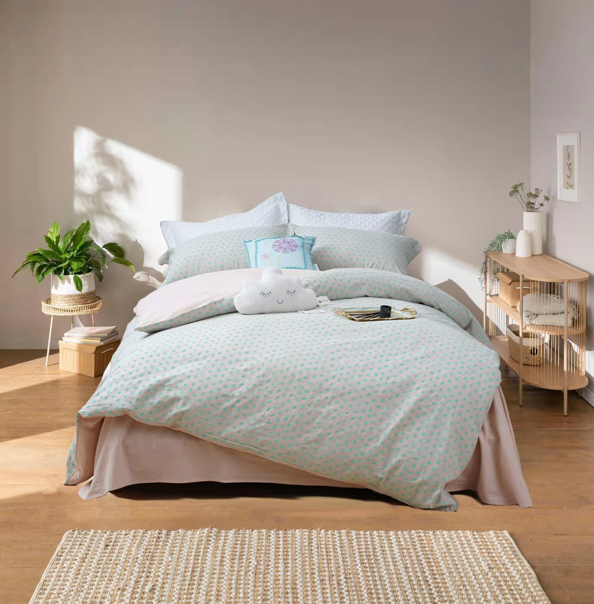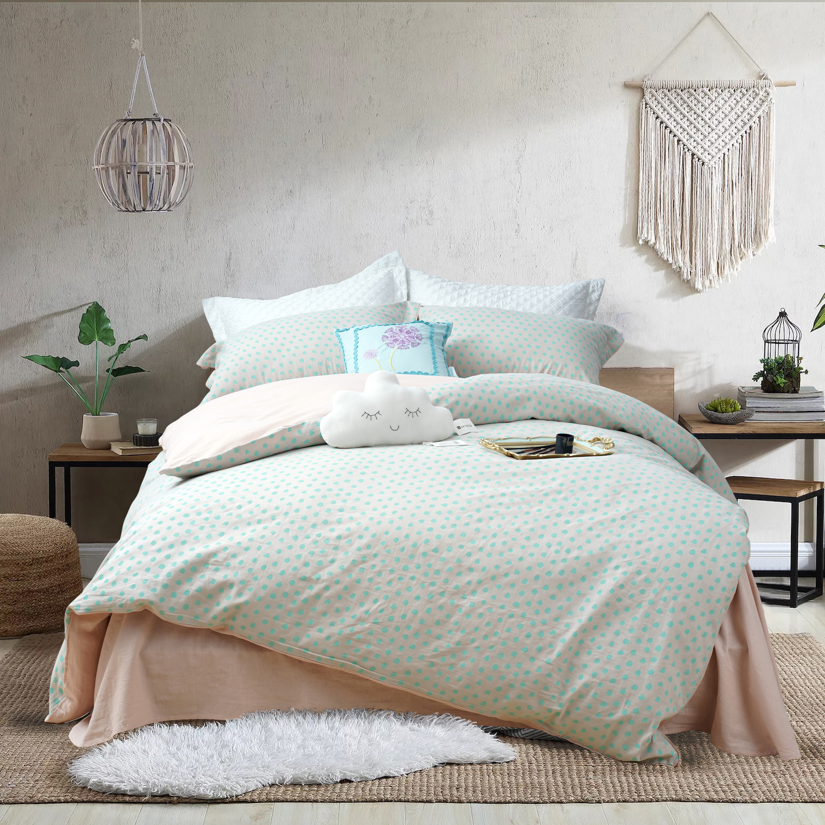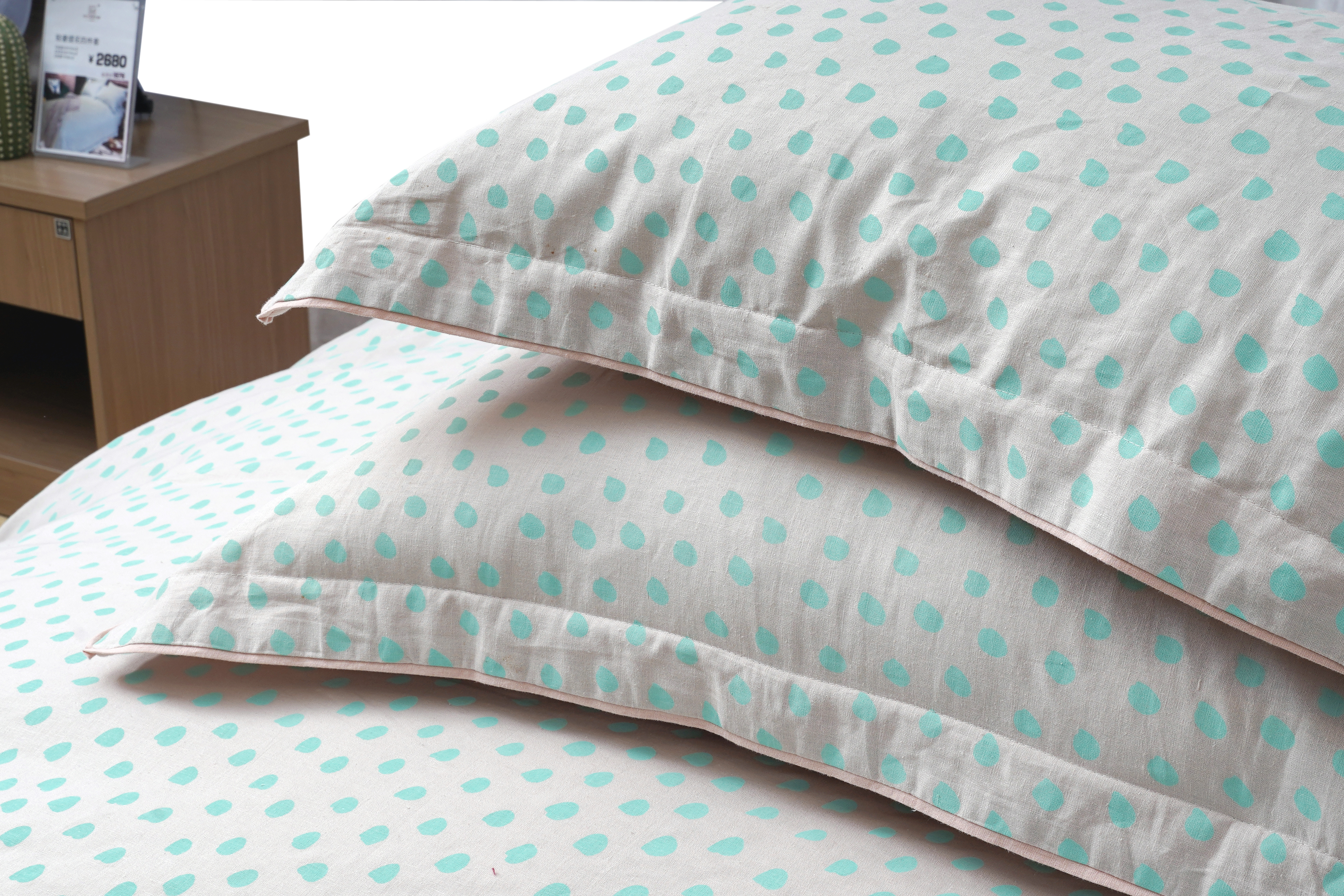 浪漫波普麻棉四件套55%亚麻45%棉素色波点简约双拼色被套床单