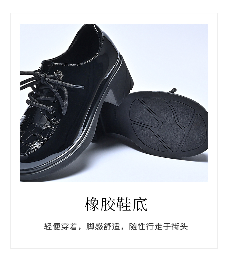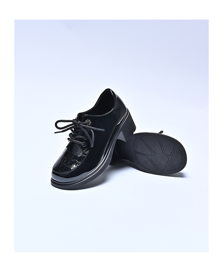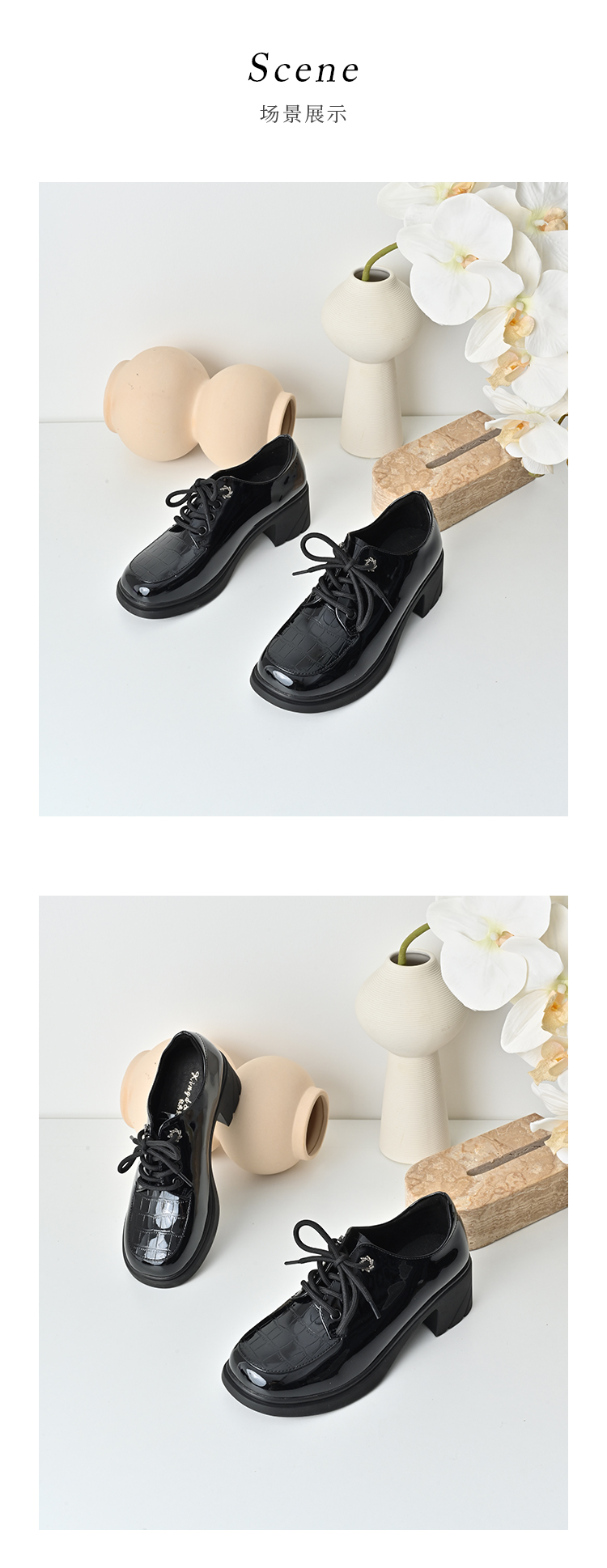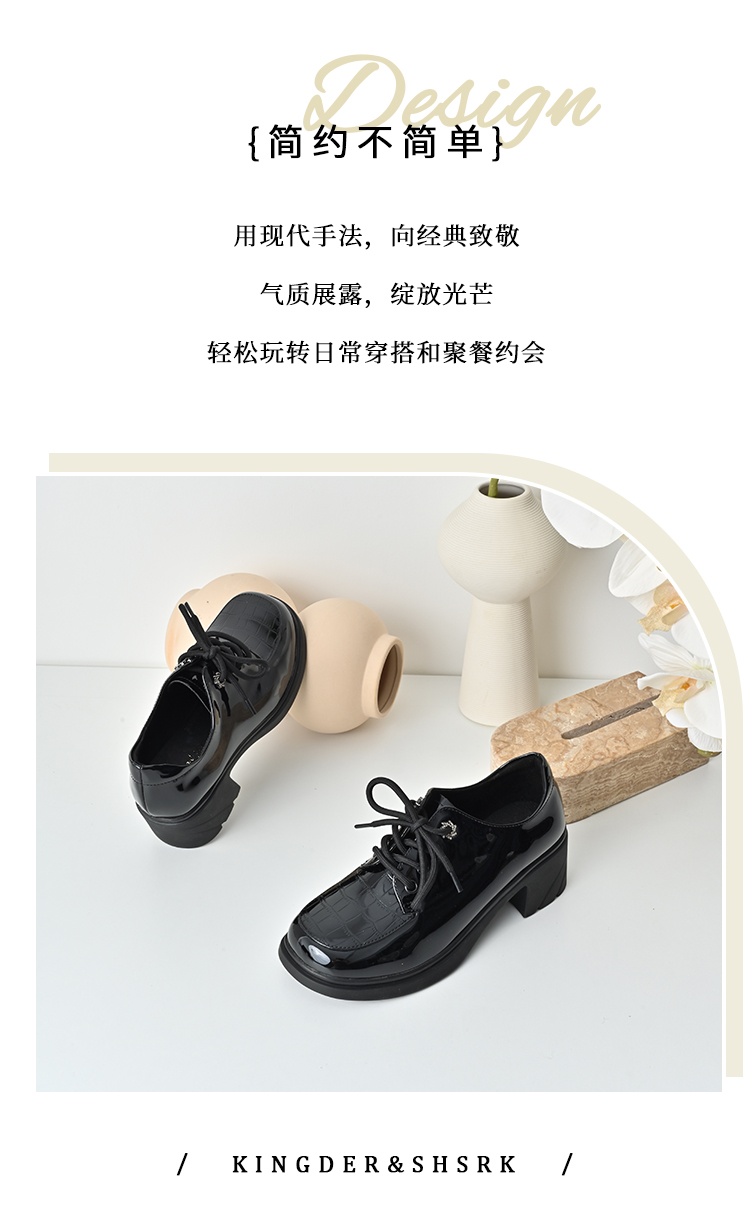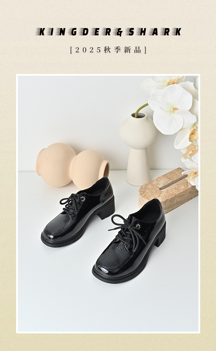 经典鲨2025秋专柜新品百搭黑色圆头鳄鱼纹中粗跟系带皮鞋女KC19-537251