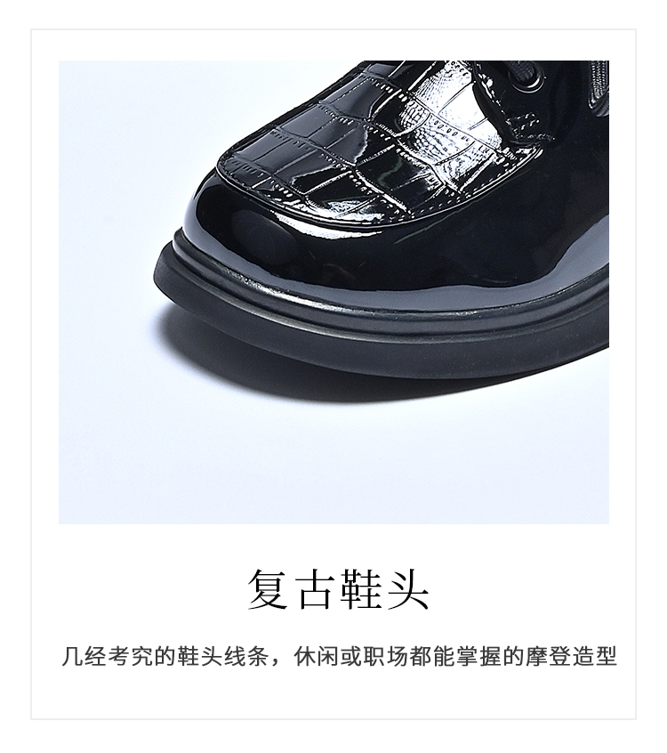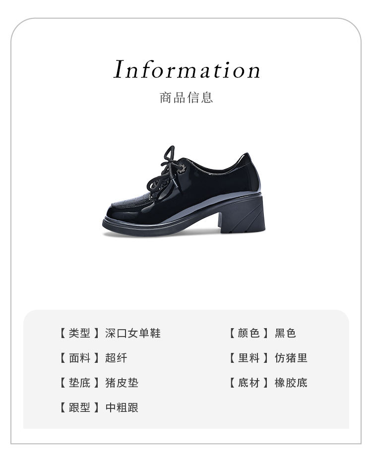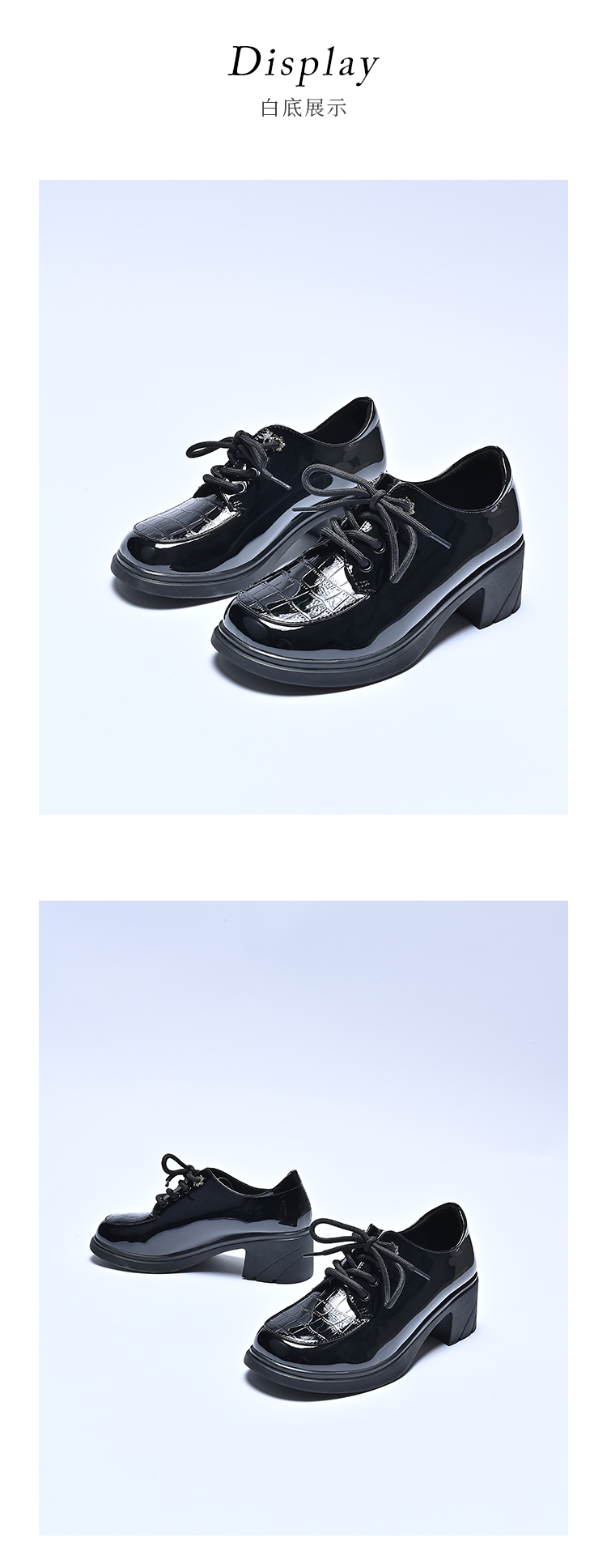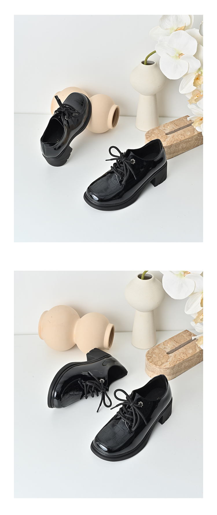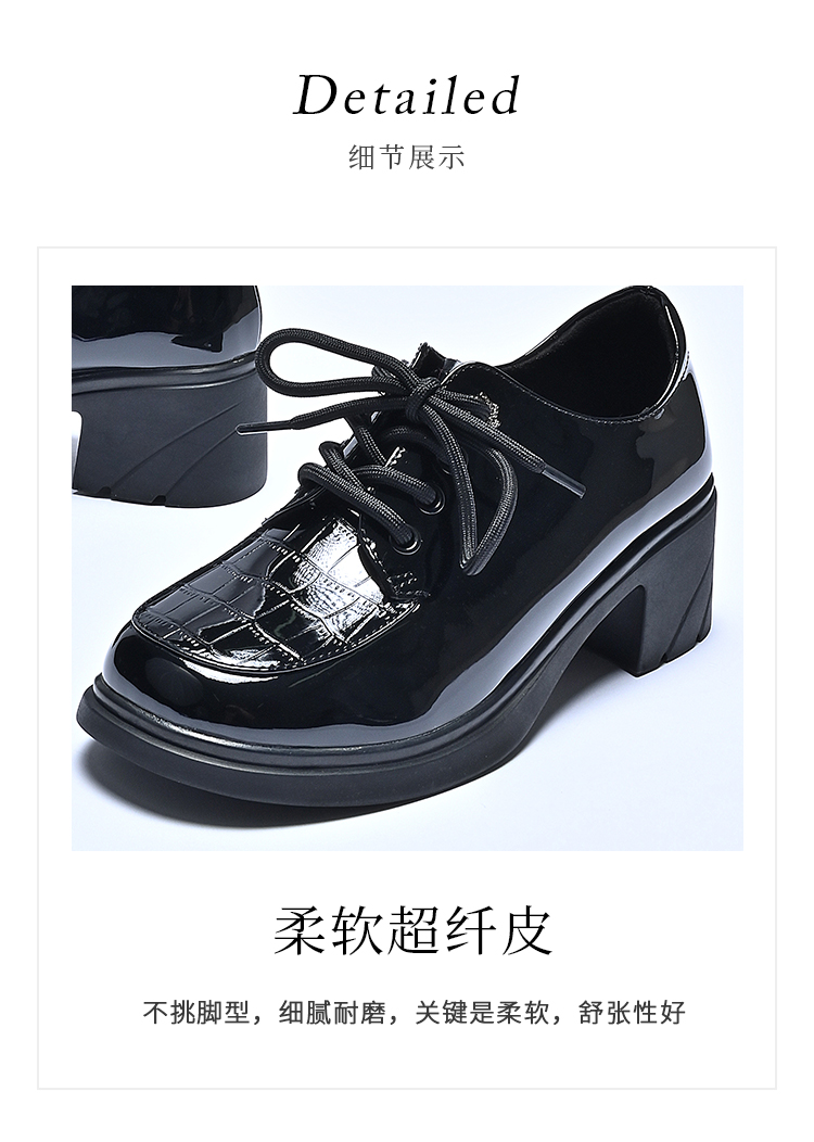 经典鲨2025秋专柜新品百搭黑色圆头鳄鱼纹中粗跟系带皮鞋女KC19-537251