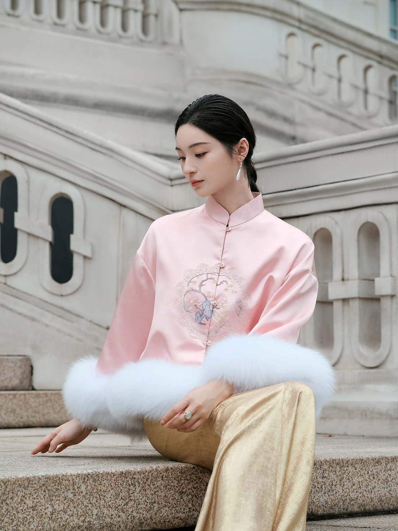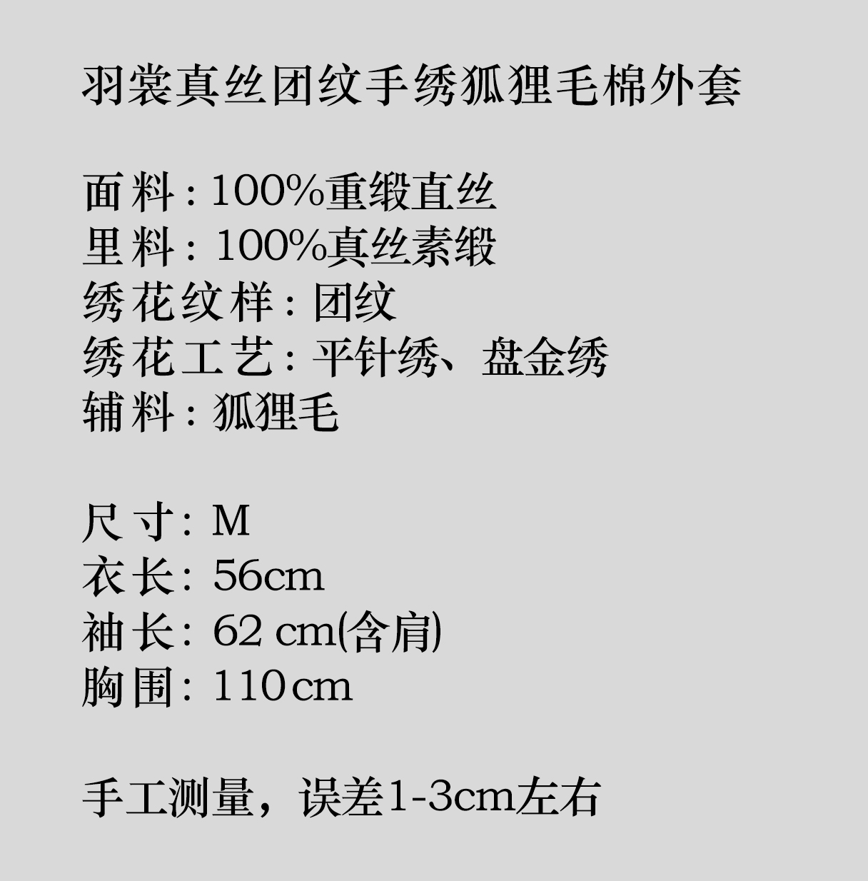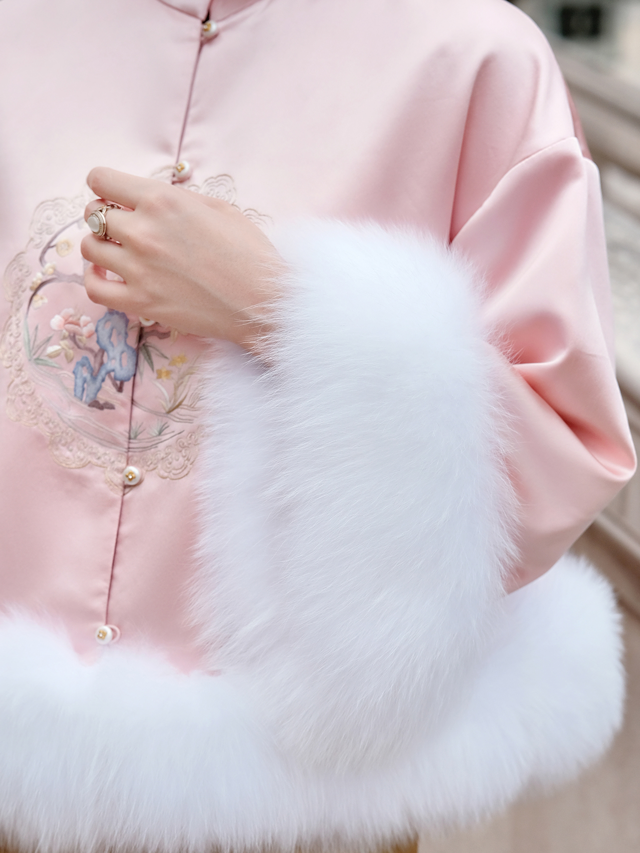 盛唐牡丹大师系列-卢梅红 | 羽裳真丝团纹手绣狐狸毛棉外套