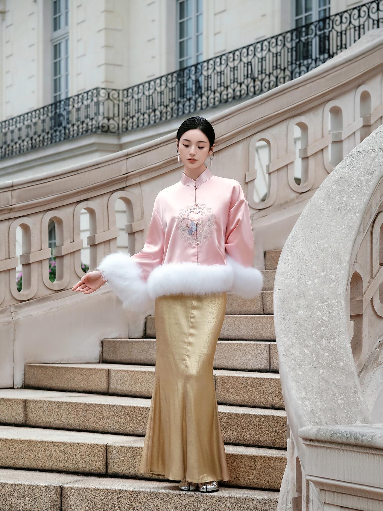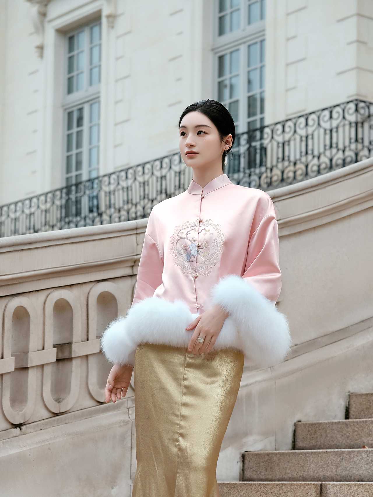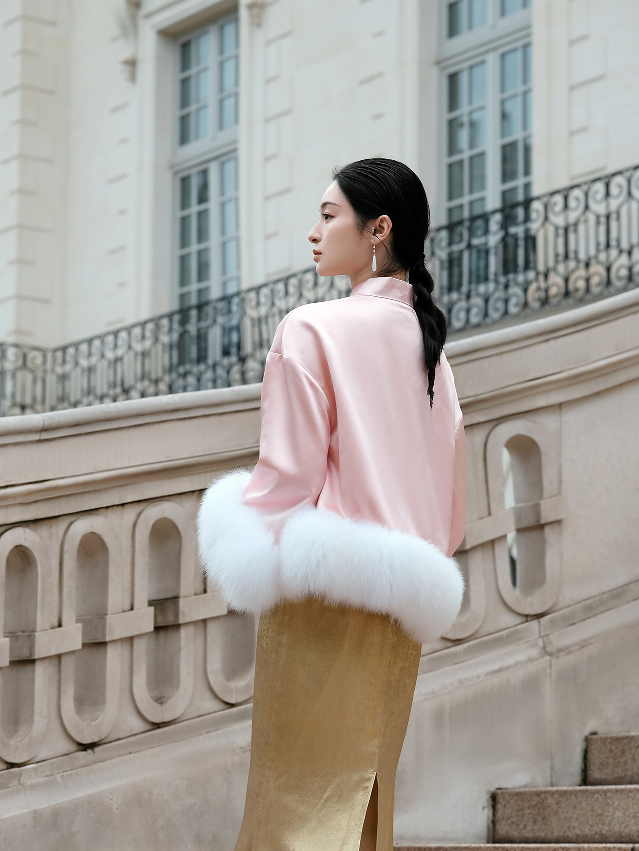 盛唐牡丹大师系列-卢梅红 | 羽裳真丝团纹手绣狐狸毛棉外套