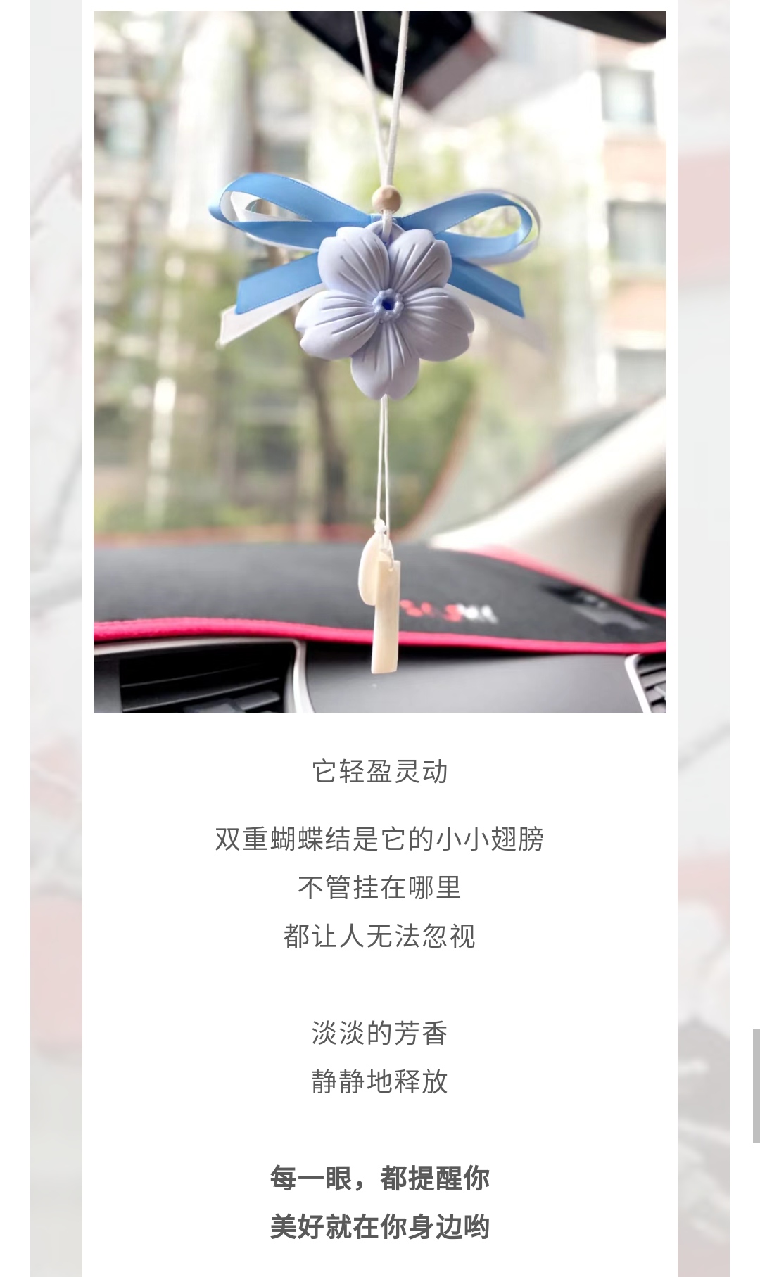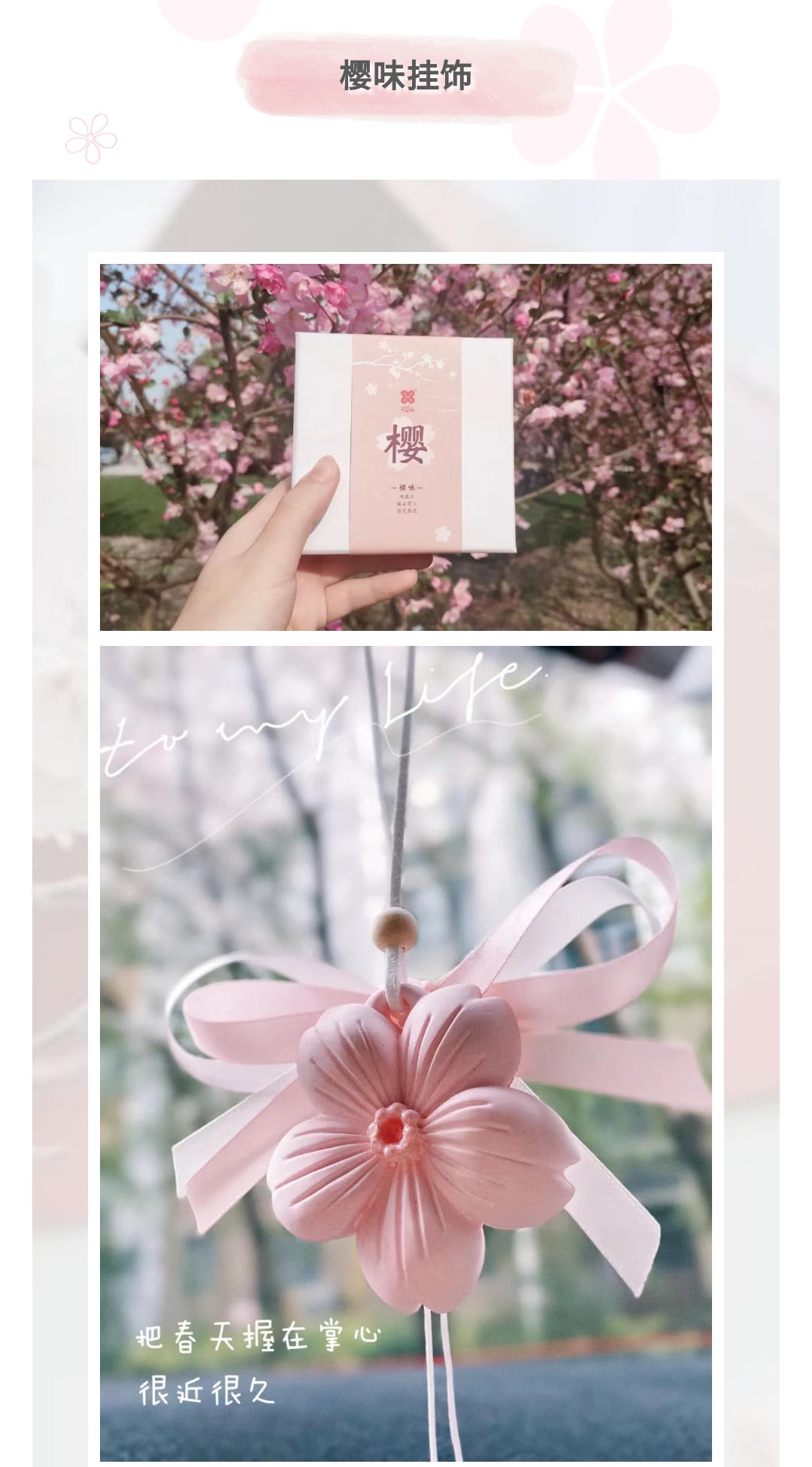 樱味挂件:樱花尺寸5.5*5.5cm,绳长22cm,礼盒10*10*cm,含蓝风铃味精油3ml