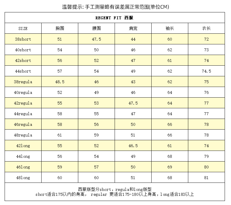此款分short,regula和long版型, short适合175以内的身高, regular 更适合175-180以上身高,long适合183以上