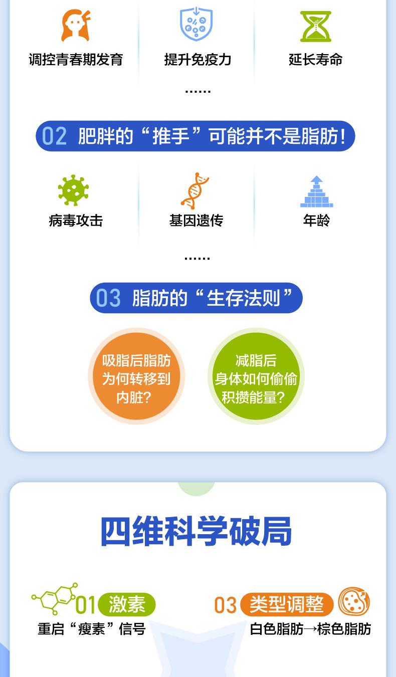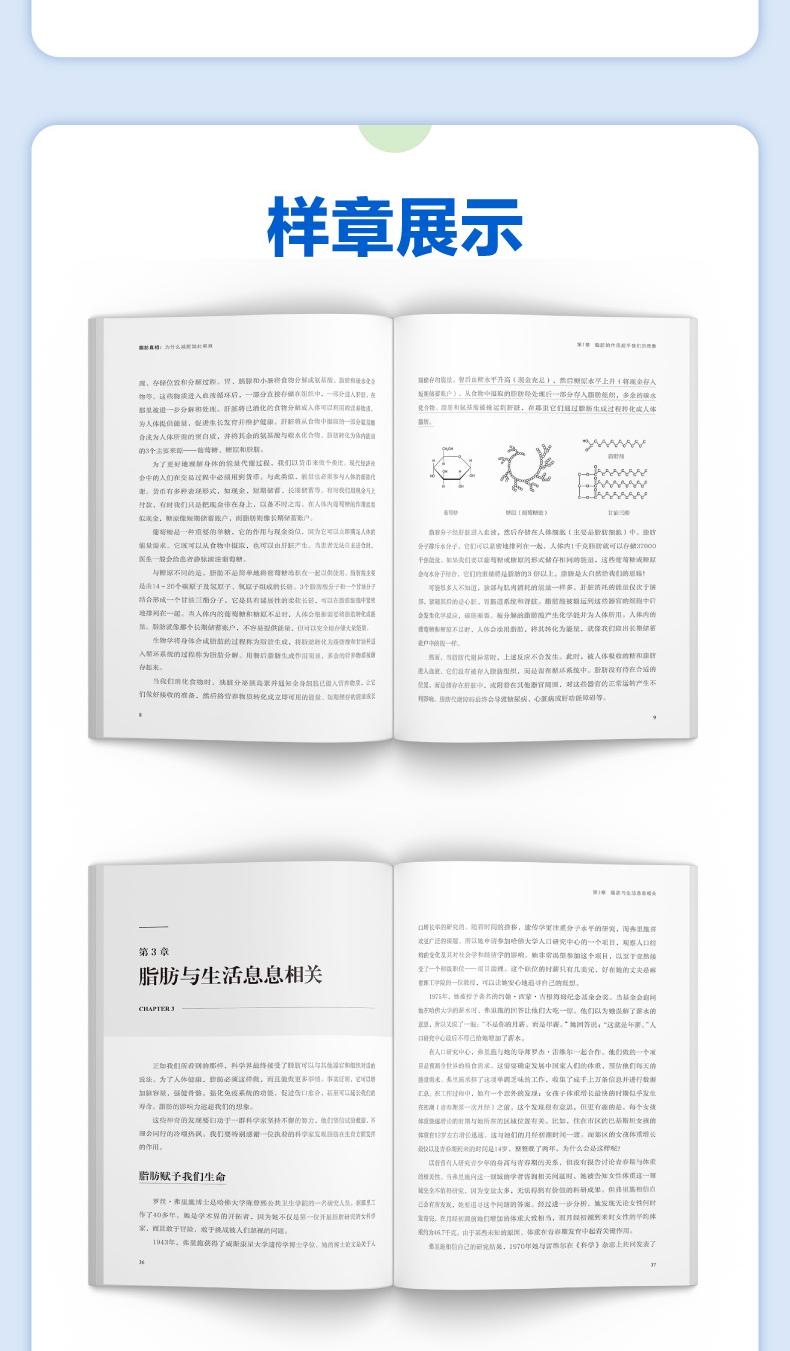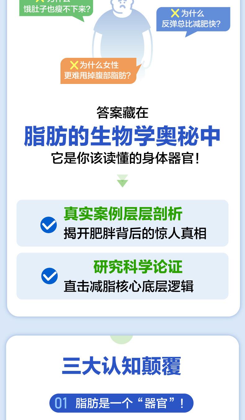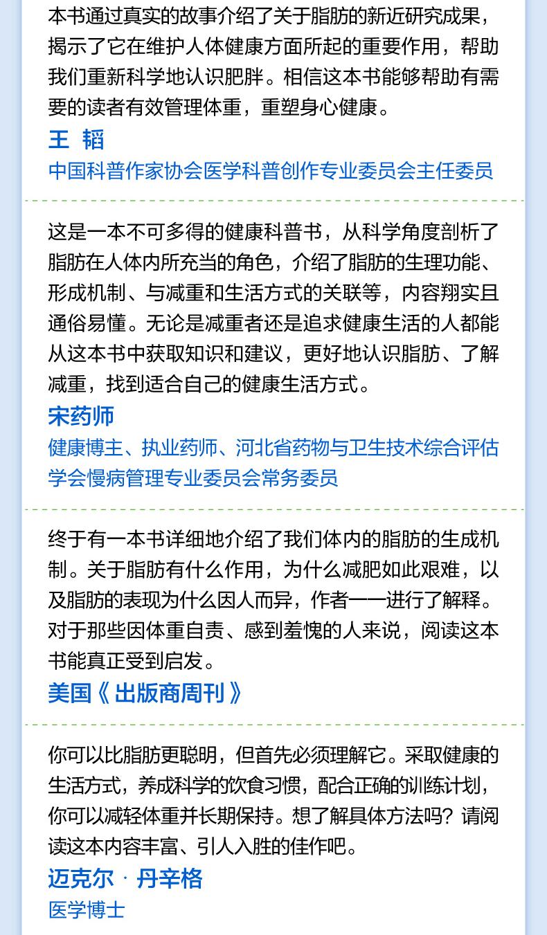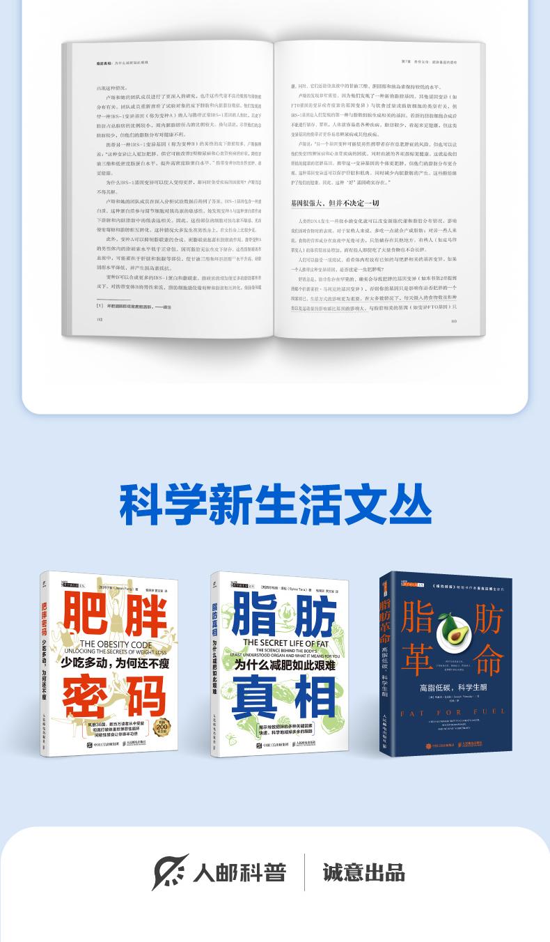 在当今社会,从未有哪个身体器官或者组织像脂肪那样令人厌恶,世界各地的人们*在千方百计地减少脂肪,并不惜为此投入大量时间和金钱,忍受节食和手术等带来的各种痛苦。胖人想减掉多余脂肪,瘦者希望更加苗条,似乎永无止境。 尽管如此,我们的身体却离不开脂肪。脂肪赋予我们生命,直接控制着青春期的启动,影响着生殖发育,参与新陈代谢,调节免疫系统,储存能量,保护人类健康。事实上,身体为了防止脂肪流失采用了多重防御机制,如脂肪可以利用干*,受到威胁时会增强我们的食欲,利用病毒、*和基因进行自我扩展。在本书中,作者依据新近研究成果,结合自身经历以及大量真实案例和故事,深入分析了脂肪作为内分泌器官对健康的重要影响,揭示了脂肪的运作机制,提供了减脂*的科学方法,为我们如何正确对待脂肪指明了方向。 希望你能从本书中有所收获。