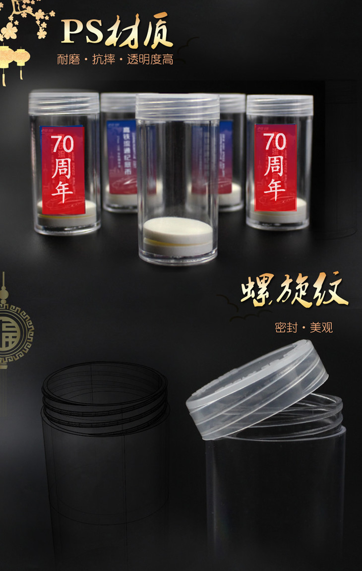 2、加厚PS材质更抗震抗摔,高透明展示藏品。采用圆形外观设计,适合硬币整卷连同卷纸一起放入,更起到了收藏方便的效果,而且更高档大方。每个卷筒附送海绵垫,可根据需要使用起减震作用。