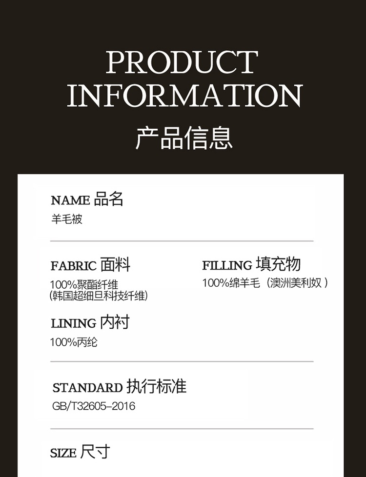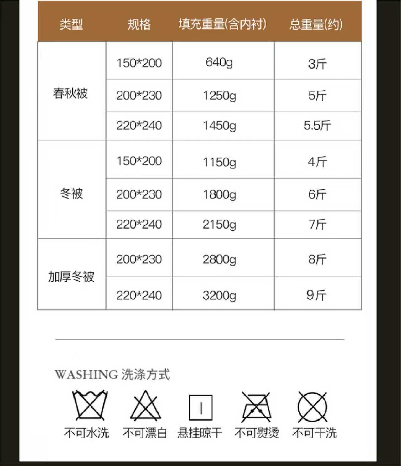 1、羊毛被下单规格为整被重量(填充+内胆套),您收到的被子水洗标上标注的实为羊毛填充物重量(不包括内胆套重量);