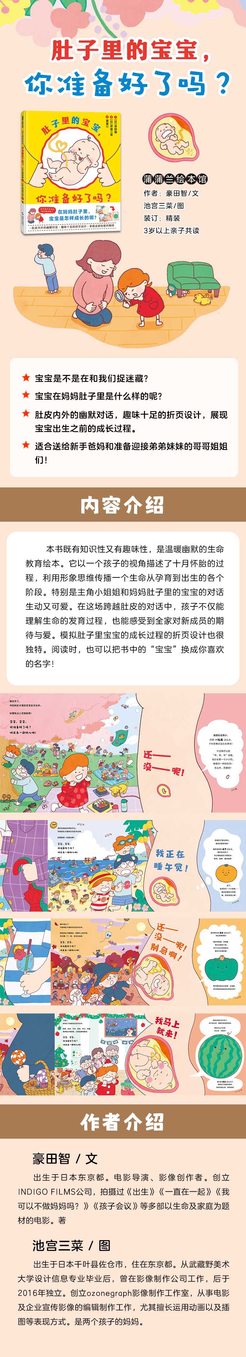本书既有知识性又有趣味性,是温暖幽默的生命教育绘本。它以一个孩子的视角描述了十月怀胎的过程,利用形象思维传播一个生命从孕育到出生的各个阶段。特别是主角小姐姐和妈妈肚子里的宝宝的对话生动又可爱。在这场跨越肚皮的对话中,孩子不仅能理解生命的发育过程,也能感受到全家对新成员的期待与爱。模拟肚子里宝宝的成长过程的折页设计也很独特。阅读时,也可以把书中的;宝宝换成你喜欢的名字!