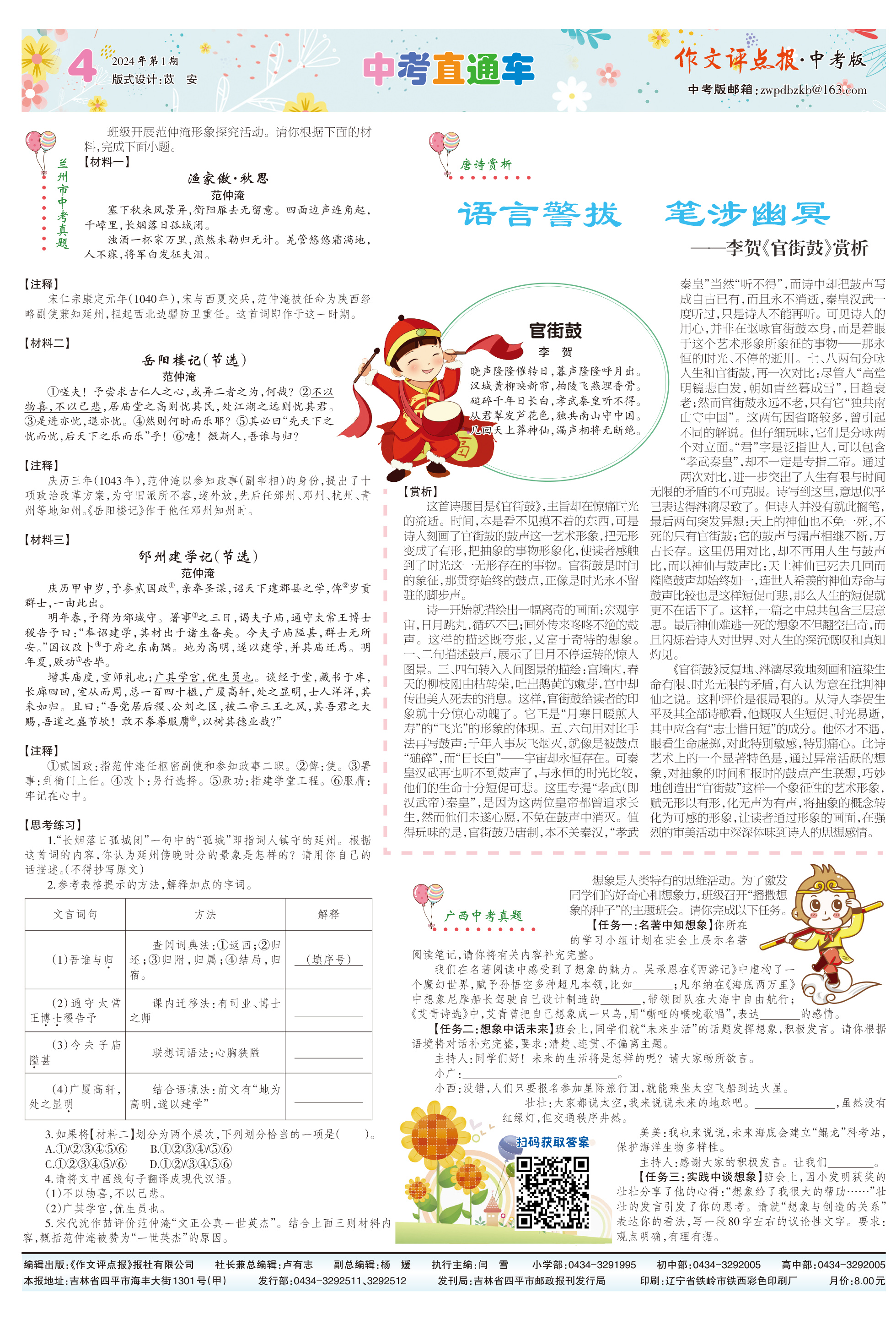 三、增值服务。订阅《作文评点报》,每月可获赠“作文支招”微课、作文素材包或中考、高考考前押题卷等,扫码获取。