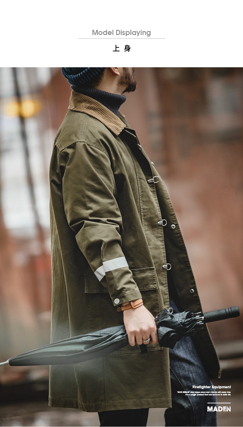 工装优选 美式复古中长款消防员风衣秋冬外搭过膝反光条大衣男外套