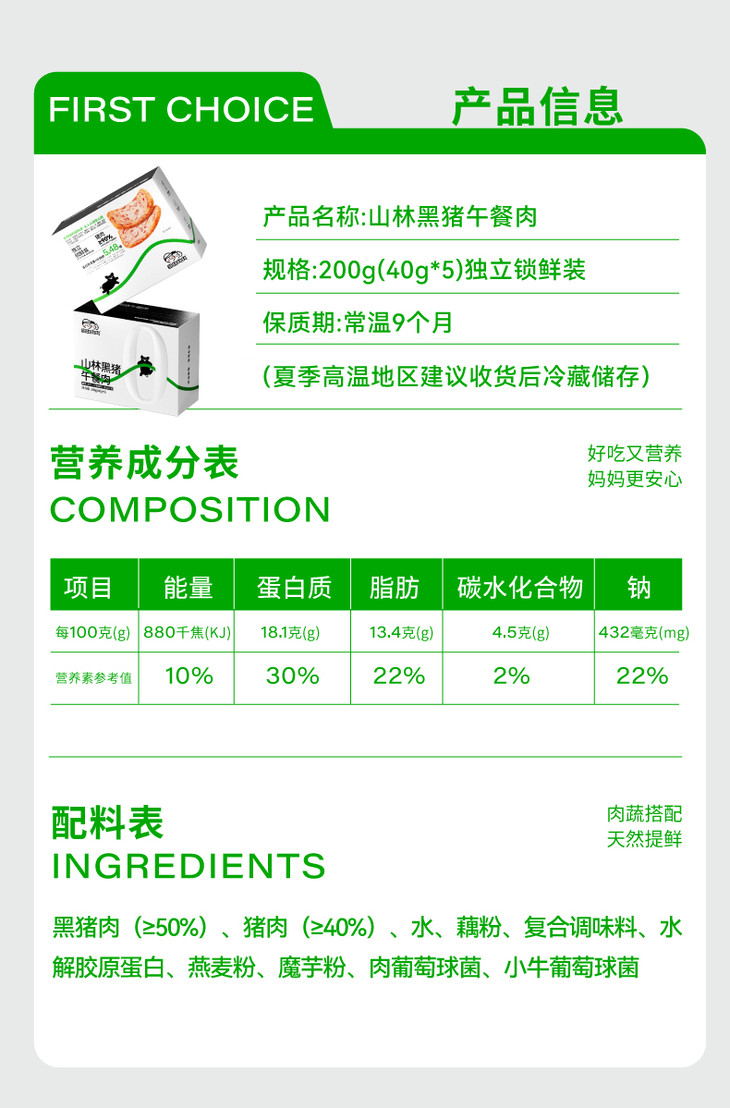 自由肉肉山林黑猪午餐肉,精选300天山林慢养的嘉兴黑猪作为核心原料。这种被誉为“国礼”的中国本土猪种,以其肉质鲜美、营养丰富而著称。养殖全程遵循自然规律,无激素、无抗生素、无重金属污染,确保每一口都是大自然的纯净馈赠。特别选用优质猪腿肉,以1.5:8.5的黄金肥瘦比,精心调配,既保留了猪肉的醇香,又避免了油腻感。