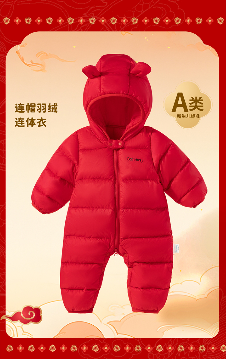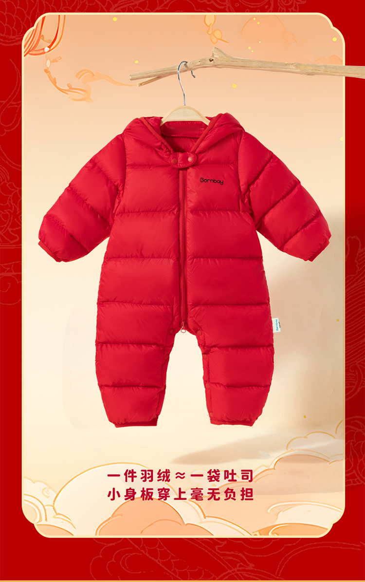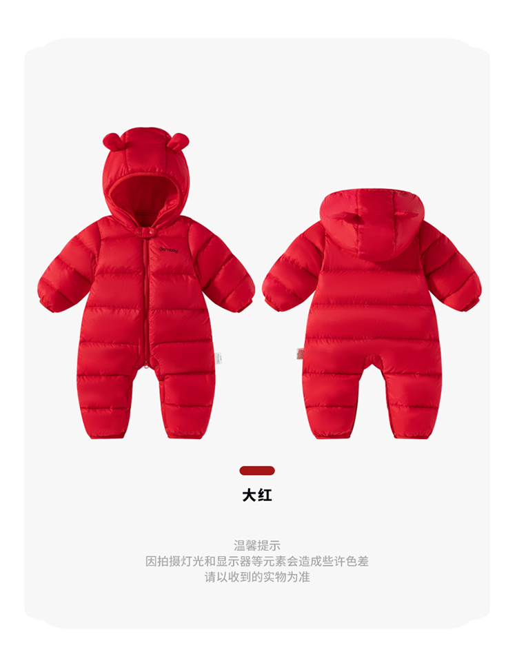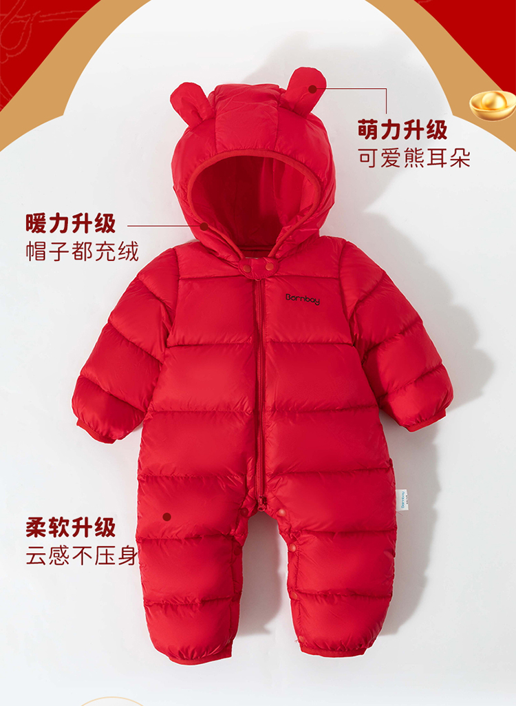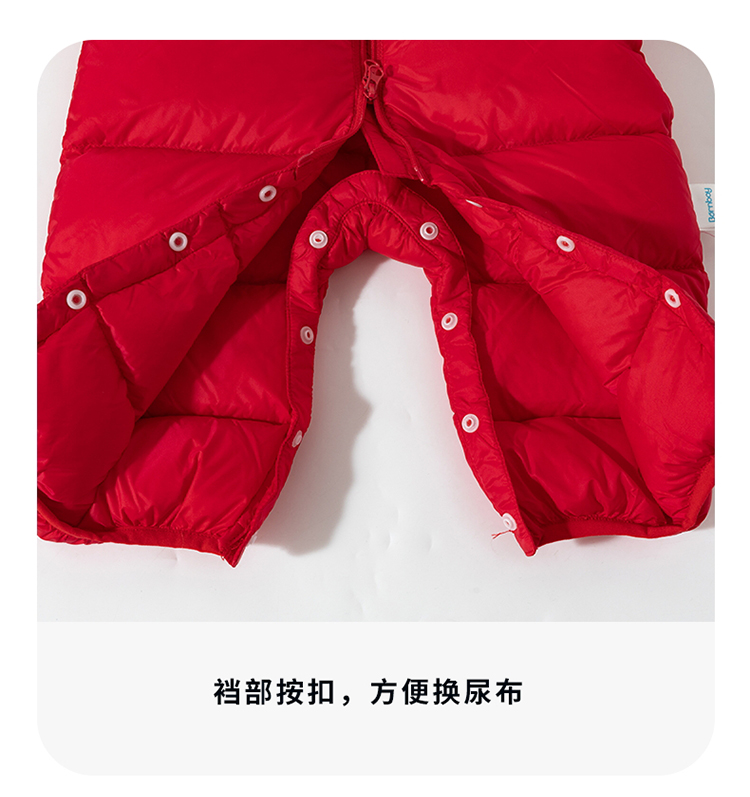 贝贝怡【防风轻暖】冬季新款男女宝宝羽绒连体衣大红哈衣新春拜年服ZB4DL075