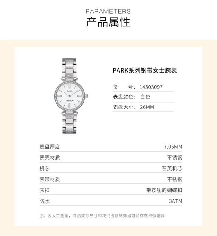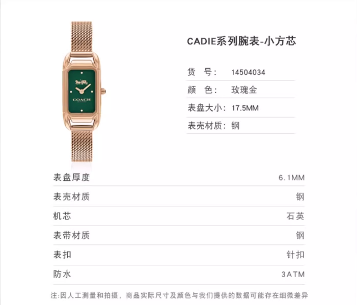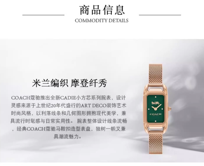 【品名】美国COACH蔻驰 CADIE系列复古小方表/PARK帕克系列小圆表 经典造型 皮带/钢带可选 石英表防水 一对一中检鉴定! 【尺寸】 小圆表:26-32mm表盘 小方表:17.5mm表盘 【产地】国内(美国品牌,中国代工) 【发货包装】独立包装盒 【发货地】浙江 【发货快递】中通 【不发货区域】港澳台 【补邮费地区】新疆、西藏,甘肃,宁夏,青海,内蒙古+15 【发货时效】48-72小时,周末节假日顺延 |