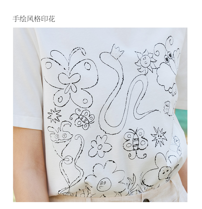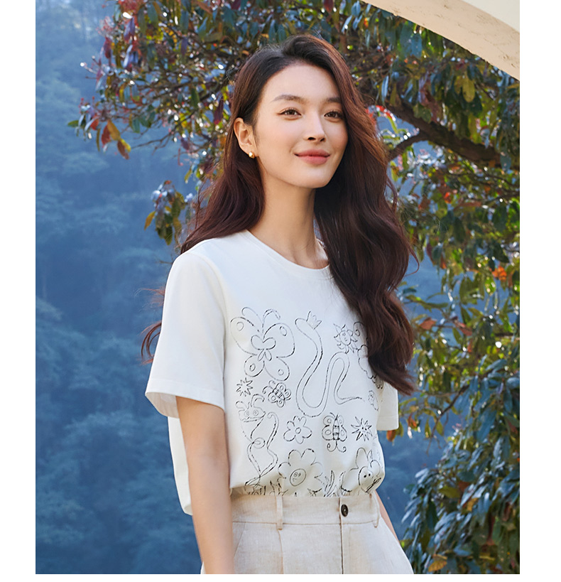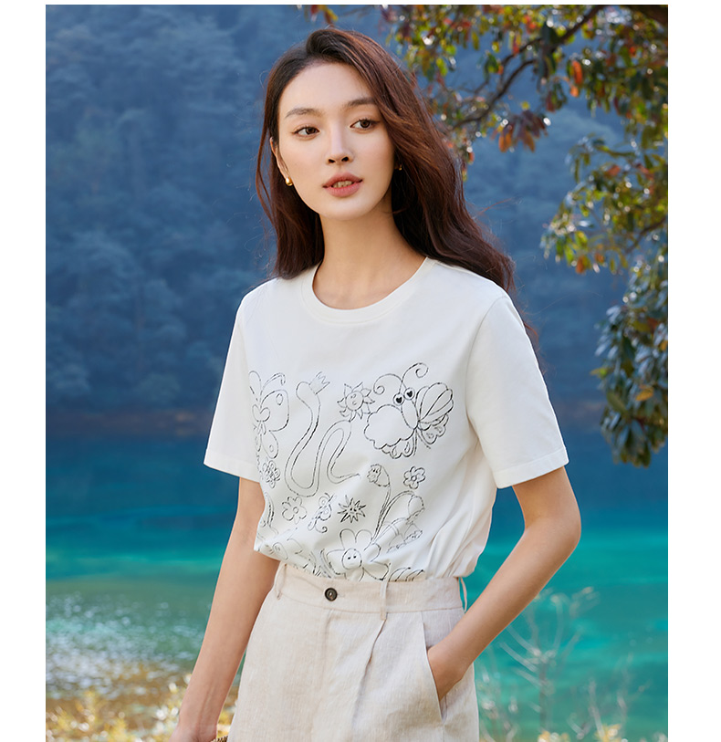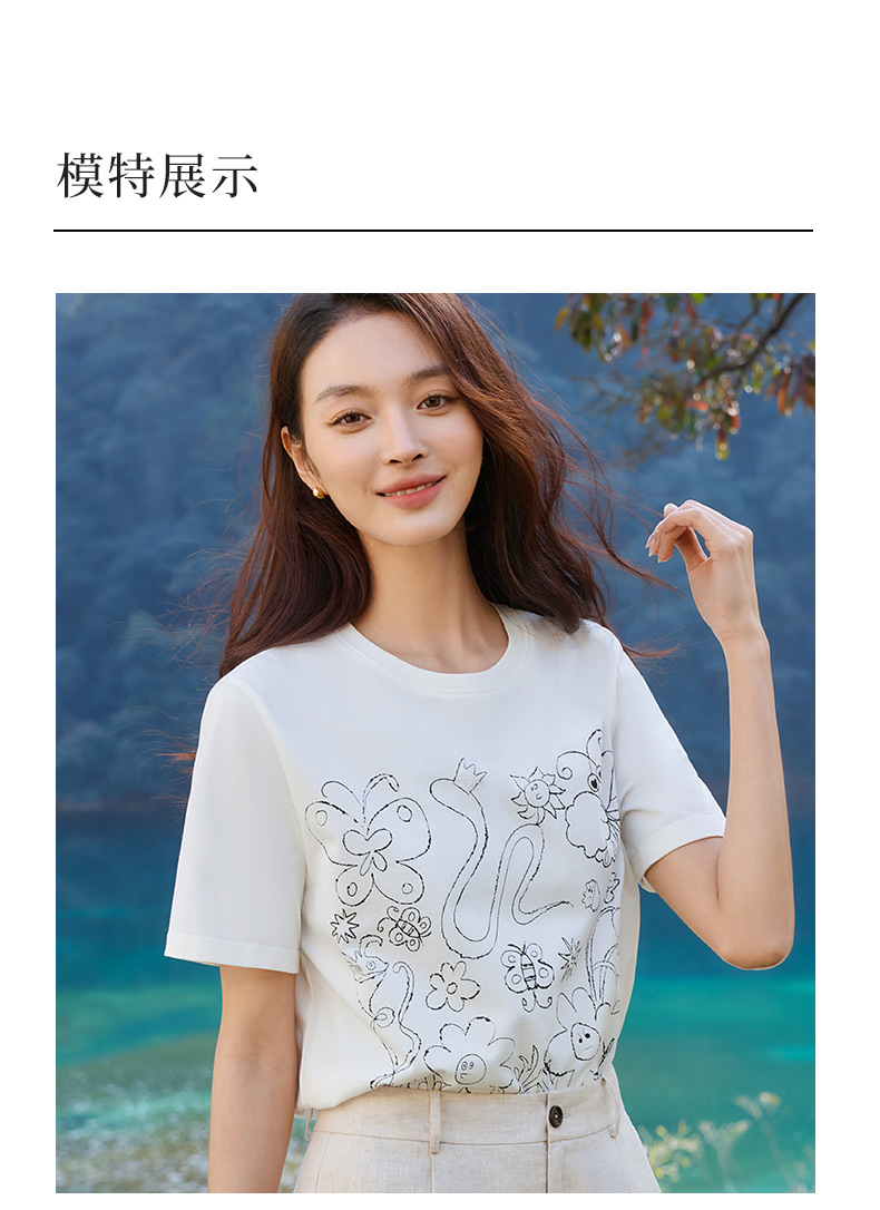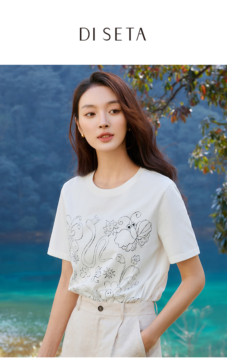 玳莎手绘风格印花T恤女2025年夏季新款时尚圆领通勤百搭短袖上衣 FB32108