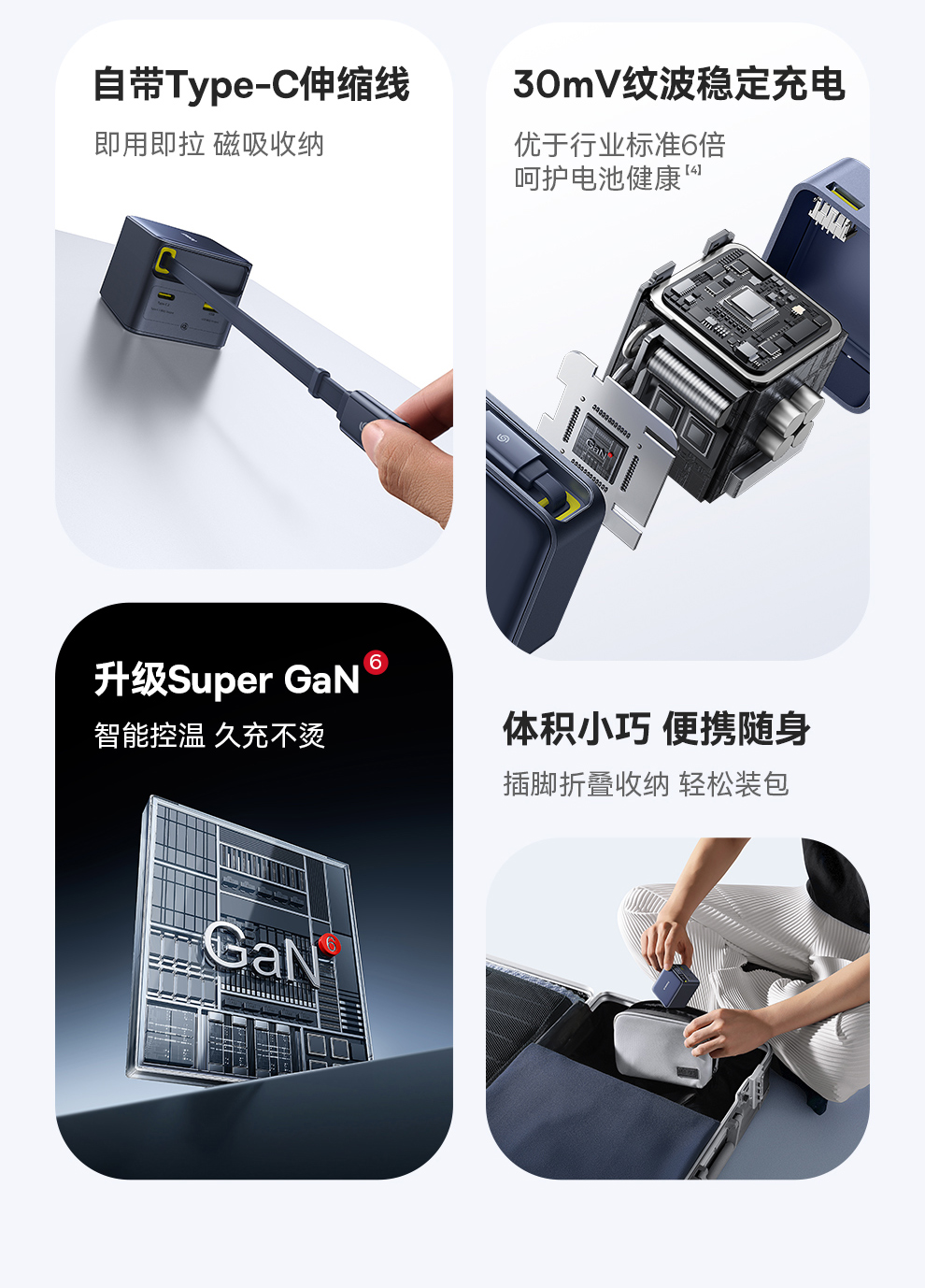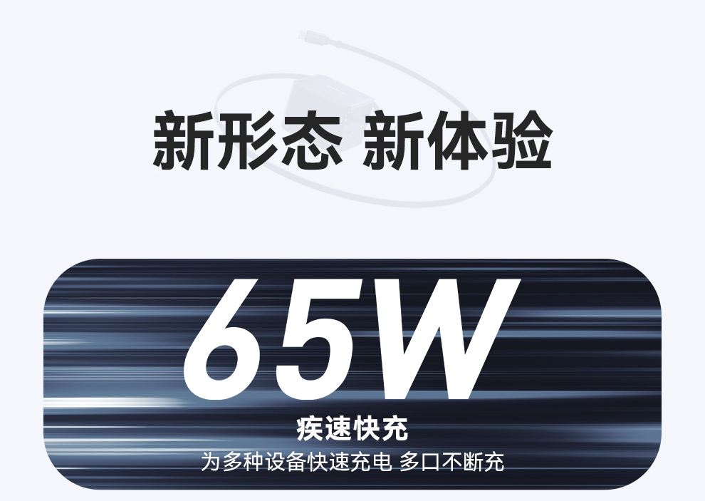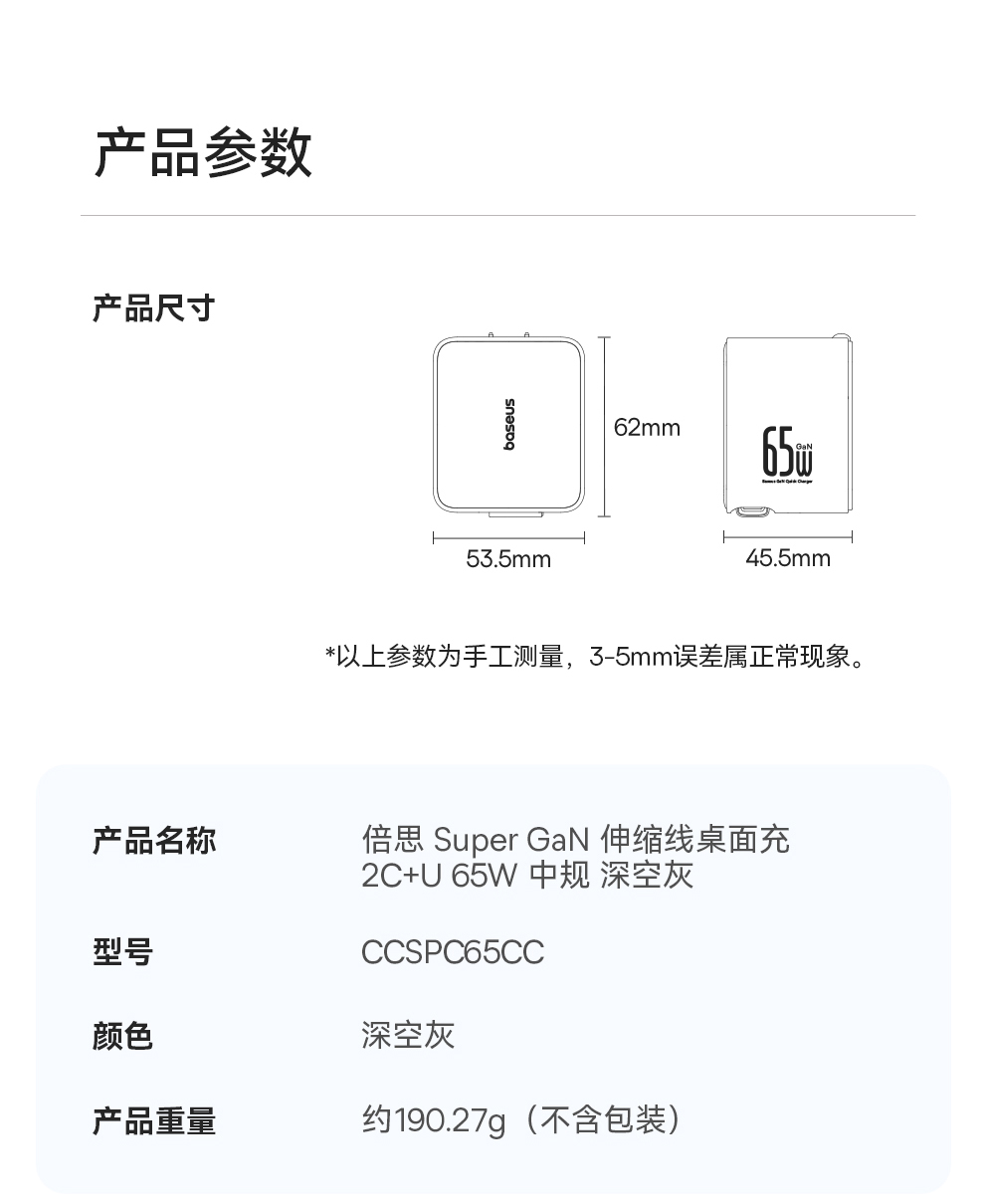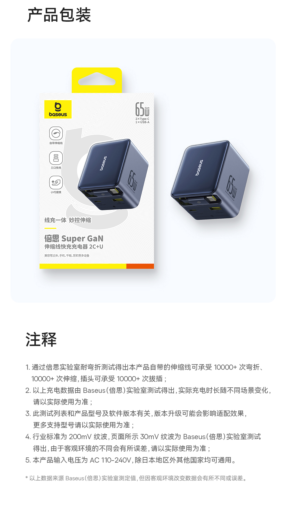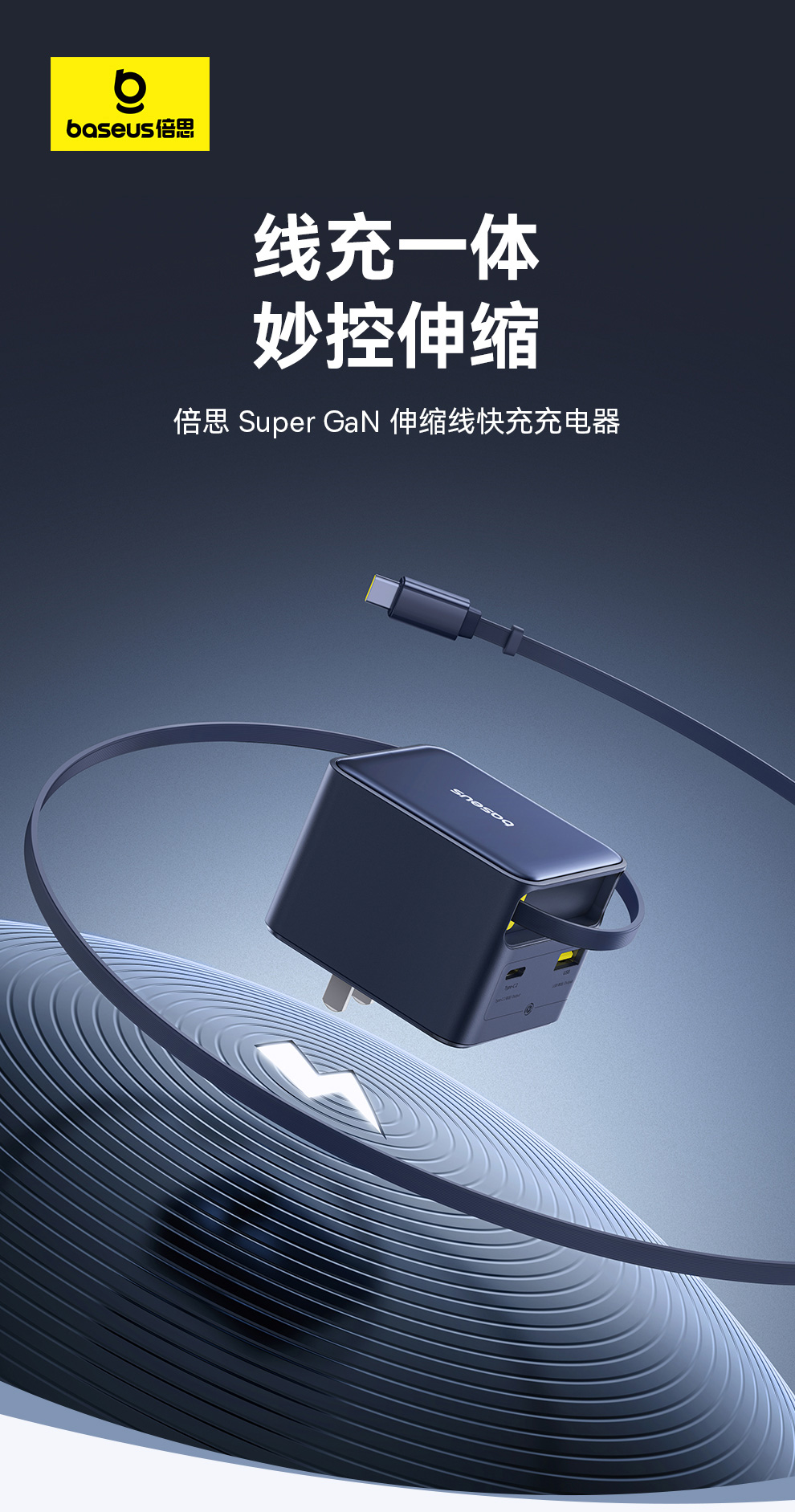 倍思 Super GaN 伸缩线快充充电器 2C+U 65W
