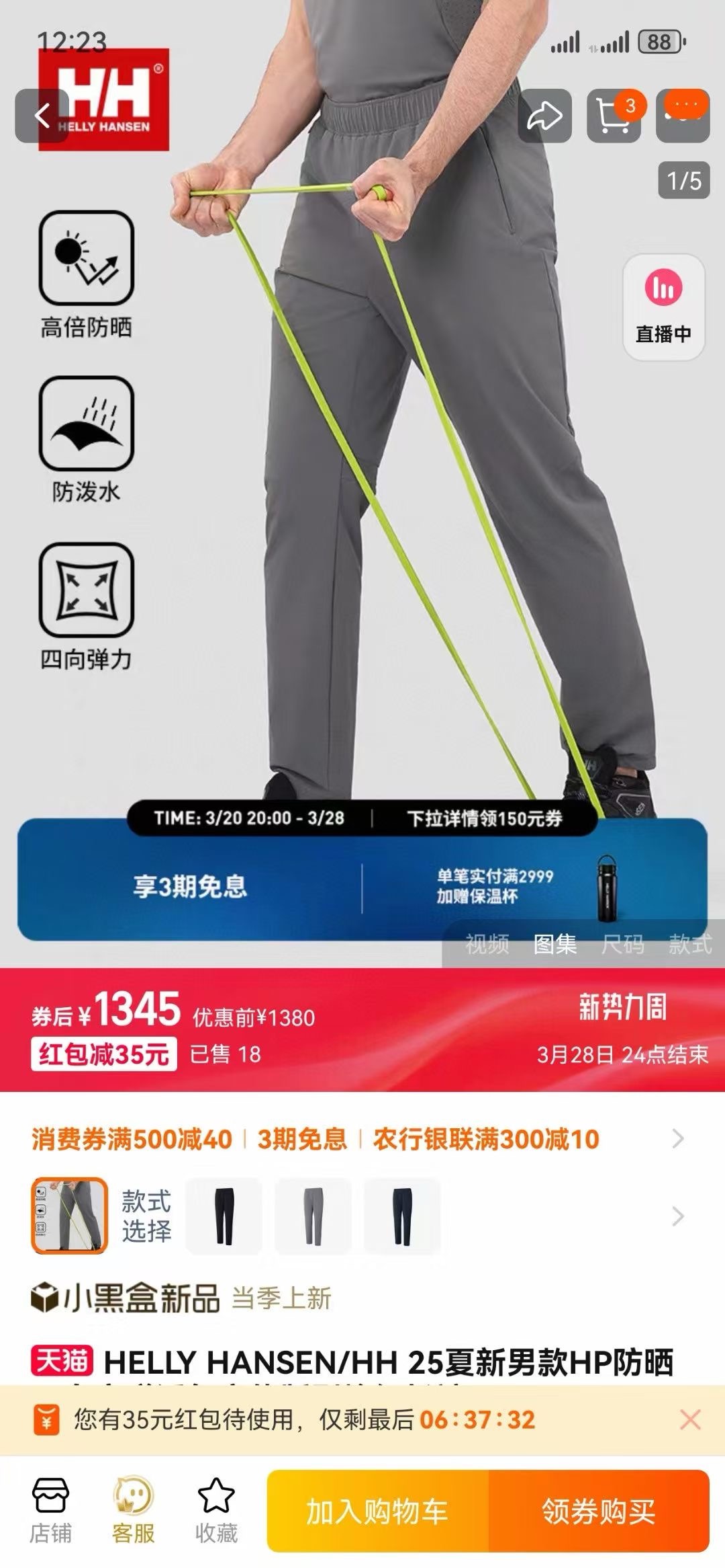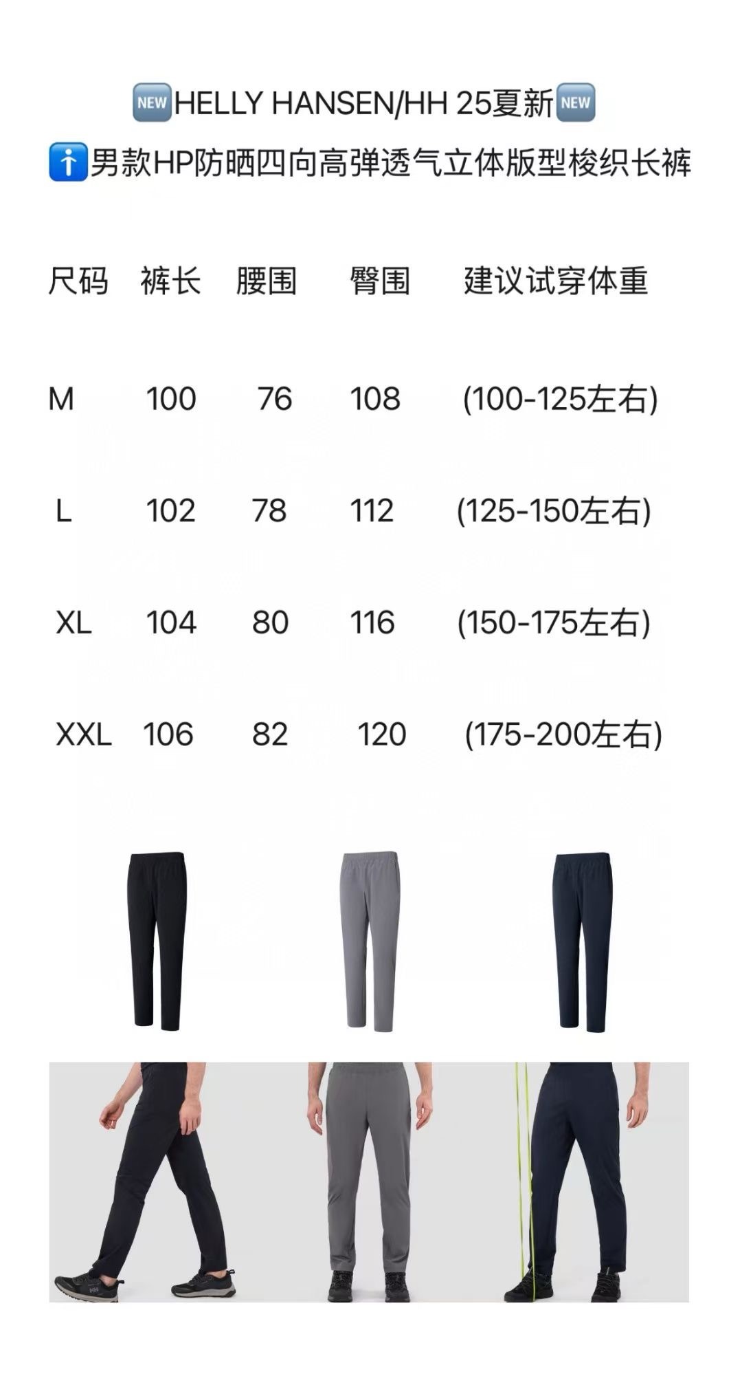 挪威国宝级户外品牌HELLY HANSEN/HH海丽汉森 25年夏新男款HP防晒四向高弹透气立体版型梭织长裤面料性能 防水防晒性能 具备高效防晒能力,如采用高紫外线阻隔率材质,可阻挡UVA和UVB,达到UPF50+甚至更高,提供360°全方位防晒保护。弹性表现 运用四向弹力面料,使穿着者在各个方向上都能感受到良好的拉伸性,活动自如,无论是运动还是日常活动都能保持舒适,不会有紧绷感。• 透气功能 可能采用镭射冲孔等设计,增加服装的透气性,让空气能够在衣物内外流通,快速排出湿气和热气,保持干爽舒适,避免闷热感。版型设计• 立体剪裁:依据人体工程学原理进行立体裁剪,贴合人体曲线,例如后臀立体切割,能够改善臀部线条,不仅穿着舒适,还能展现出良好的身材比例,提升整体造型效果。