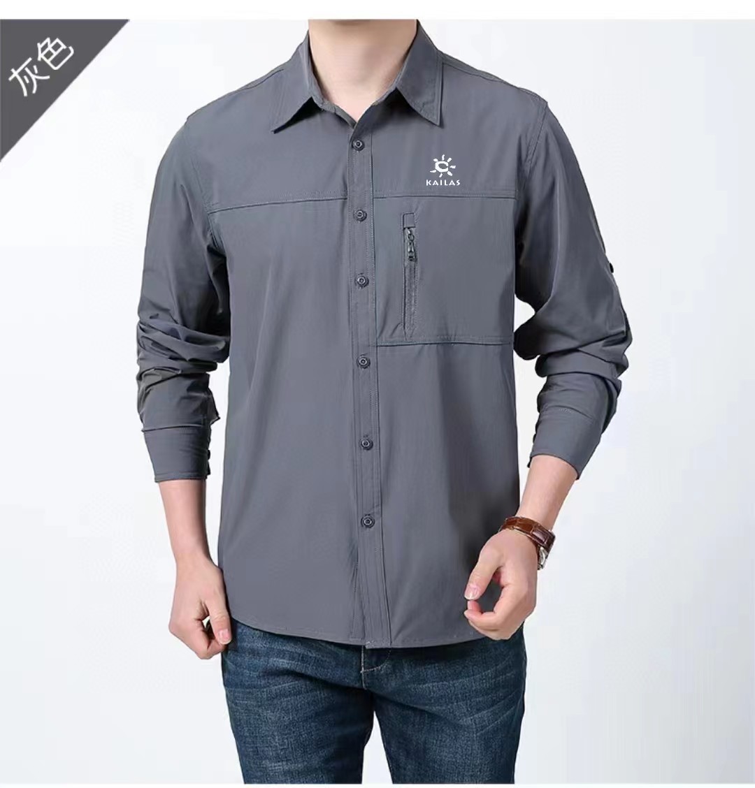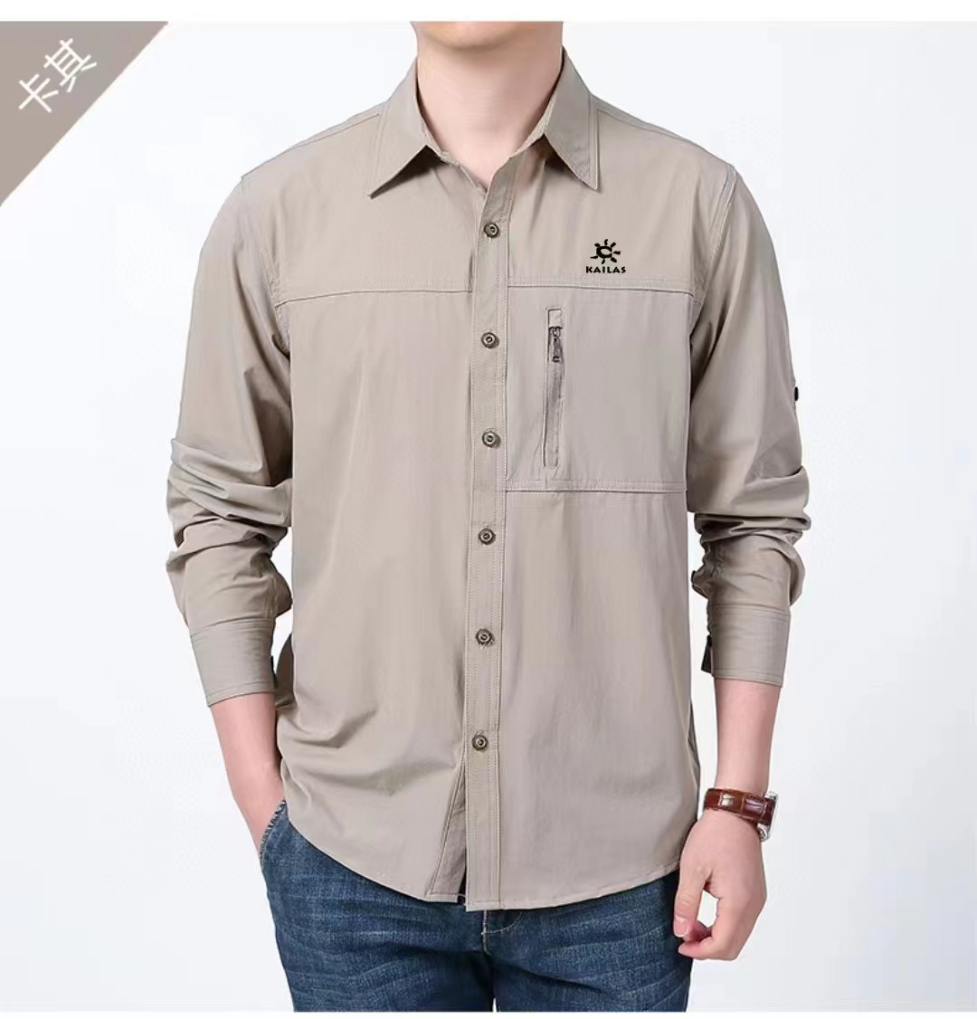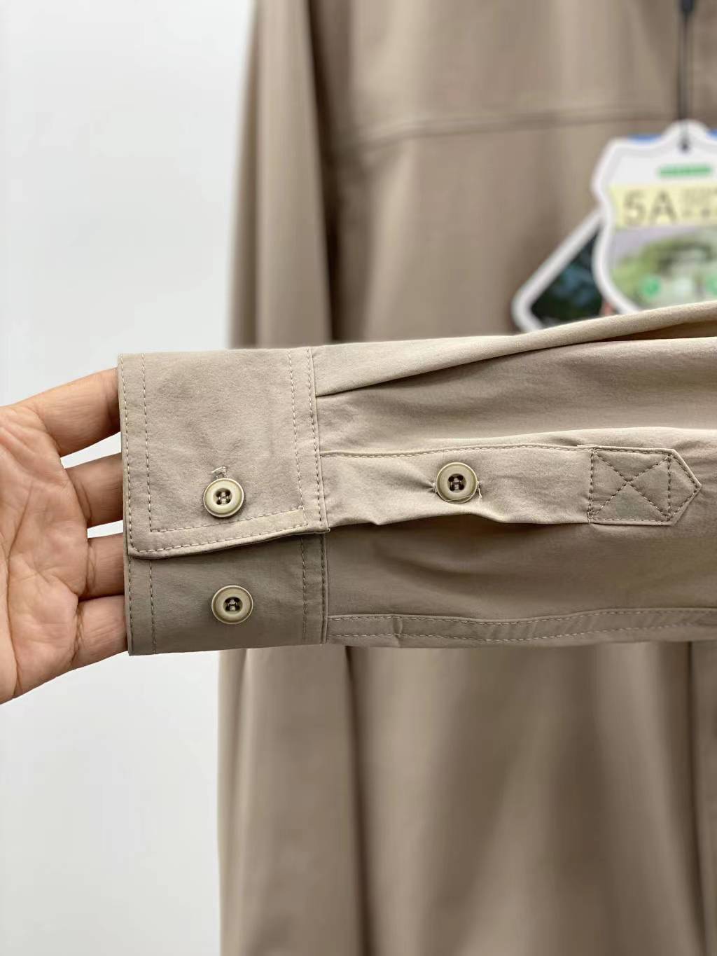 夏季冰丝弹力薄款速干工装防水防晒防蚊PL0L0衫长袖衬衫防晒衣。户外防晒防蚊速干长袖衬衫 适合户外露营 徒步登活动!!一款技术含量高、比较耐用的多用途衬衫。功能设计比较实用,版型独特又好看,既能休闲穿搭也能户外徒步,优秀。采用改进型耐撕裂织物与生物基纱线织物制成。技术设计上能经得起不少户外环境考验,紧密编织结构意味着它具备更快干燥速度,这样出汗后不容易粘在你的皮肤上。而且这种致密结构,蚊子不容易穿透叮咬进入你的皮肤。穿起来柔软相对静音,既可以作为精典的徒步旅行功能快干衣,又可以当做城市的日常休闲使用。该衬衫具备两个纵向拉链胸袋,可额外竖起的纽扣领设计(可用于挡风与颈部区域的额外防晒),同时袖子可卷起的隐藏设计,以及更安全。
